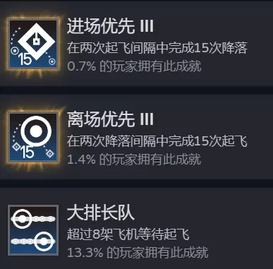 笔者选择在雪城刷这三个成就,你也可以选择别的比较简单的地图。比较稳妥的做法是拿到3-4个盘旋点,7-8个等待区。 1. 后期等待区飞机会自然大排队,看到等待区有4架飞机左右时开始往盘旋点存要降落的飞机。 2. 由于降落的飞机都被存进了盘旋点,等等待区排队8架飞机拿到成就【大排长队】,此时开始清空等待区,飞机圆形碰撞区相切即可放飞,连续放飞15架飞机即可完成成就【离场优先III】。 3.清空等待区后放盘旋飞机入场,加上后方自然入场的飞机,双跑道入场完成入场优先III。此技巧不仅适用于刷成就,也是游戏后期重要的管理技巧,刷高分必备。如果前期出现拥堵,也可先用此技巧过渡到后期再刷。注意不要贪多,看到即将出现问题时需及时操作。