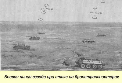 这是摩托化步兵和坦克部队(分队)的协同行动,目的是利用火力打击的成果(参见第1点)歼灭敌人并夺取其占领的领土。 坦克发挥主要作用,为摩托化步兵分队开辟道路,以火力和装甲为其提供掩护。摩托化步兵则协助消灭反坦克武器。坦克部队与摩托化步兵部队需进行紧密且持续的协同作战。应在主要方向上提高进攻兵力密度,即避免将兵力沿整个战线分散(每公里战线的坦克和摩托化步兵营数量)。 部队需迅速进入敌方火力打击区域,即紧随炮兵(航空)支援部队推进。摩托化步兵分队攻击情况: 1. 摩托化步兵分队对步兵战车的攻击 适用于以下情况: a) 在突破地段和主要攻击方向上,敌方大部分反坦克武器(反坦克导弹)被摧毁后,其防御可被轻武器有效打击。 2.摩托化步兵分队徒步进攻适用于以下情况: a) 敌方预先准备好防御时, b) 敌方处于设防区域时, c) 我方火力打击手段不足时, d) 地形起伏较大(峡谷、沟壑)时, e) 敌方坦克和步兵战车难以通行的地形(森林、城市)时。突击线应尽可能靠近敌方防御前沿,通常部署在能躲避机枪和反坦克武器火力的位置。 摩托化步兵分队人员紧随坦克战斗队形直接向敌人发起攻击。步兵战车在己方攻击步兵分队之后行动,或直接编入其战斗序列。 3. 机动