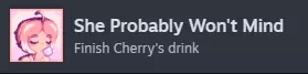 她可能不会介意 与桌旁的切丽交谈后,坐到你原本座位对面的位置,继续喝切丽的饮料直到喝完。