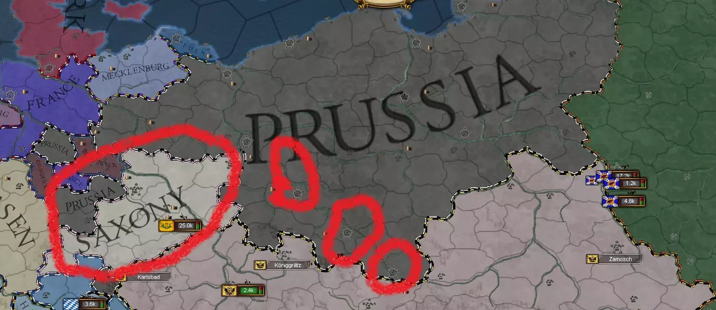 战争 初期几场战争应针对普鲁士,若运用我所展示的战术,你定能取胜。 目标应为格莱维茨、布雷斯劳、格洛高,并让萨克森加入你方。最好分多次战争进行。记住军团系统,除非对手是小国,否则切勿分兵。
