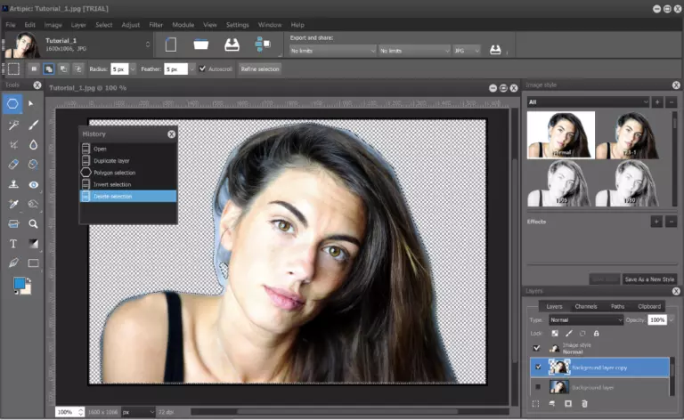 第一步 使用选择工具(多边形选择工具)勾勒肖像轮廓,将半径和羽化值设为较小数值(也可都设为0,这样效果更接近拼贴画)。然后反转选区(菜单>选择>反转选区)并删除背景。