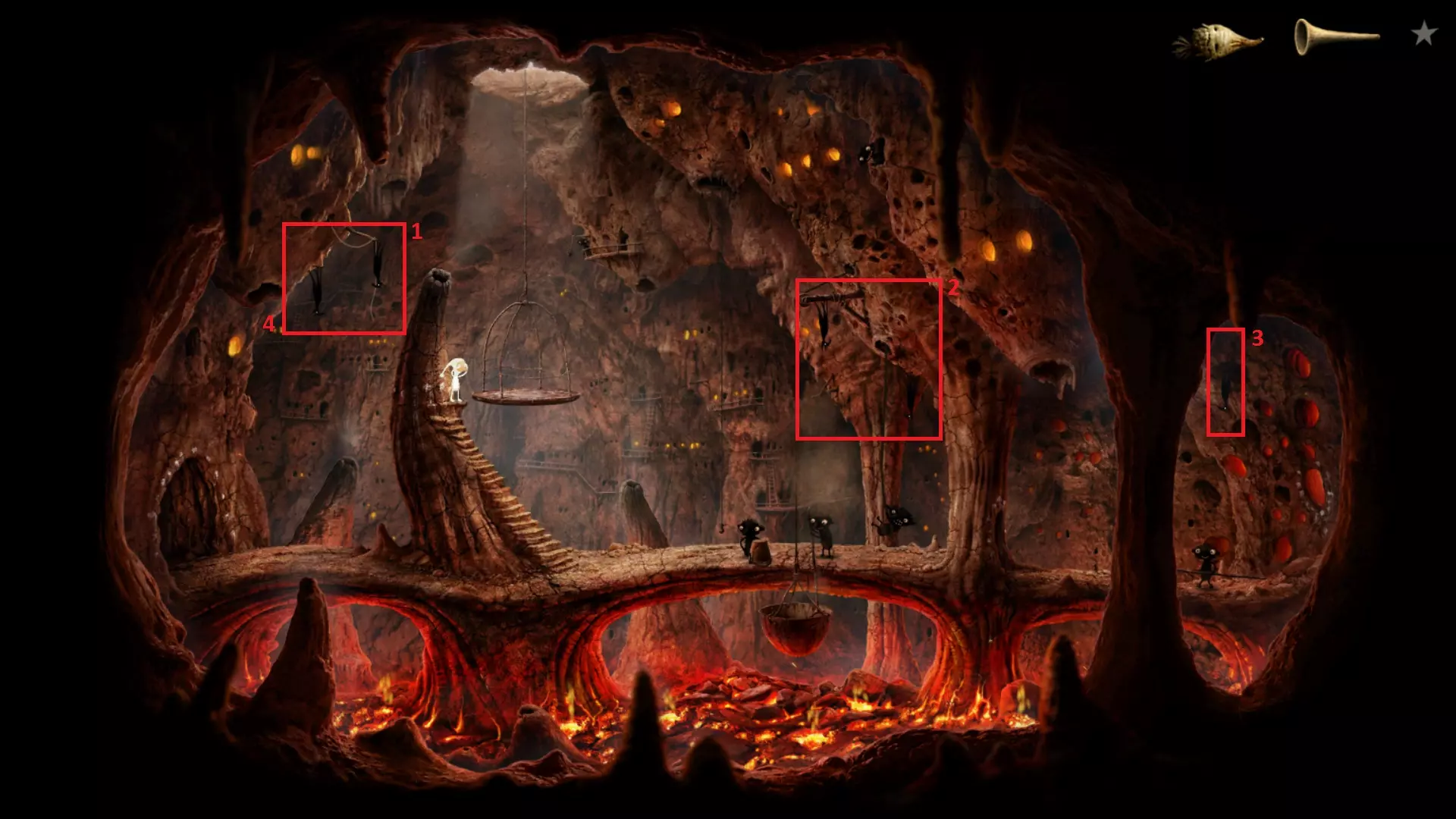 隐藏成就。先唤醒第一对蝙蝠(1),接着唤醒第二对(2),然后唤醒最后一只蝙蝠(3)。回到第一对蝙蝠处,让它们再次飞起来(4)。如果所有蝙蝠同时在空中,你就能获得该成就。补充:你可以跳过第一步,正确的顺序只需2→3→4。