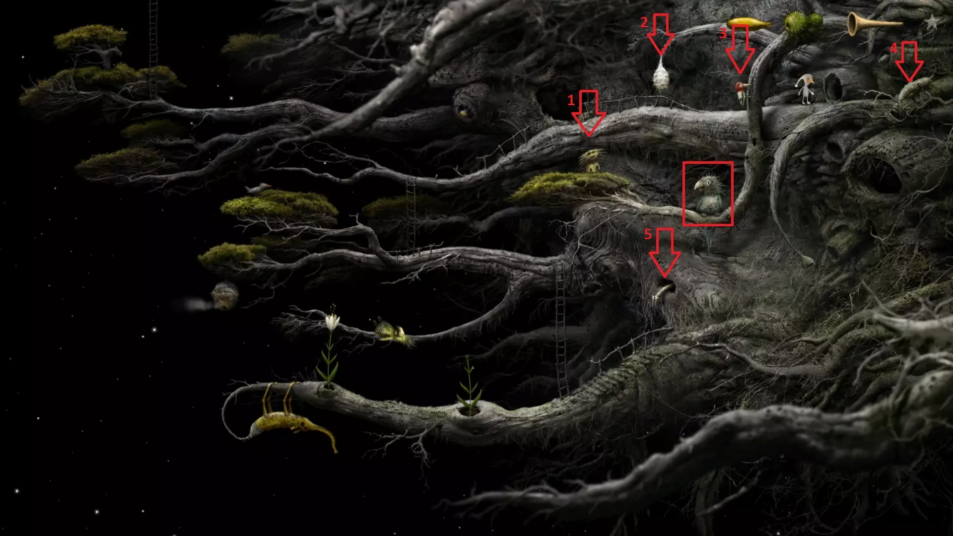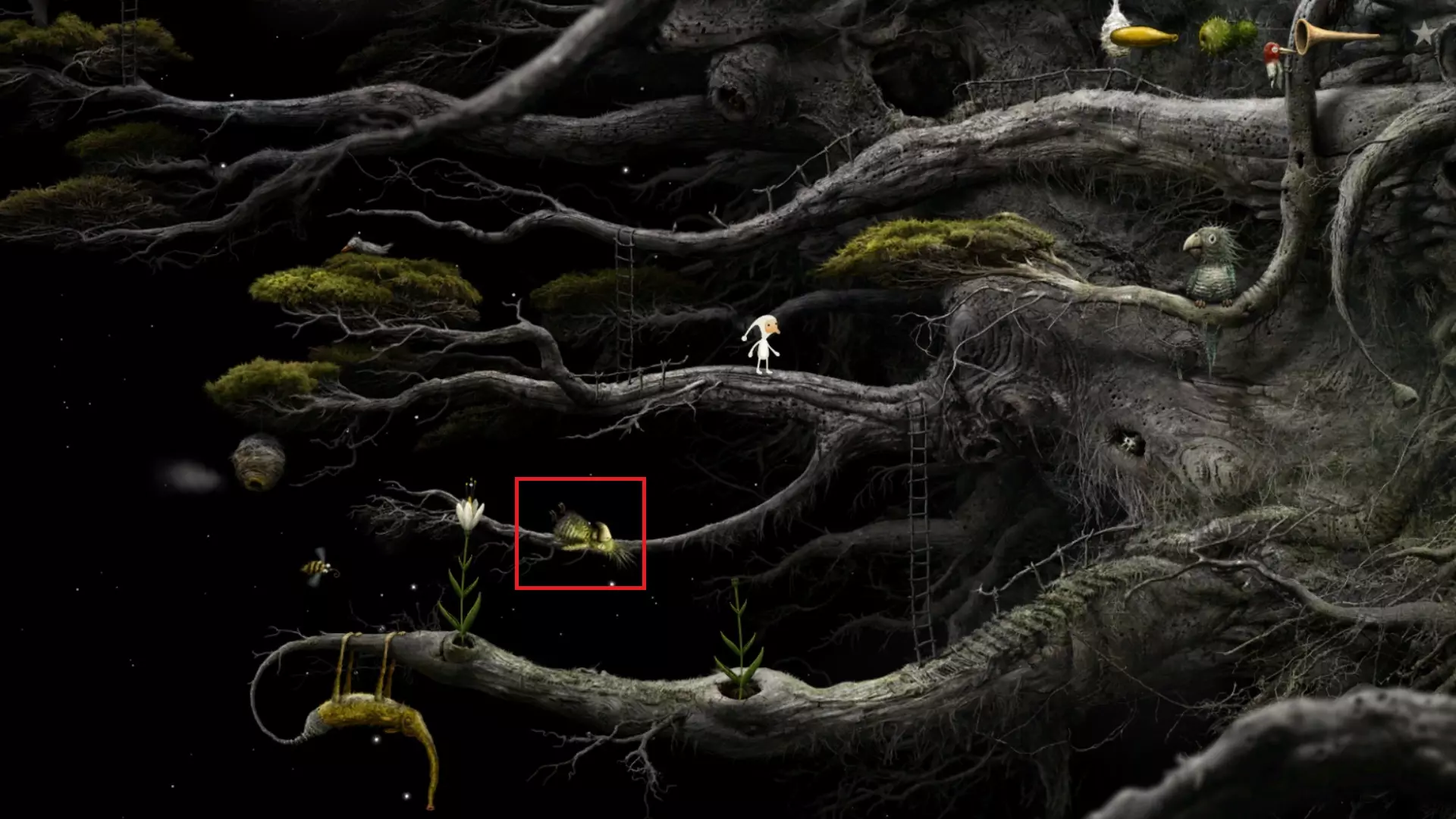 秘密成就。等待啄木鸟落在中间的平台上并点击它。木虫会出来追逐啄木鸟。