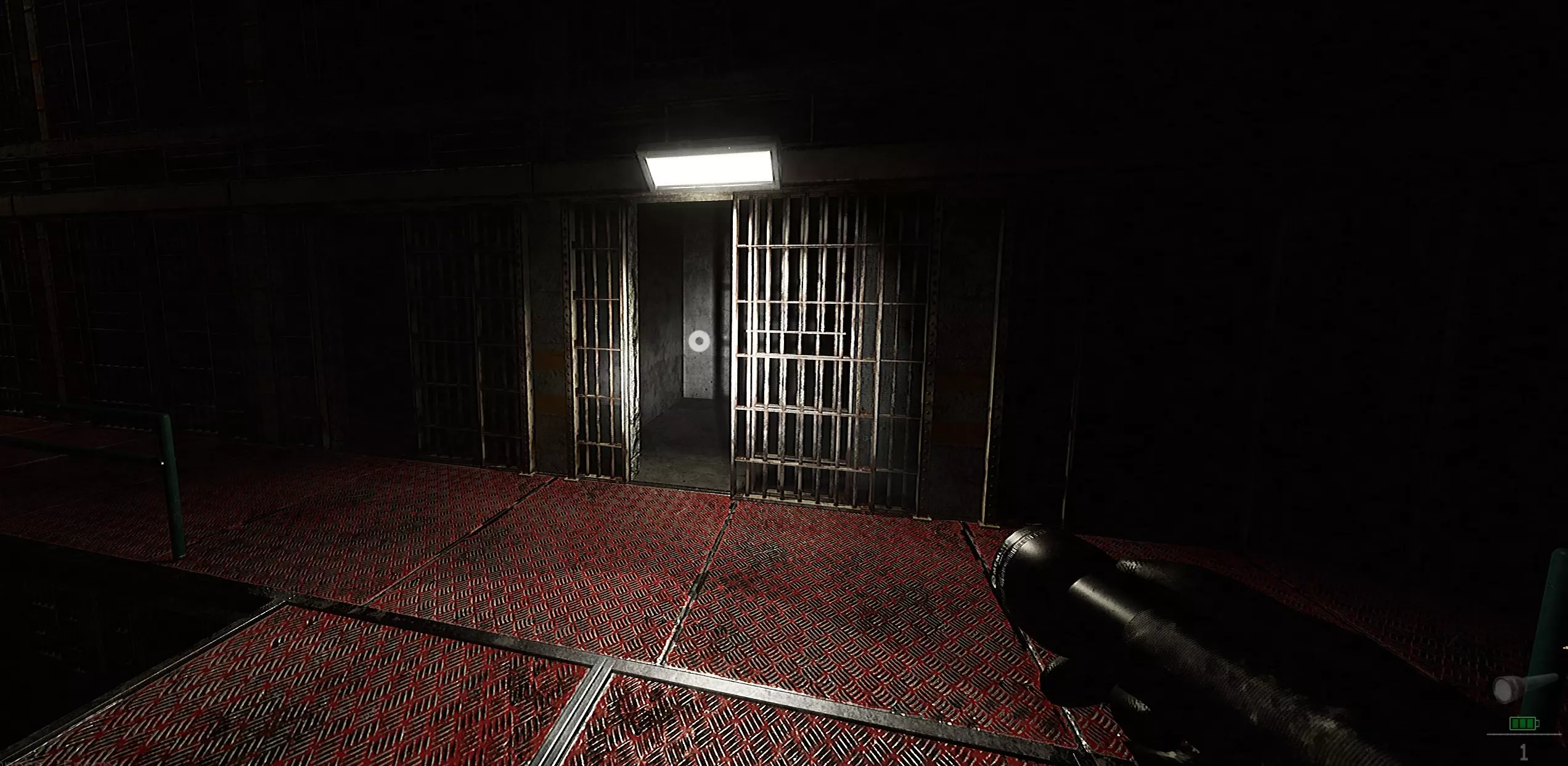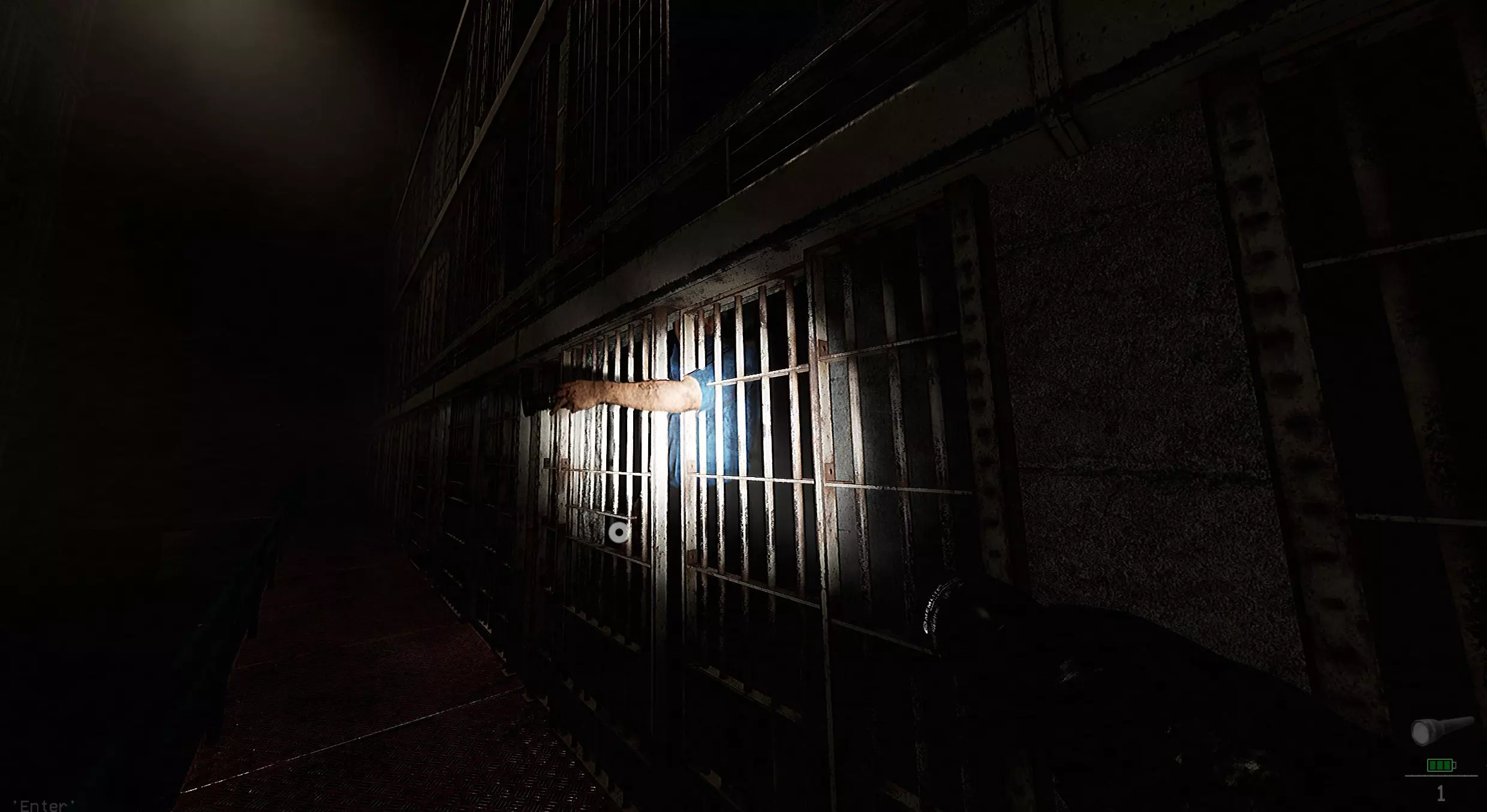 狱警是该区域唯一的实体。他完全失明,仅对声音做出反应!要将他锁在牢房内,你必须在他靠近时通过在牢房内制造噪音来引诱他进入,最好是在他已经走下上述楼梯后,这样你就有足够的时间进行引诱。当他靠近时,悄悄进入牢房,然后开始在牢房后部冲刺(会制造噪音)。这应该会让他警觉并跑向你开始冲刺的牢房特定位置。在此期间,你只需走出牢房,并在他身后关上门即可。
