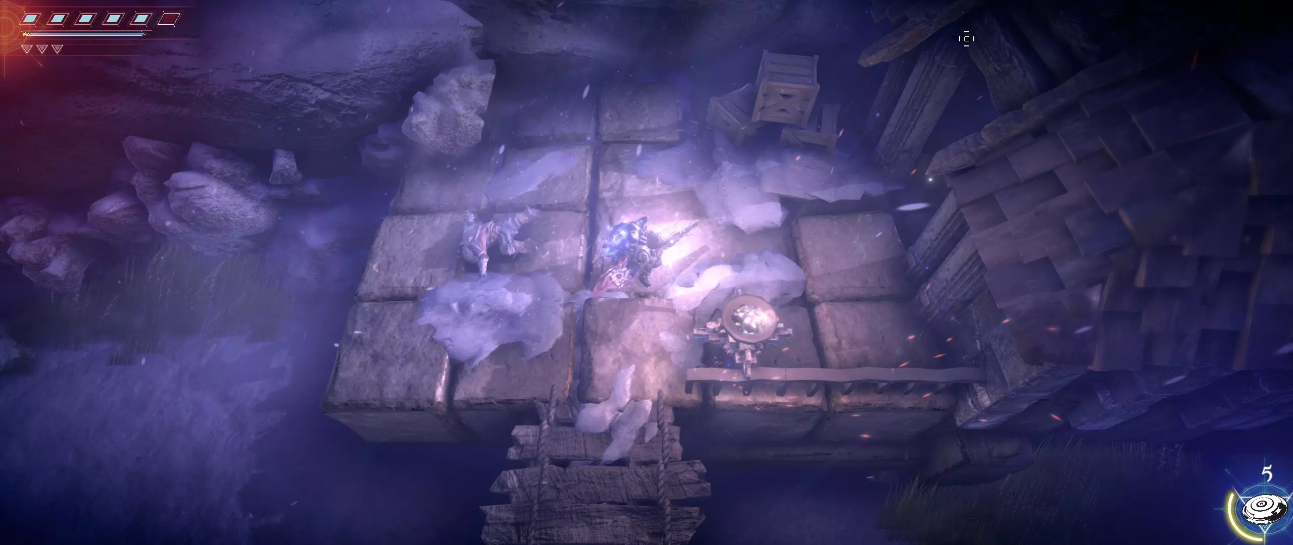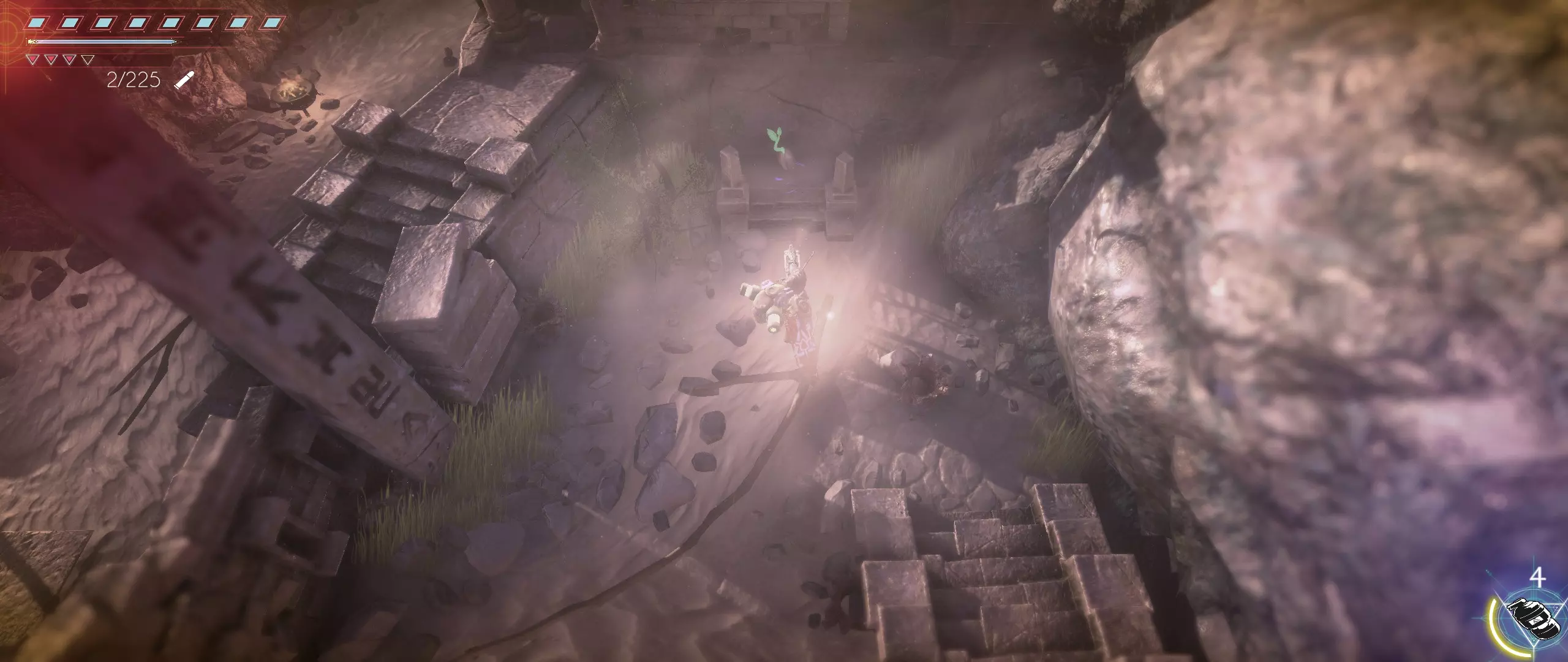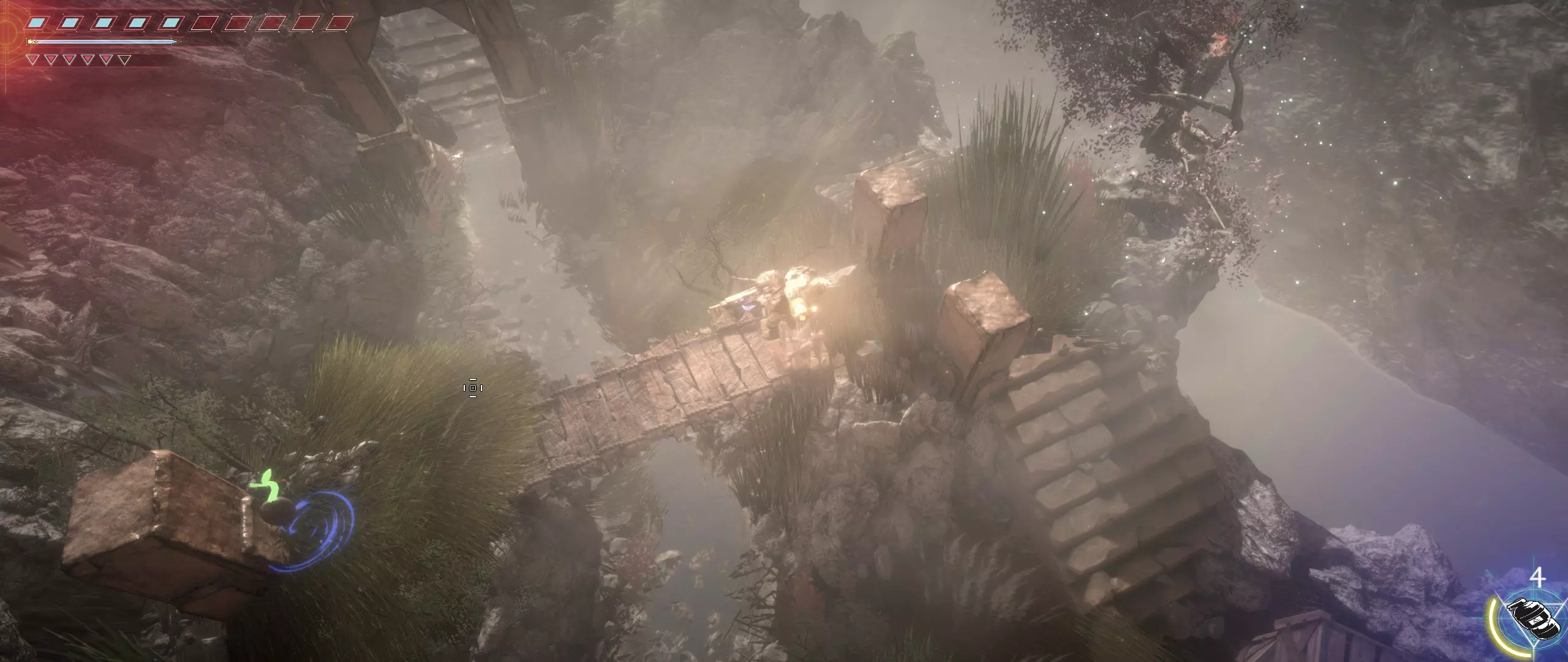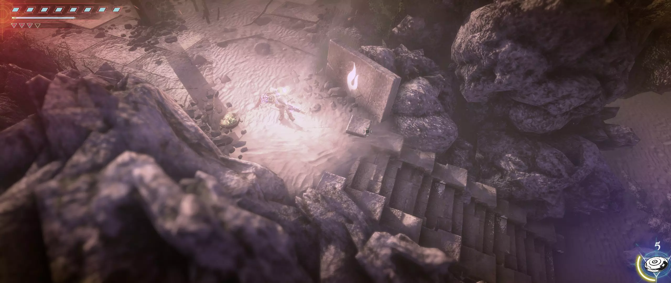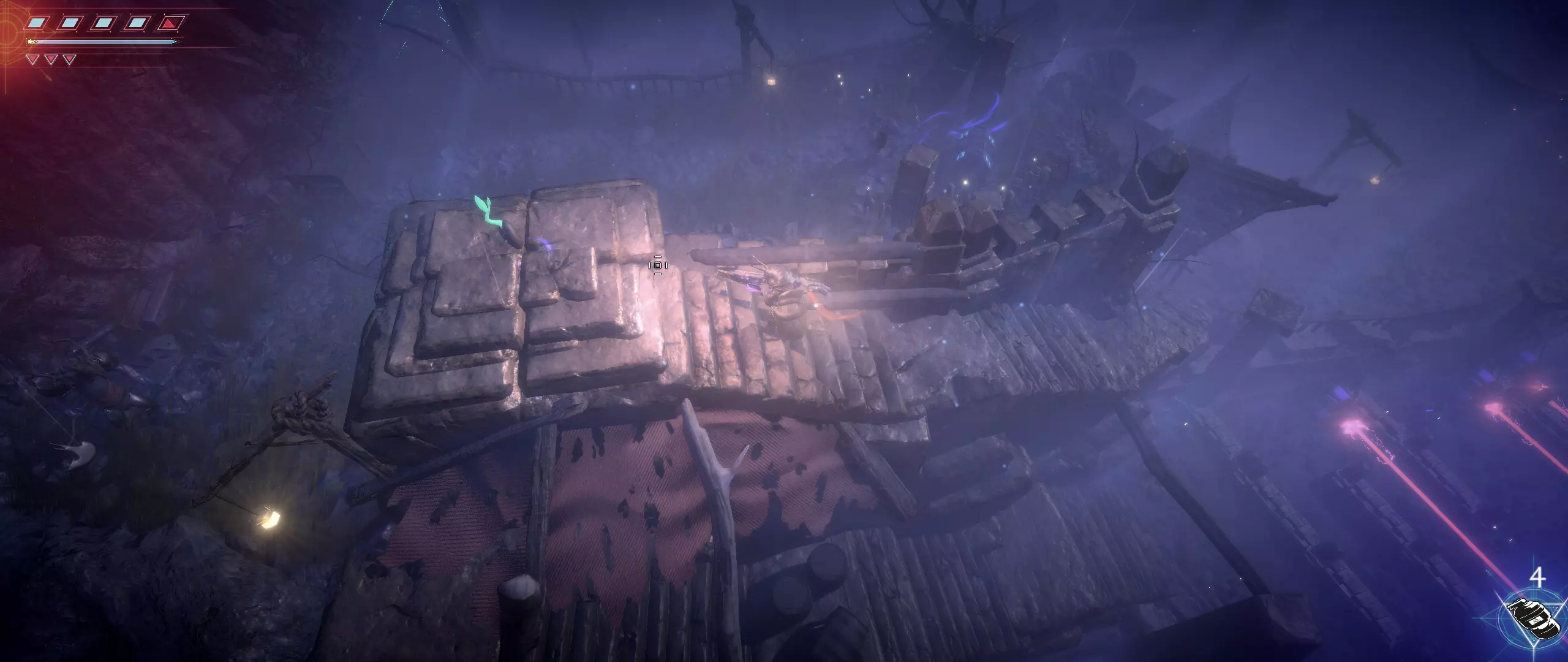 接下来,我们往回走,来到一个小悬崖边,克利德将从这里跳下去。下面会有很多敌人,并且同样有两条后续路线可选。在找到种子之前,绝对不要踏上那个通过拉杆启动的平台,否则就再也回不来了。首先选择从克利德跳落位置沿地图向下的路线。这条路会带我们登上岩石顶端。一直向右走,直到看到石台上的火焰和一个孤零零的宝箱。在它们之间会发现一条通往木桥的通道。