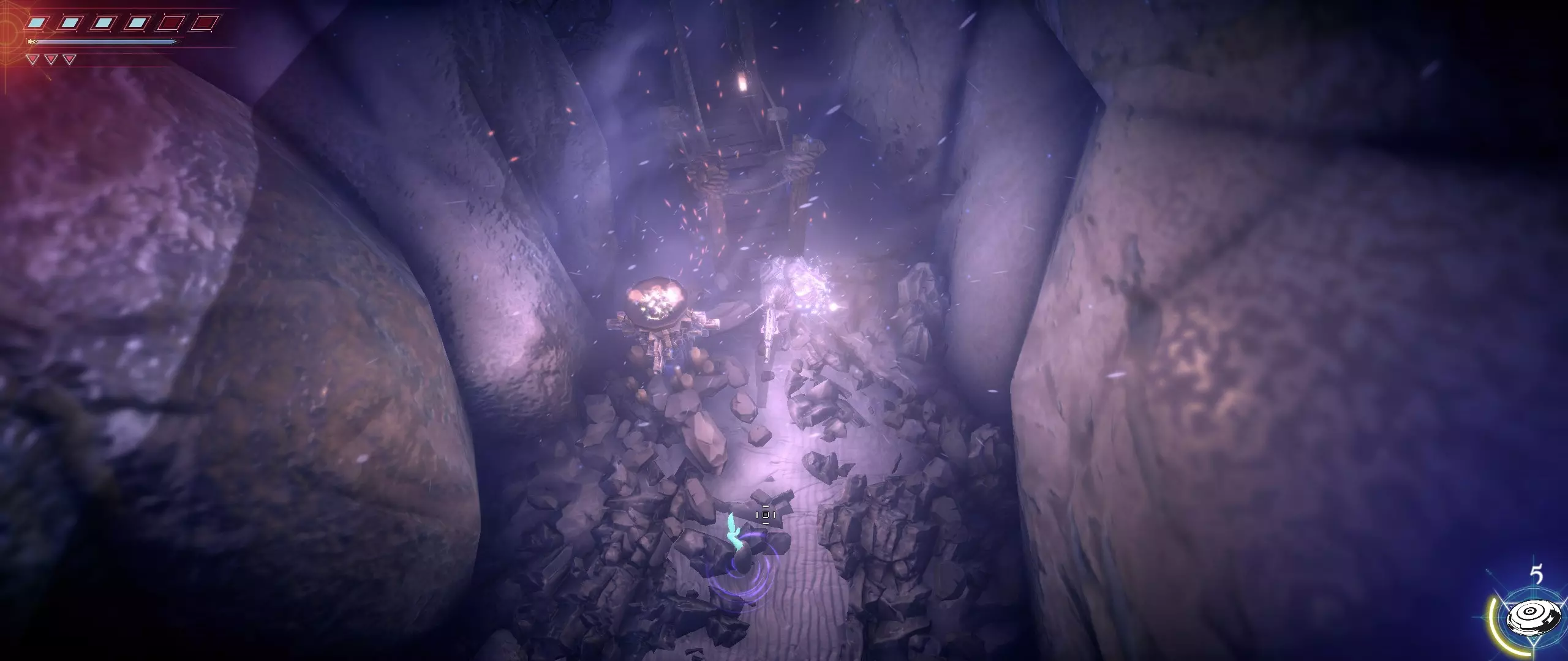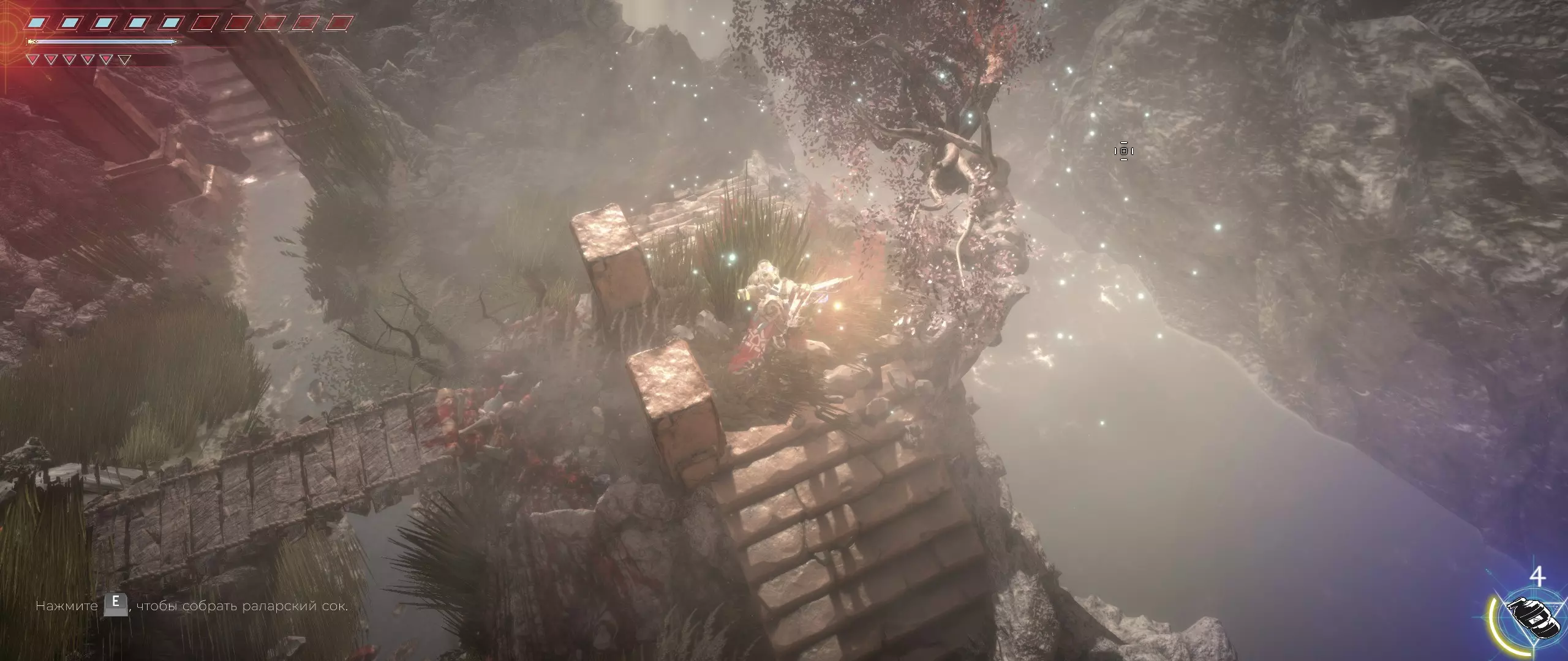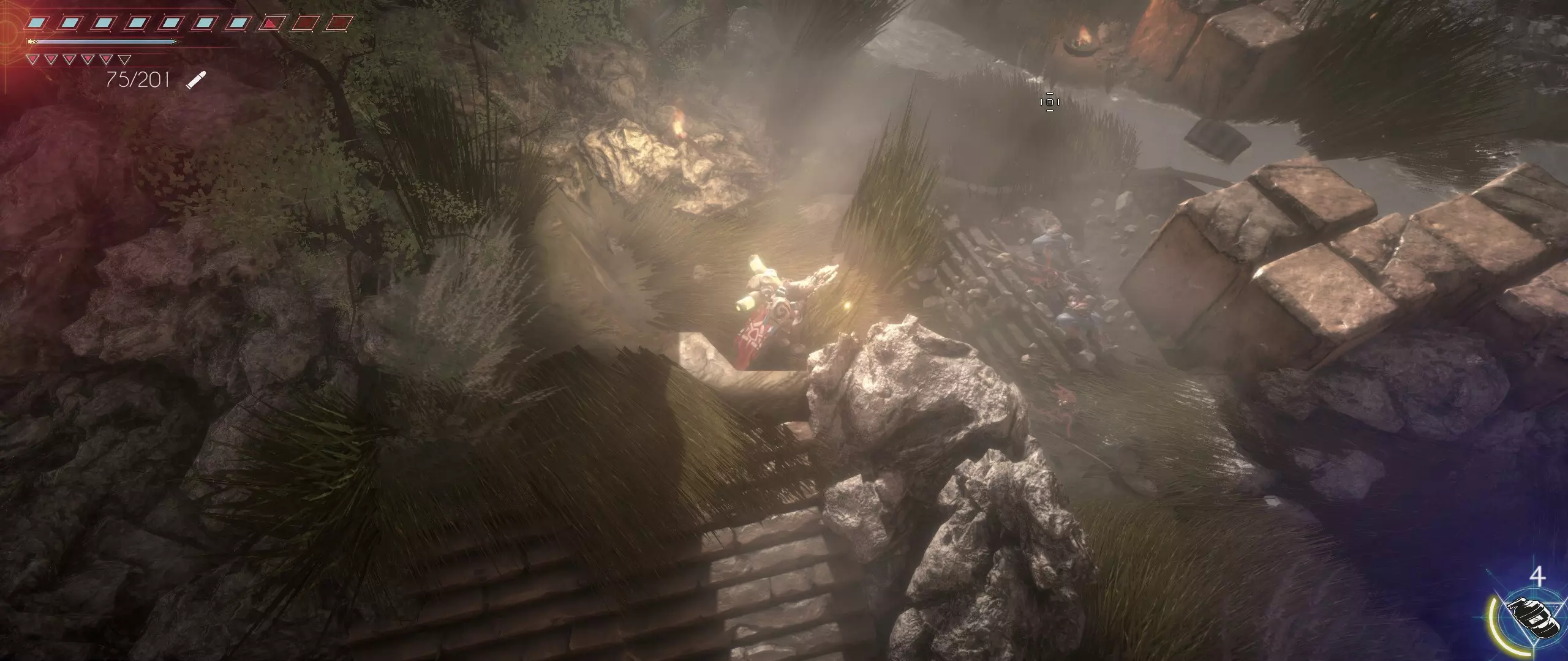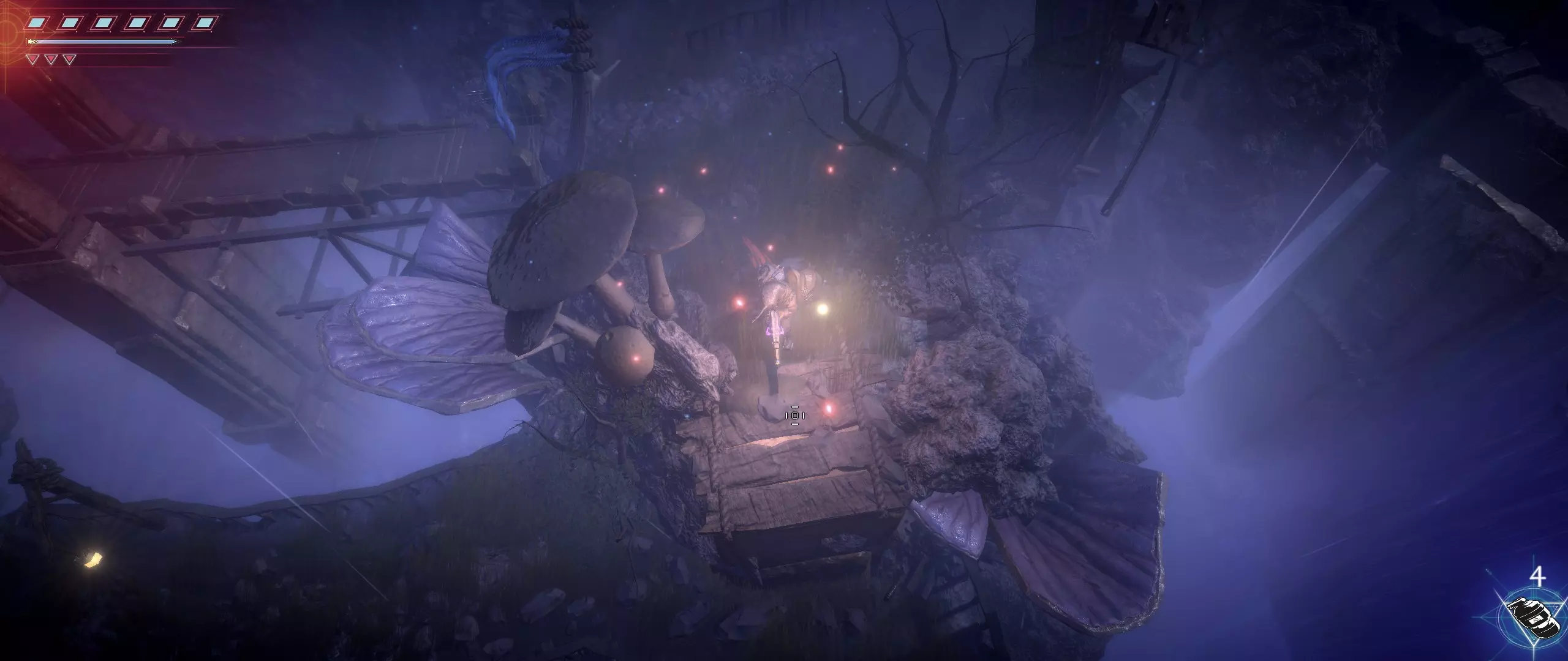 接下来,我们往回走,来到一个小悬崖边,克利德将从这里跳下去。下面会有很多敌人,并且同样有两条后续路线可选。在找到种子之前,绝对不要踏上那个通过拉杆启动的平台,否则就再也回不来了。首先选择从克利德跳落位置沿地图向下的路线。这条路会带我们登上岩石顶端。一直向右走,直到看到石台上的火焰和一个孤零零的宝箱。在它们之间会发现一条通往木桥的通道。