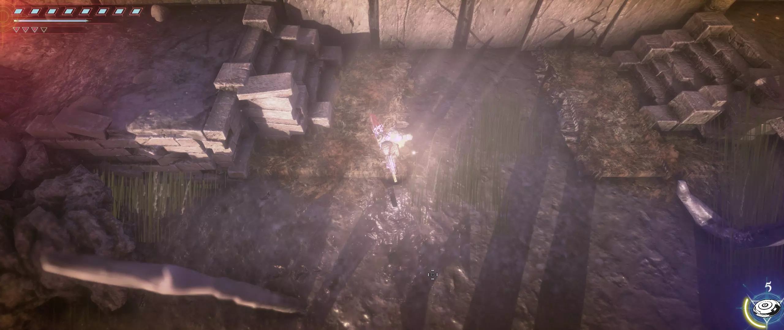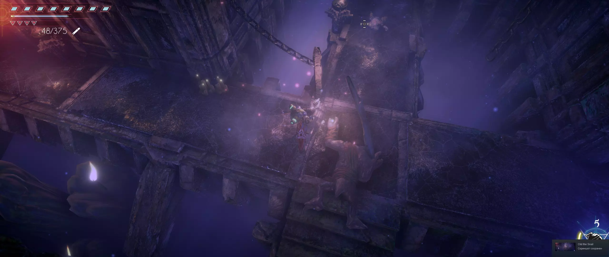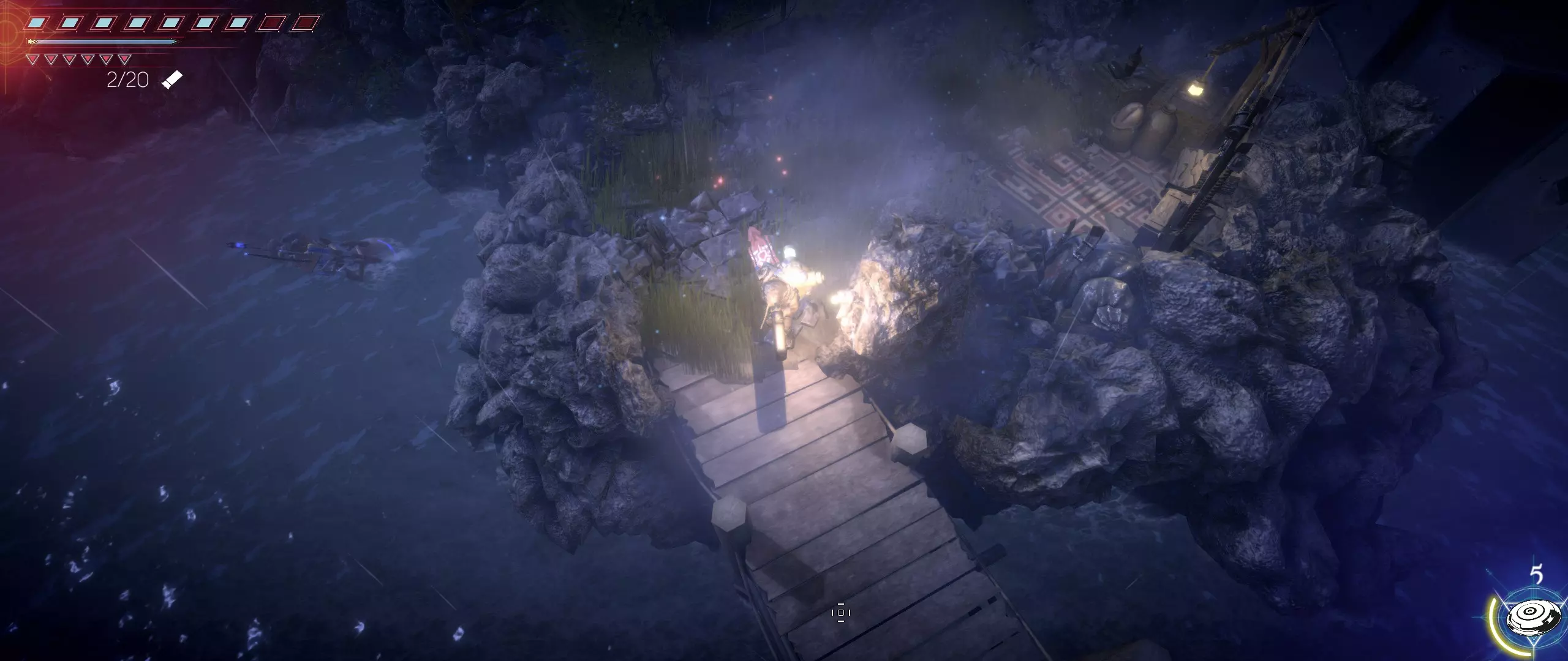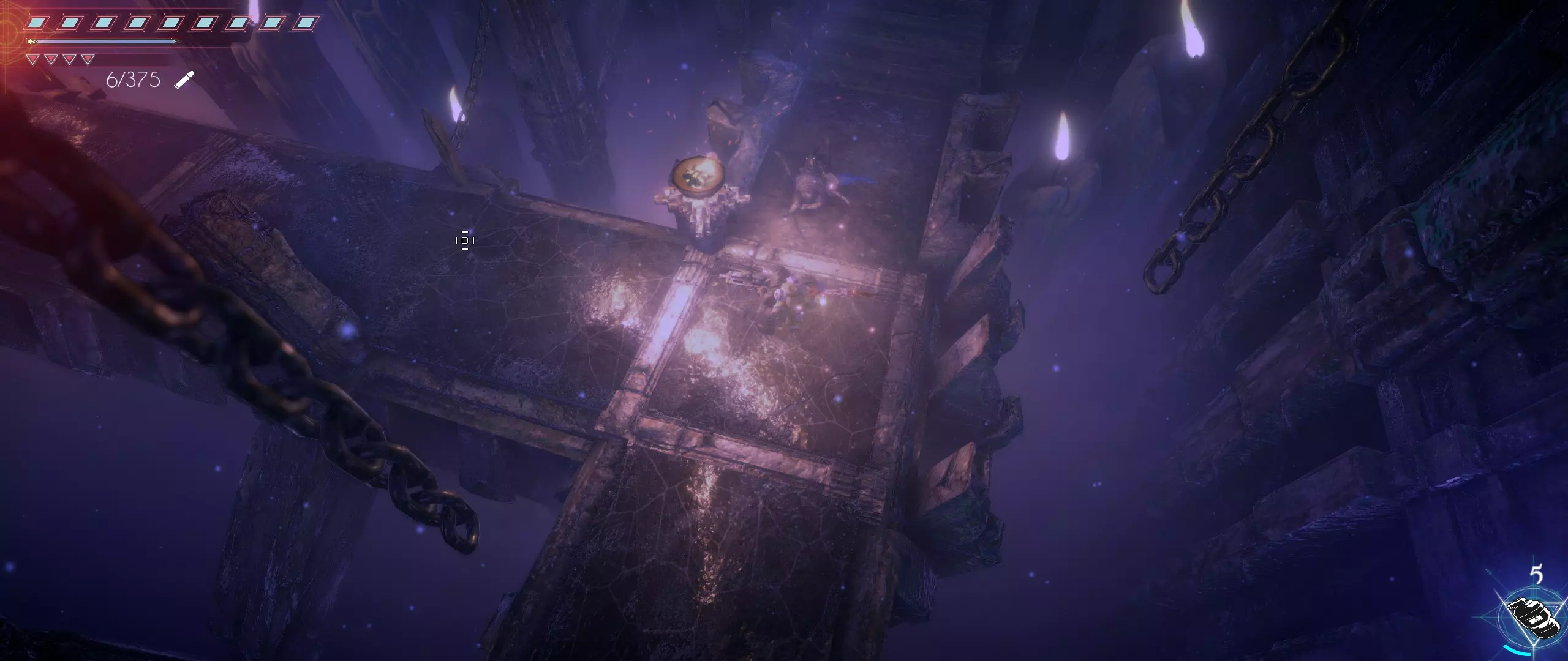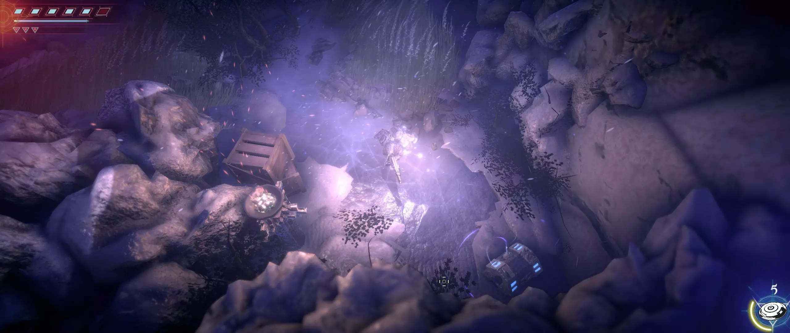 接下来,我们往回走,来到一个小悬崖边,克利德将从这里跳下去。下面会有很多敌人,并且同样有两条后续路线可选。在找到种子之前,绝对不要踏上那个通过拉杆启动的平台,否则就再也回不来了。首先选择从克利德跳落位置沿地图向下的路线。这条路会带我们登上岩石顶端。一直向右走,直到看到石台上的火焰和一个孤零零的宝箱。在它们之间会发现一条通往木桥的通道。