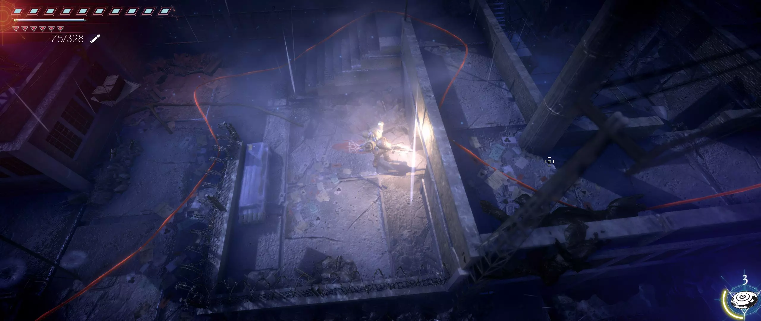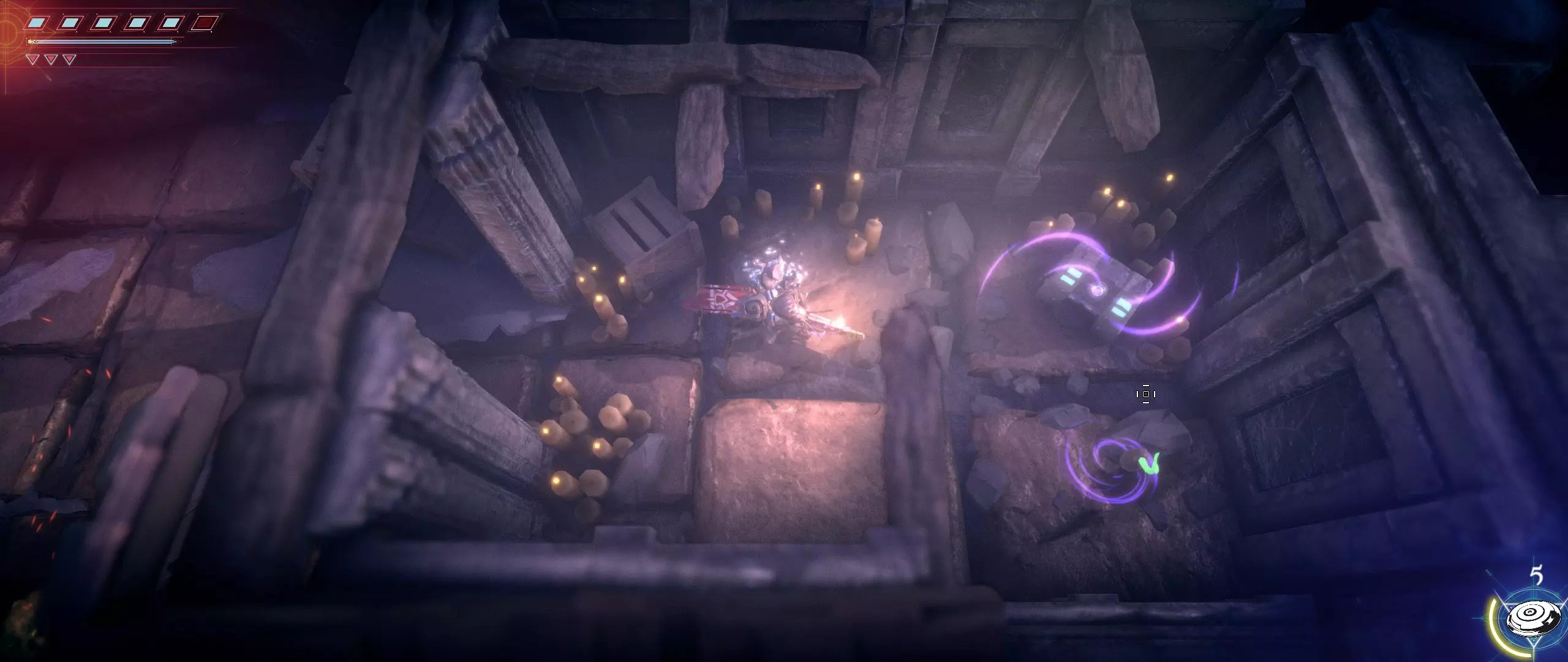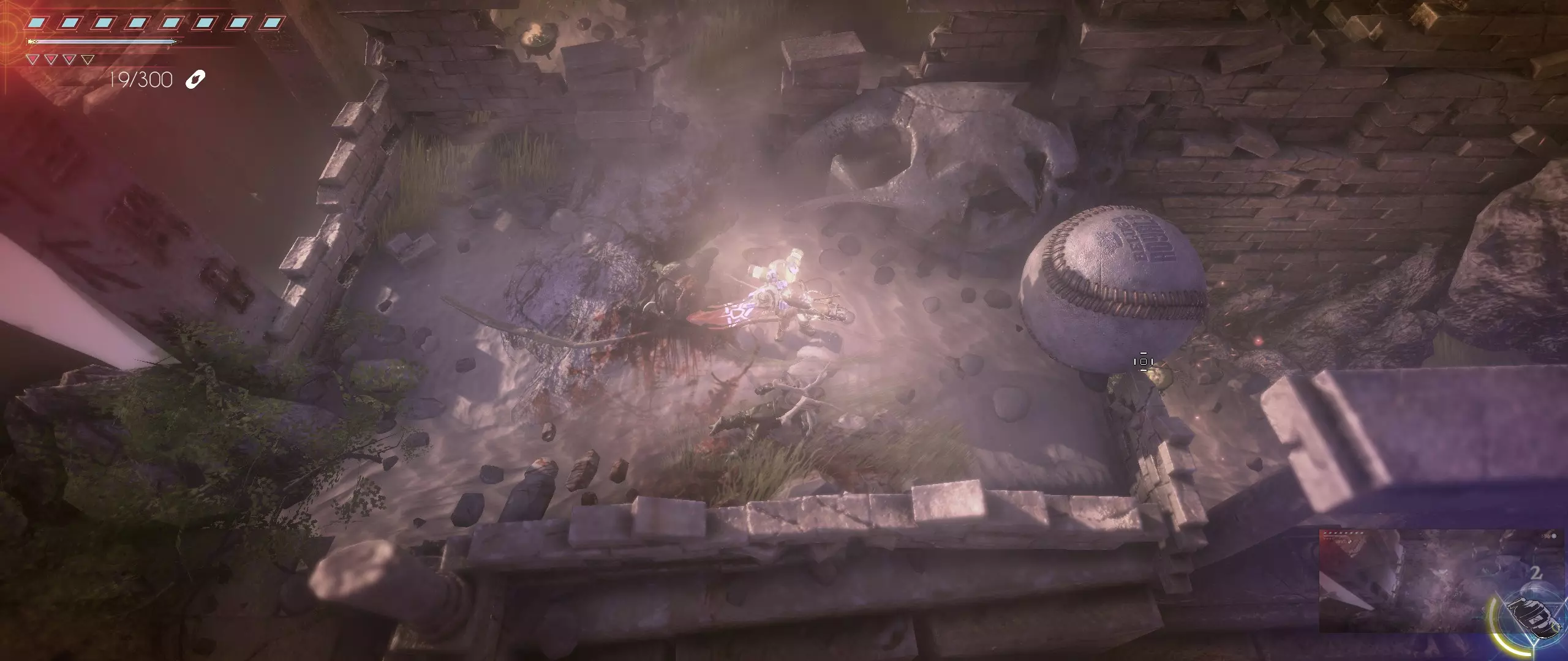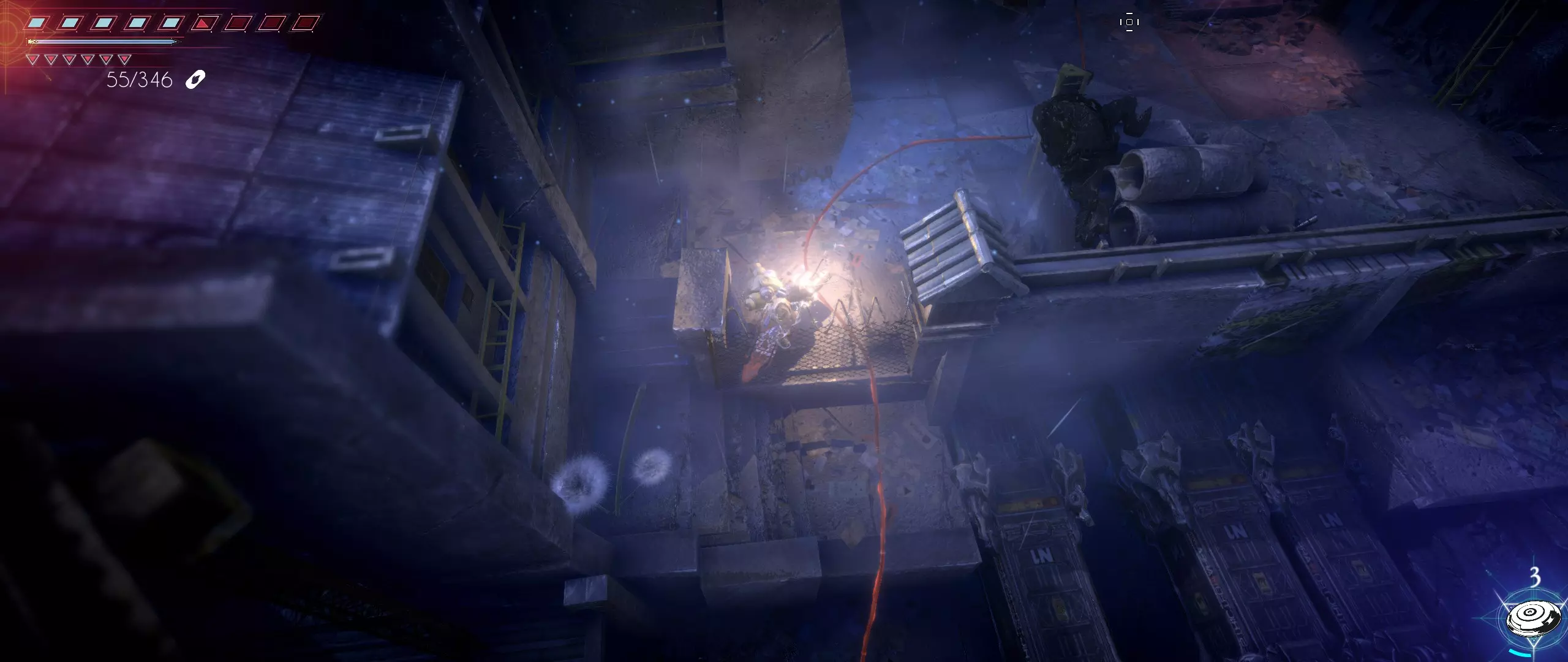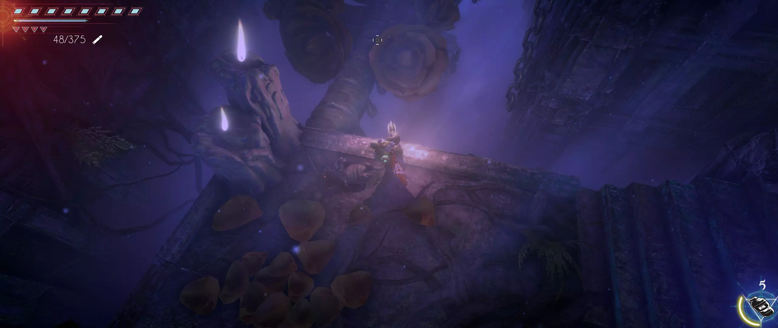 接下来,我们往回走,来到一个小悬崖边,克利德将从这里跳下去。下面会有很多敌人,并且同样有两条后续路线可选。在找到种子之前,绝对不要踏上那个通过拉杆启动的平台,否则就再也回不来了。首先选择从克利德跳落位置沿地图向下的路线。这条路会带我们登上岩石顶端。一直向右走,直到看到石台上的火焰和一个孤零零的宝箱。在它们之间会发现一条通往木桥的通道。