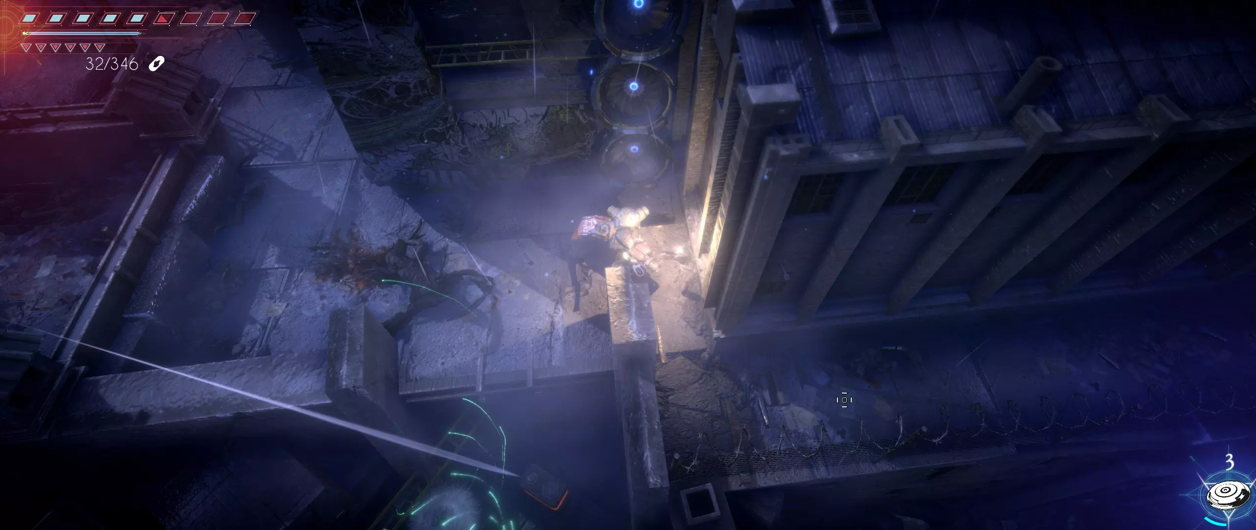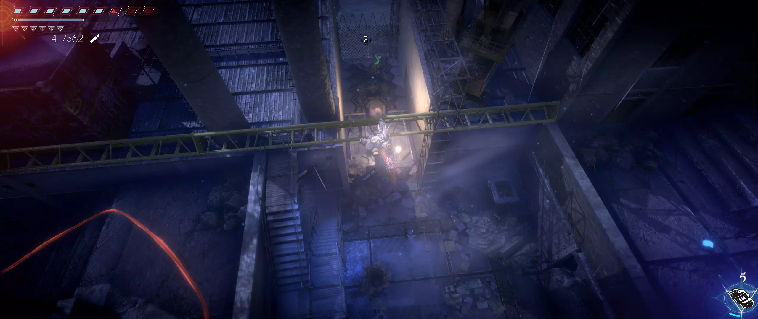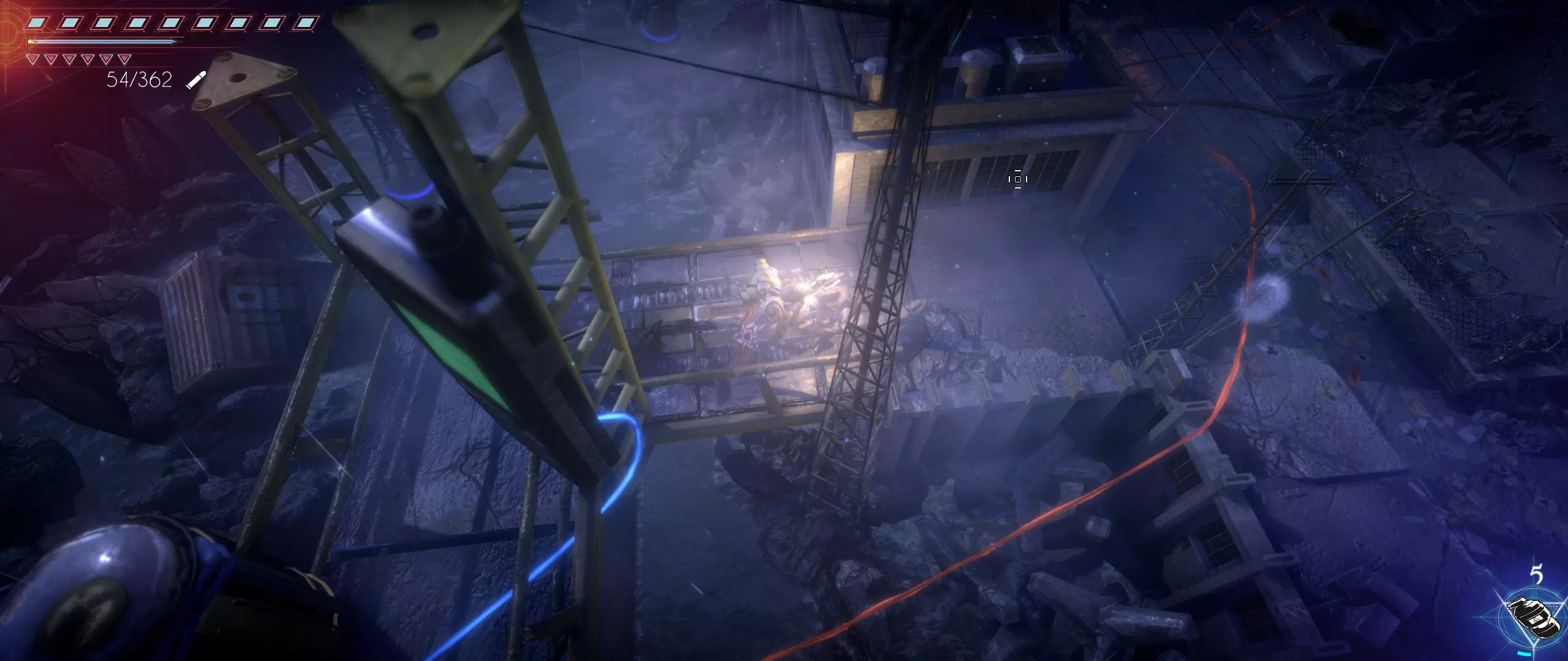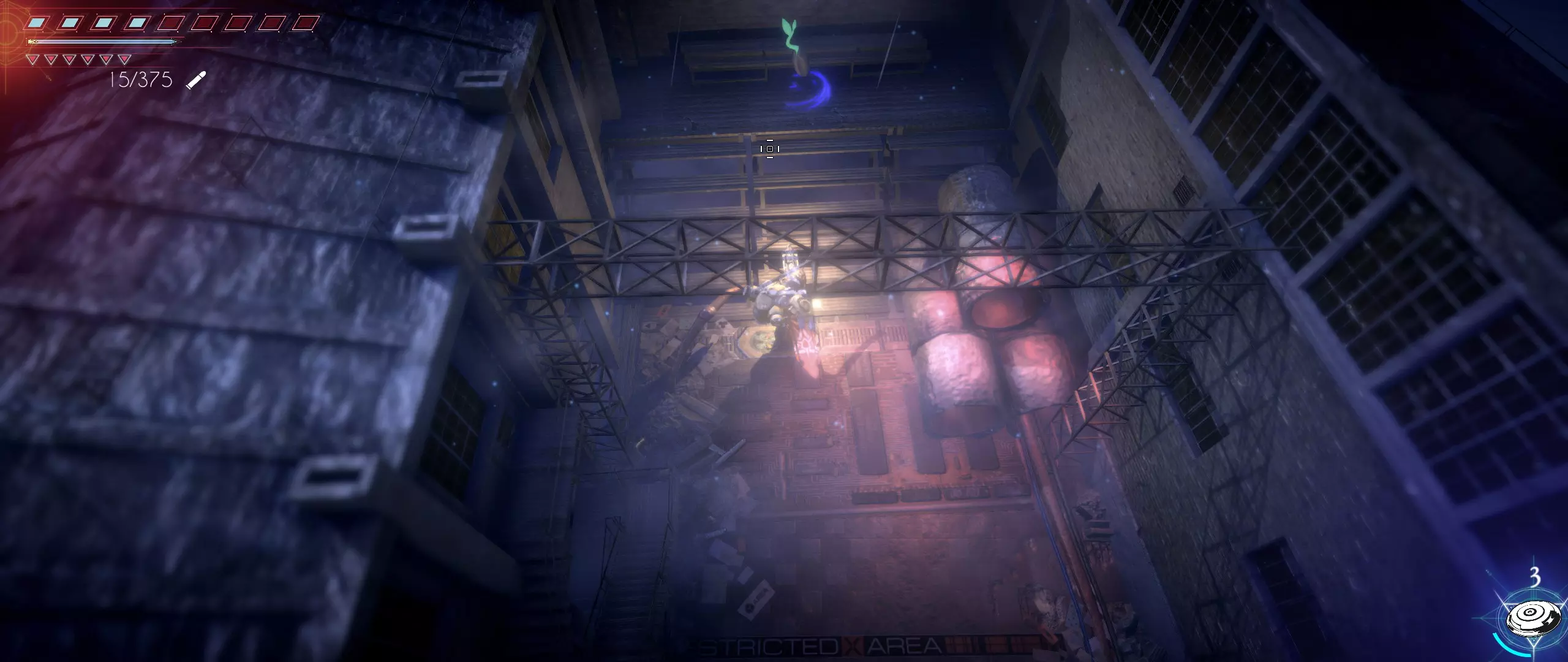 现在前往由三个上下排列的涡轮机组成的地标处。在可以向下跳到蓄电池的位置附近,有一条环绕工厂某栋建筑的通道。沿着通道走,然后进入建筑。