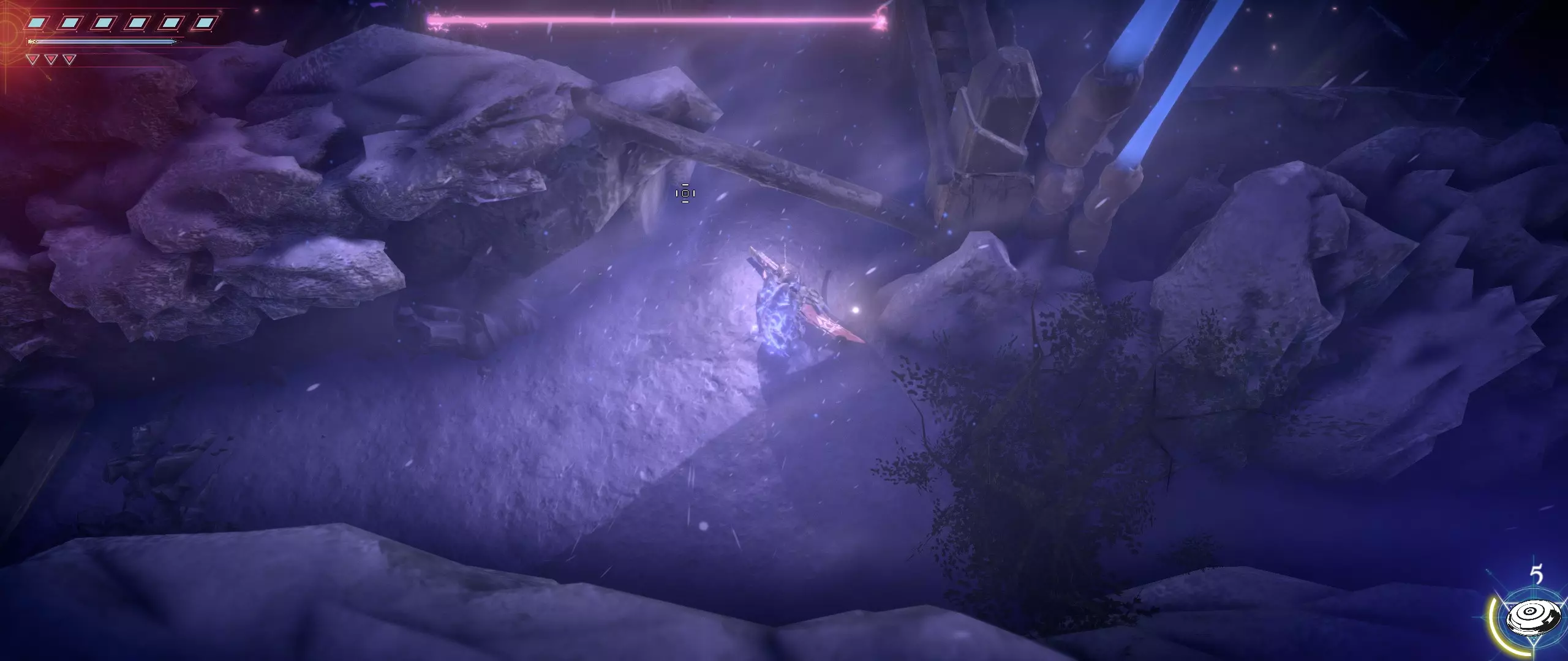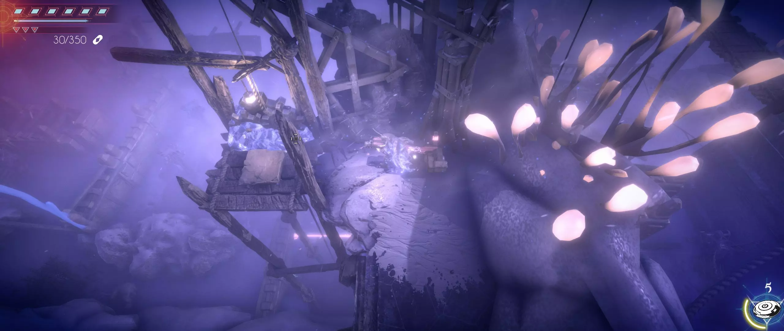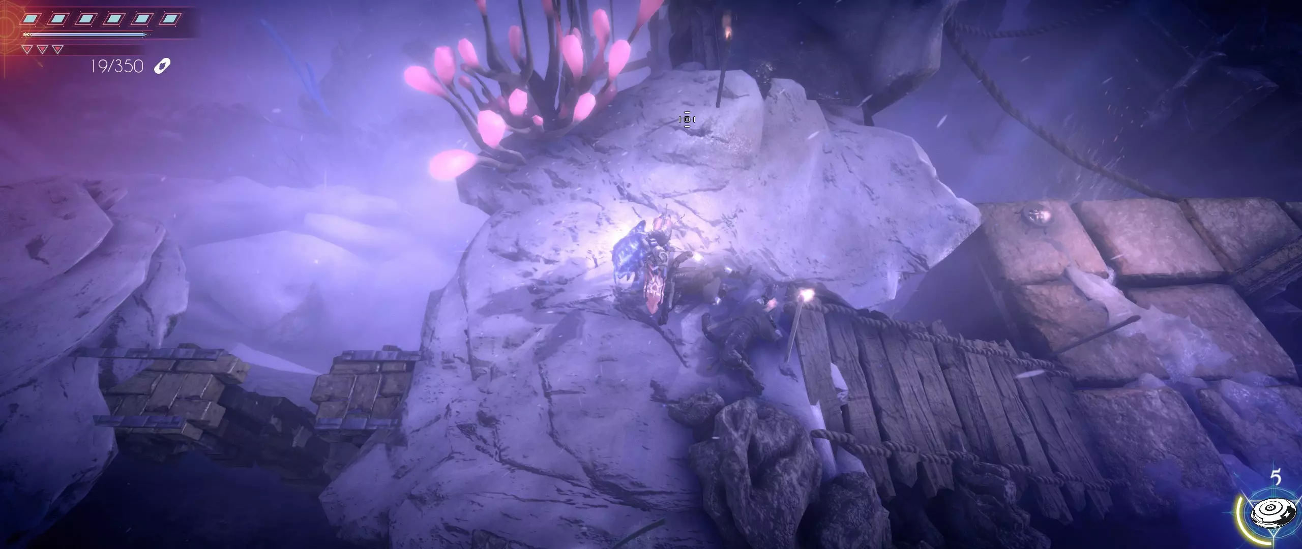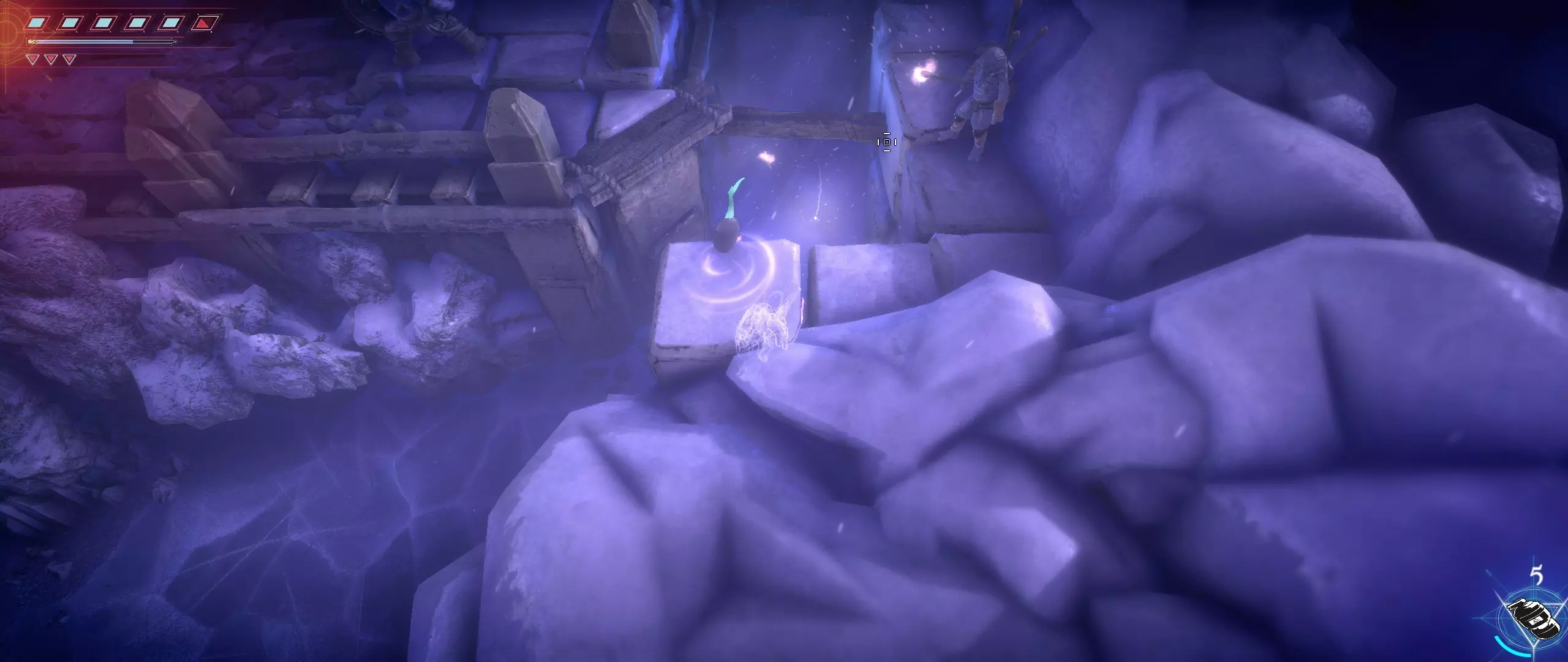 我们继续前进,解开谜题,绕过巨大的雪人,向积雪堡垒的上层进发。一直走,直到看到一座破损窄桥形成的岔路,以及在一株泛着微光的植物旁通往堡垒城墙的出口。