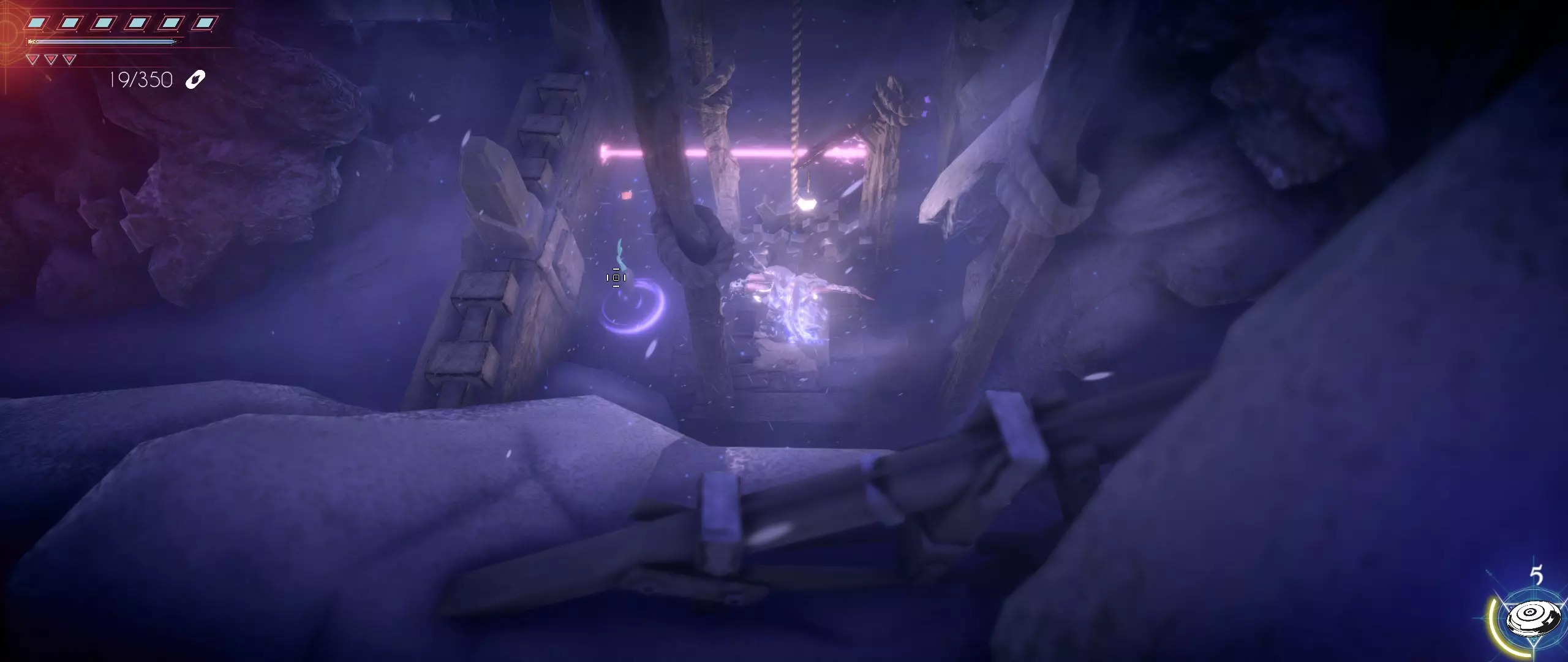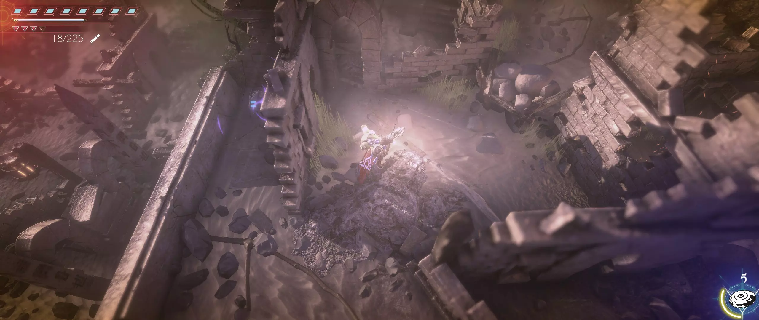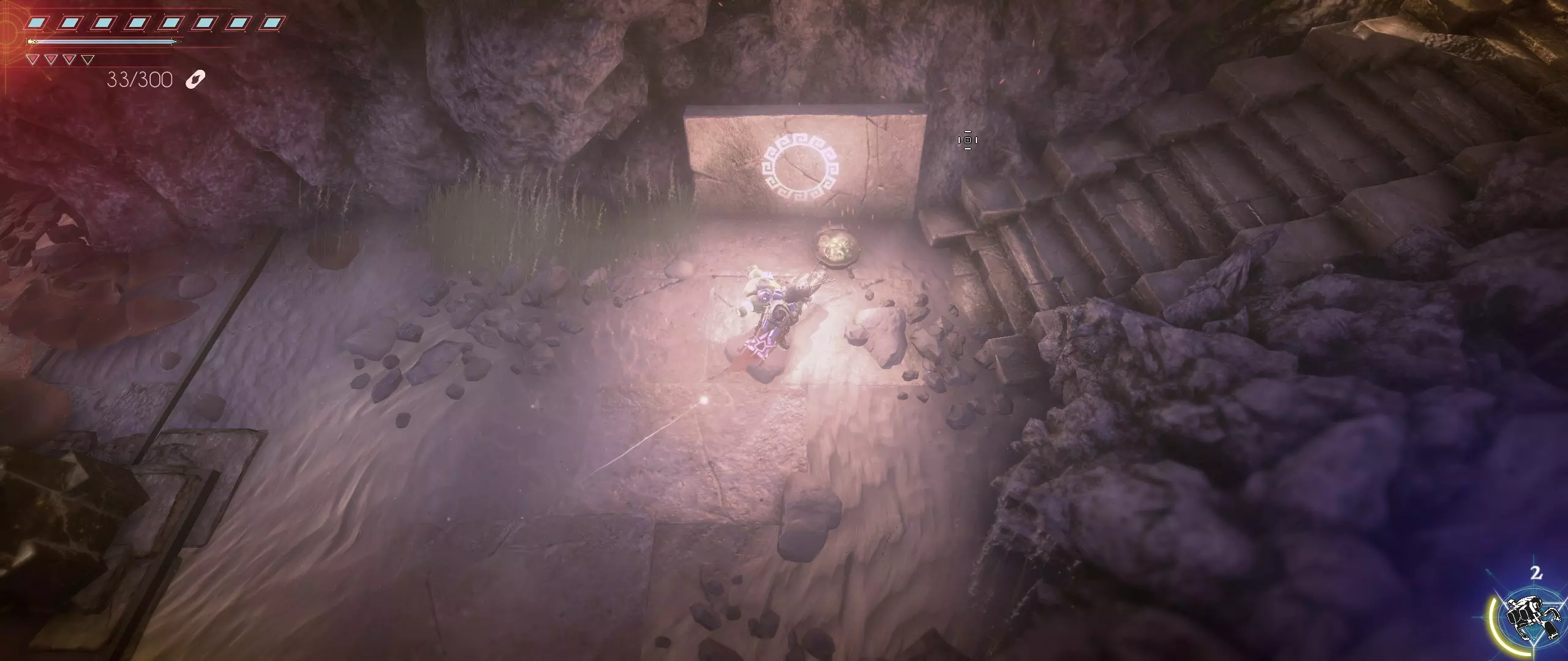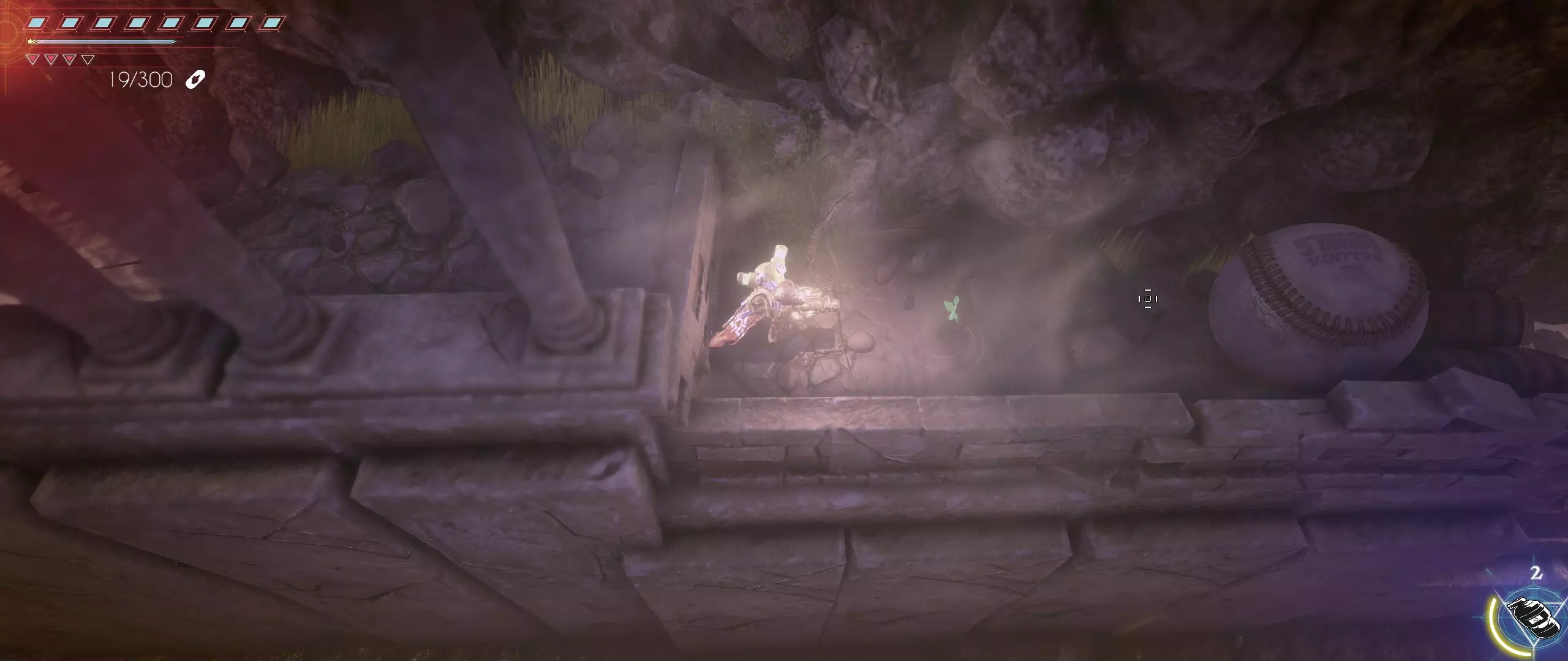 第一关的所有种子已收集完毕,克利德获得了第一次生命值加成。 银色山脉 击退抵达山脉后遇到的第一波史莱姆后,会发现一个狭窄的石砌通道,通道顶部有两只史莱姆正朝克利德投掷燃烧瓶。在通道顶部还能看到第五颗种子。快速穿过通道,登上楼梯,用武器杀出一条血路,冲向拉拉尔之种。