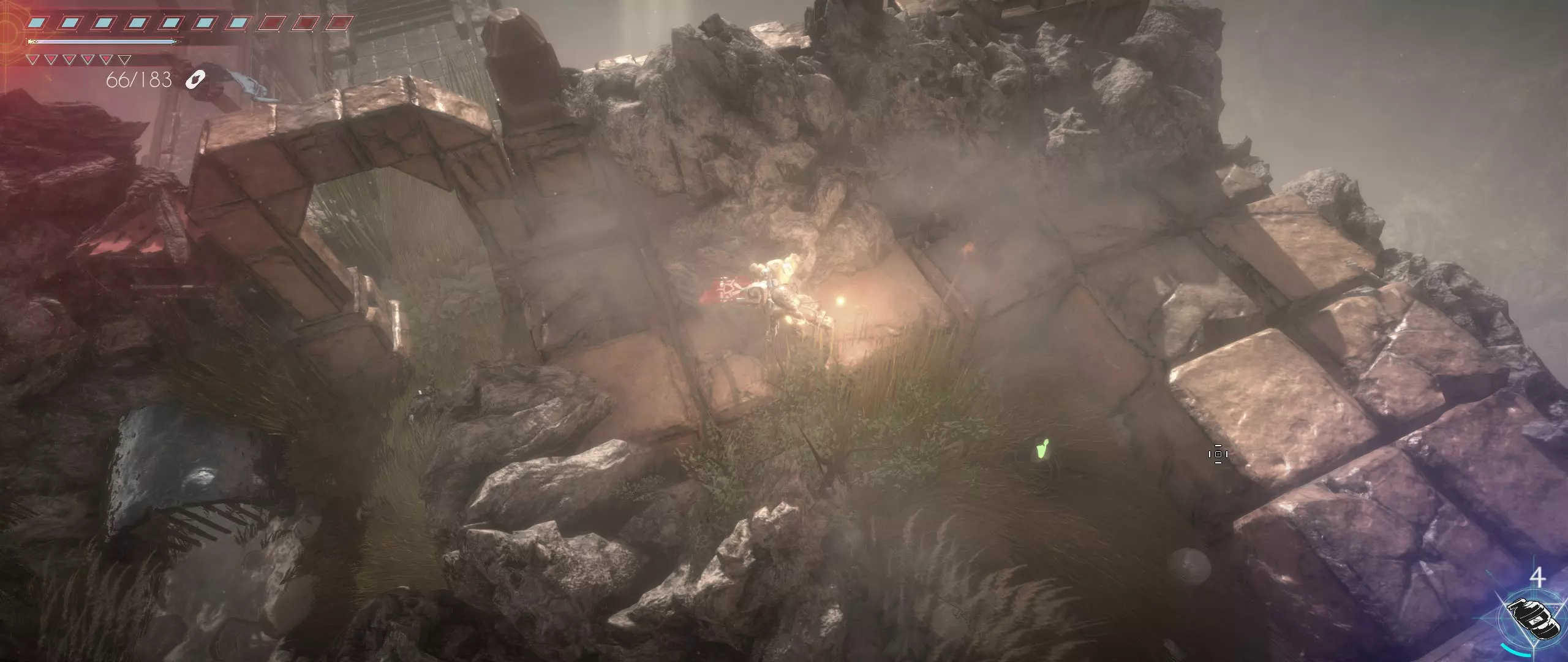 穿过击败前一区域敌人后开启的石门,我们来到了一个新的地方,这里到处都是敌人,其中还会有两条巨大的蠕虫。解决掉这些危险,同时注意不要和散落在各处的易爆桶一起被炸飞,就能轻松在石拱右侧的角落里找到第十八颗种子。