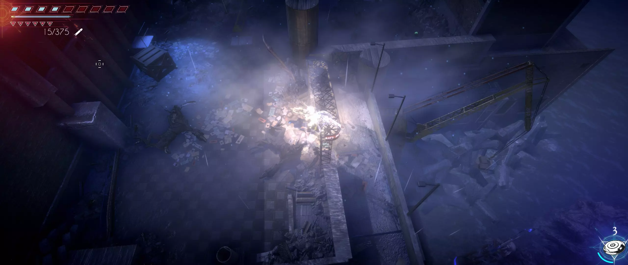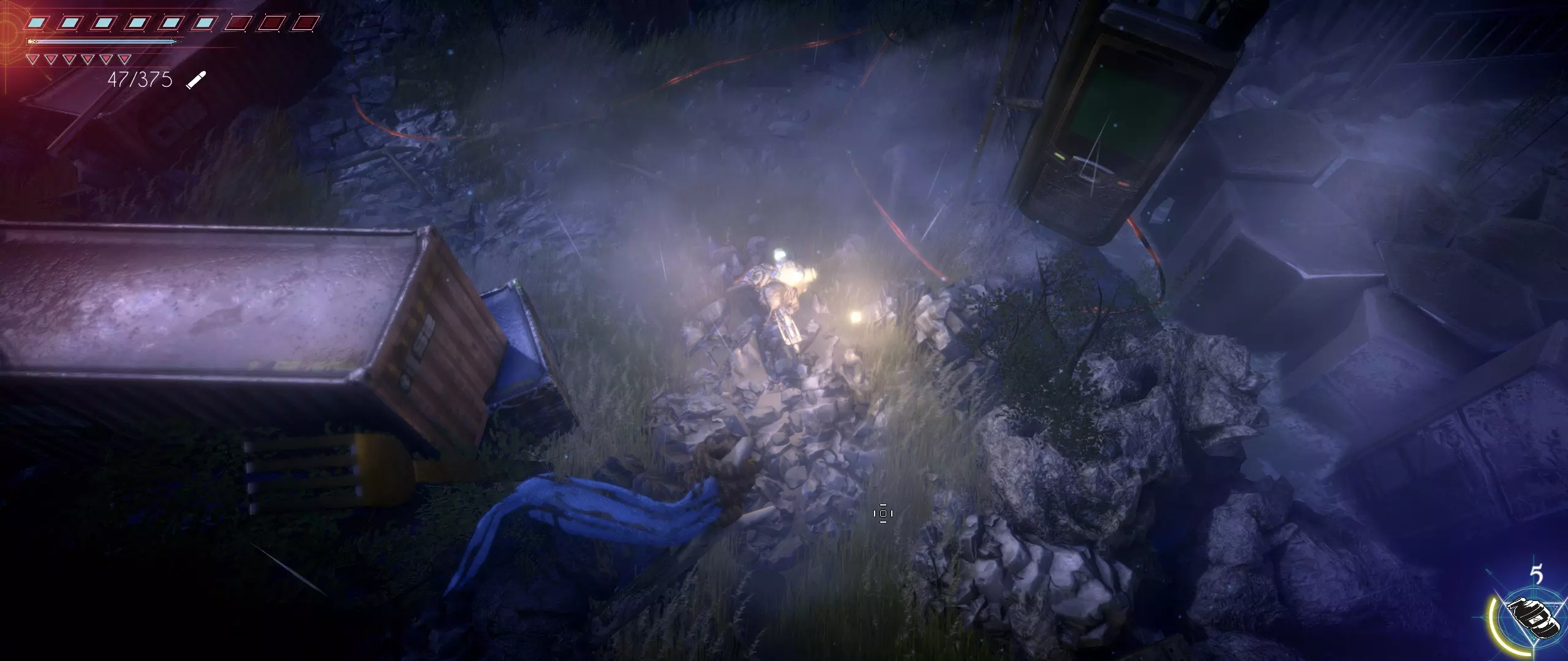 打开通往被占领工厂的通道后,我们过桥来到那里,绕过起重机和货运集装箱,朝着屏幕下方的商人方向走去。