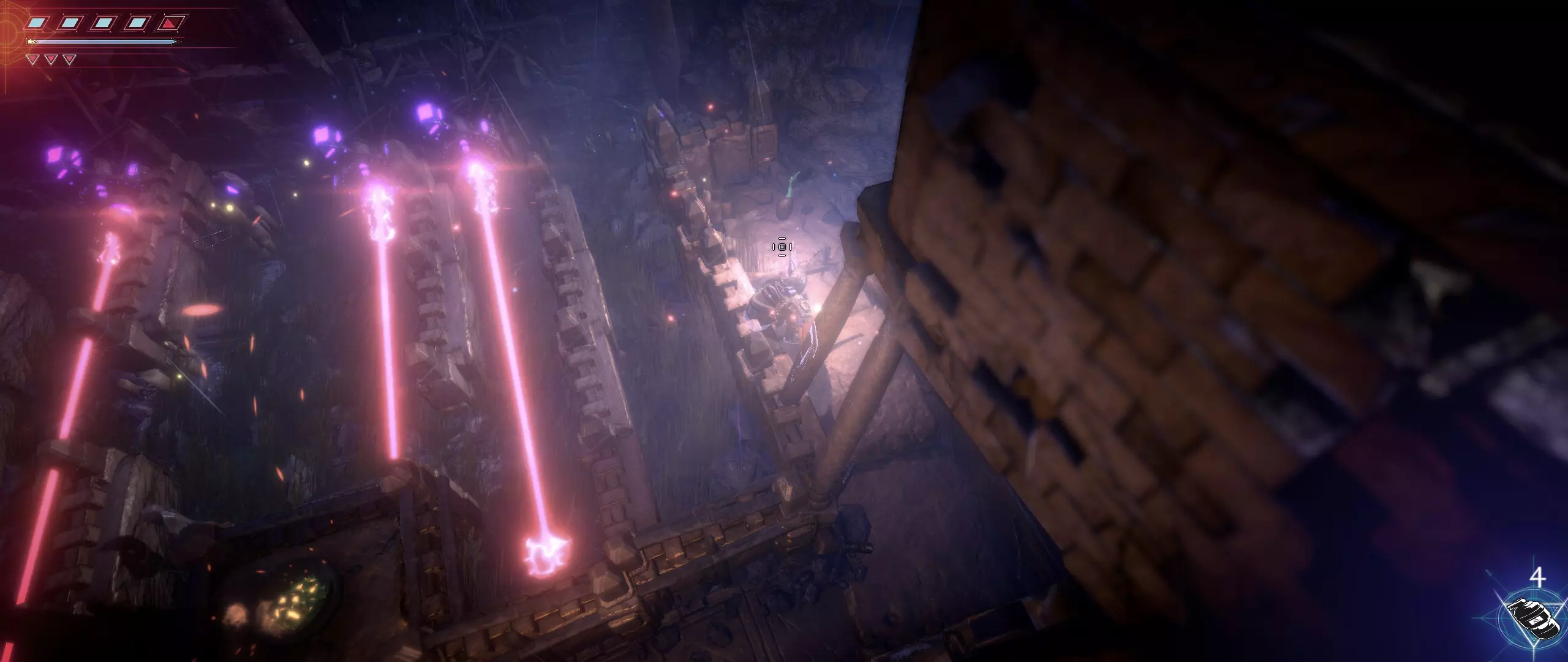 我们走向位于我们下方一点的楼梯,它通往有激光的迷宫。解决这个简单的谜题,通过射击开关来打开通往第四颗种子的门。