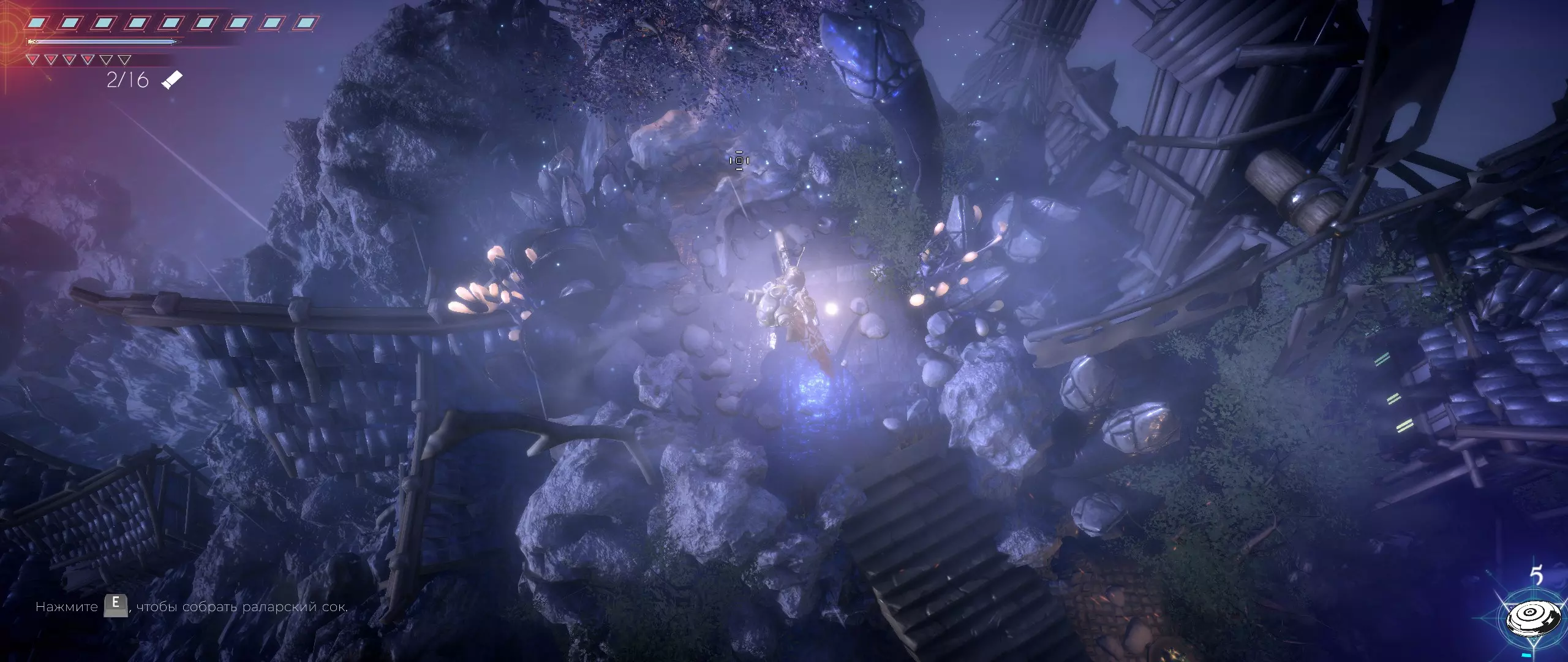 回到第一个岔路口,这次向下走,会立刻遇到一具戴着蓝色围巾的虫族尸体,就是营地中它的兄弟让我们寻找的那一个。找到它还能解锁名为【Слава Титанам!】的成就。这具尸体不仅能为我们带来Steam成就,还是通往第二棵拉拉尔古树的路标。古树就在尸体左侧的路上等着我们。