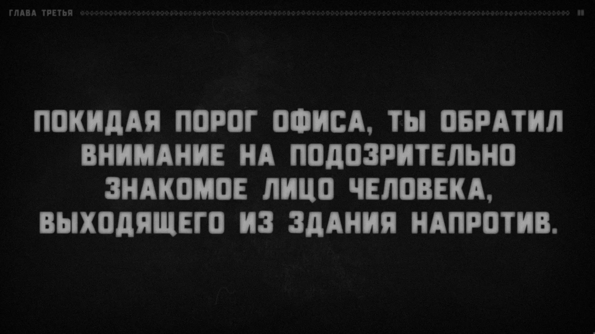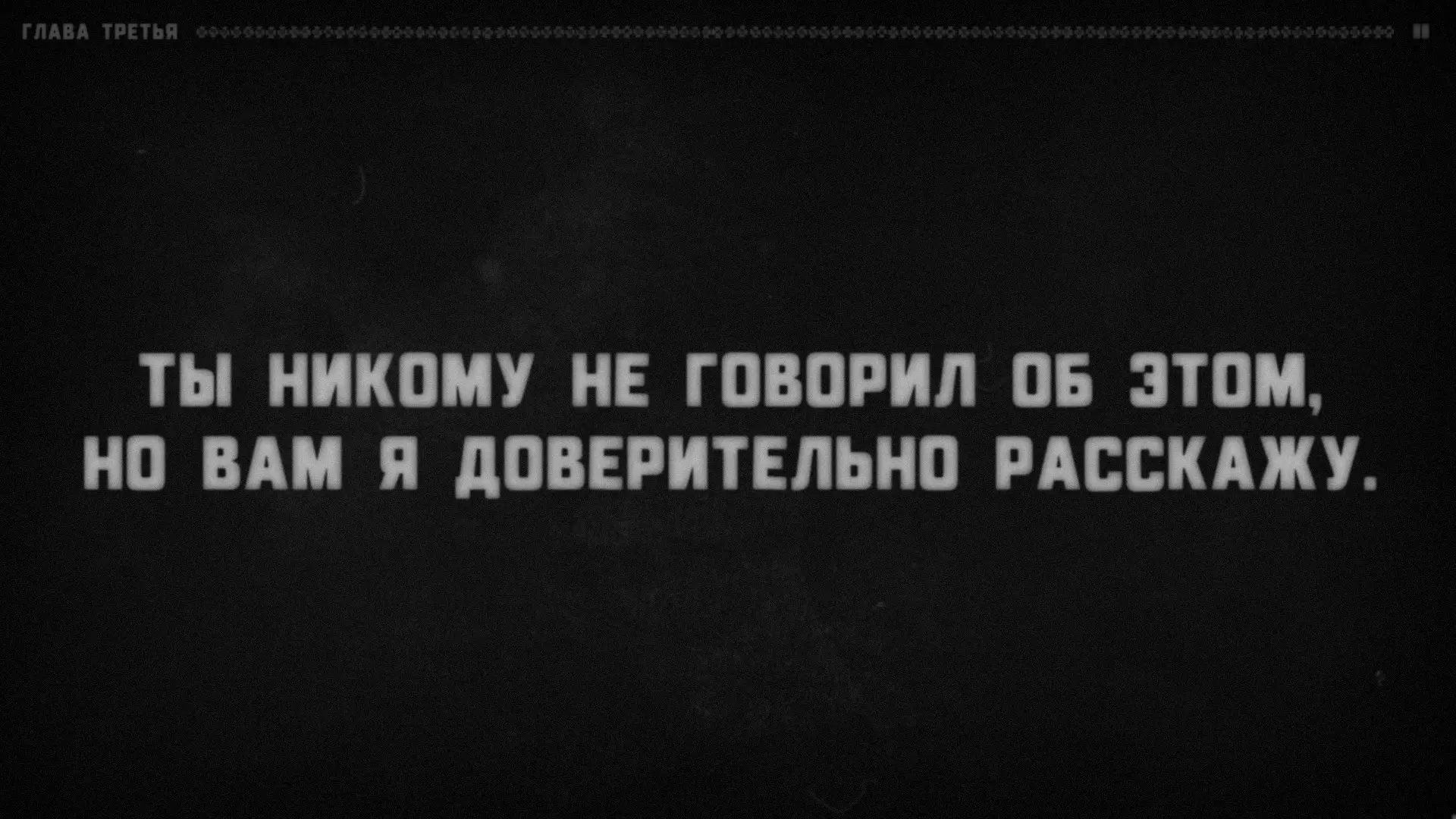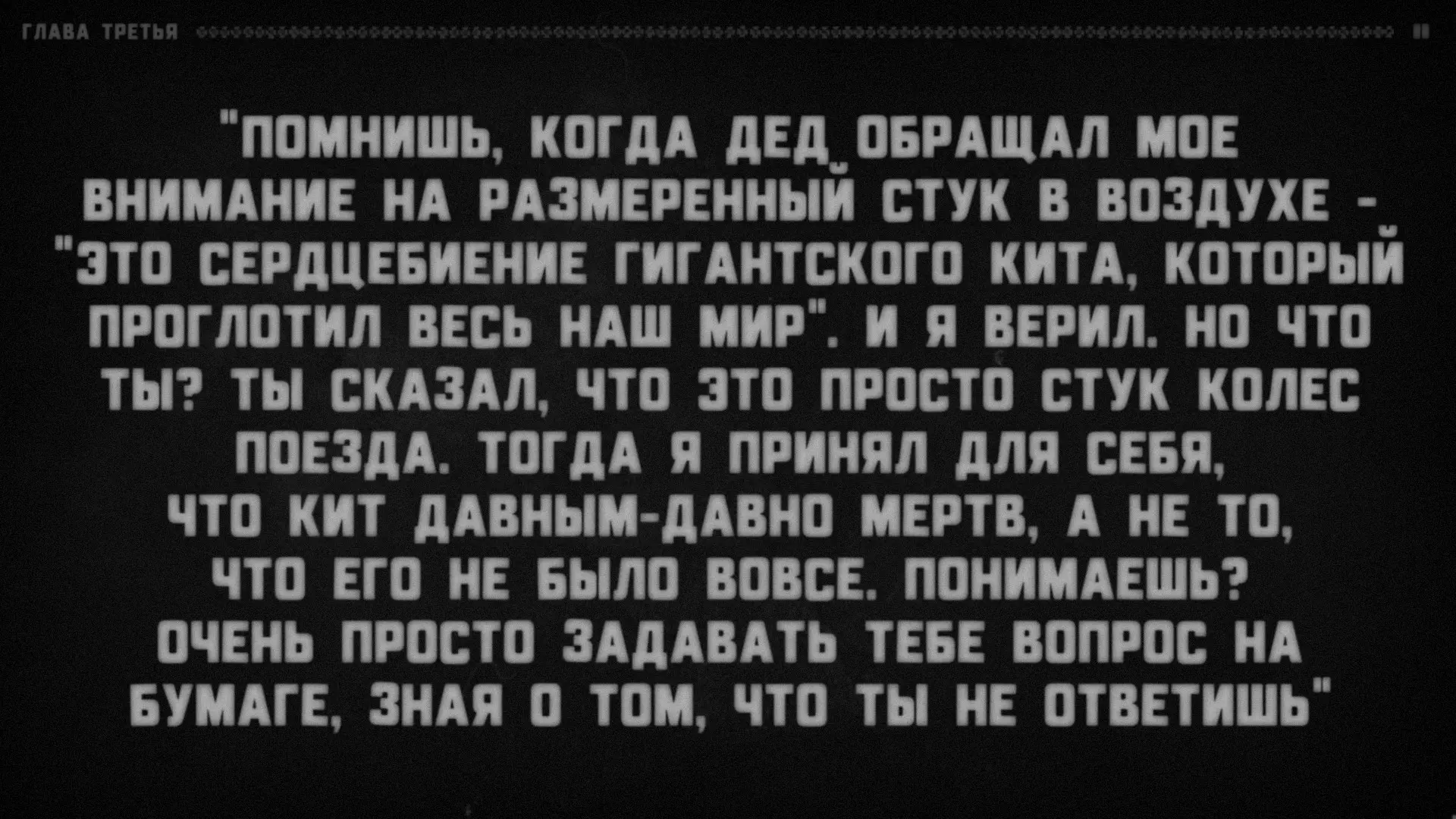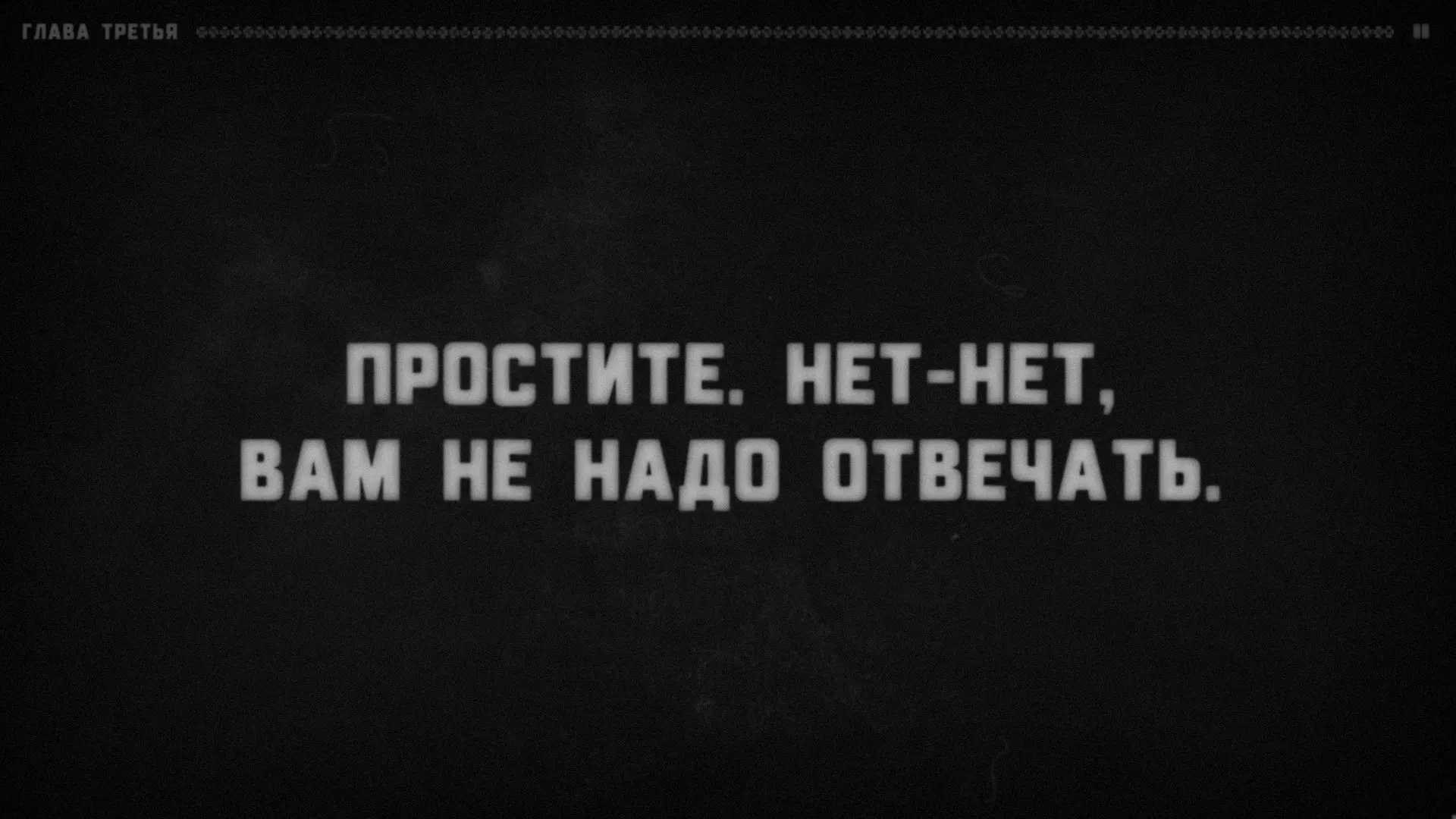 很明显,有某个叙述者在对听众说话,而听众的角色由玩家扮演。支持这一点的还有成就【Сломанная история】(要获得该成就,需要连续十次接听电话)。叙述者会语无伦次,问道:“我清楚地记得……他绝对没有听到回答!我说到哪儿了?”——然后会哗啦哗啦地翻着纸页,说道:“看来得从头开始了”——接着便会重新从第一章开始。注意:他正在翻页。显然,这意味着叙述者正在朗读一个已经写好的故事。或许偶尔会给听者选择的权利(否则故事怎么会在上述“结局”处“中断”呢?不太可能是它自己中断的)。难道你就是叙述者?巧合实在太多了。我们确切知道三件事。