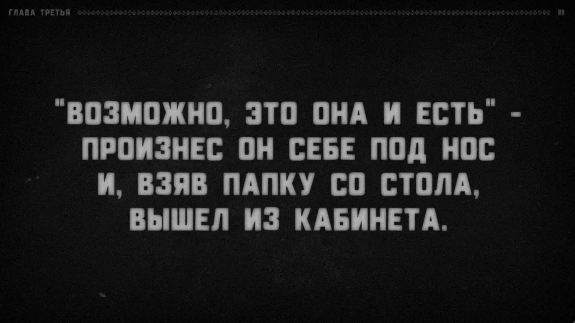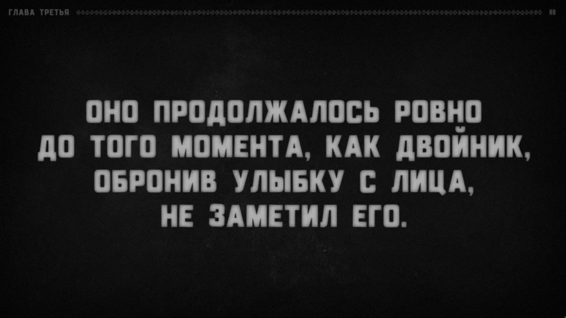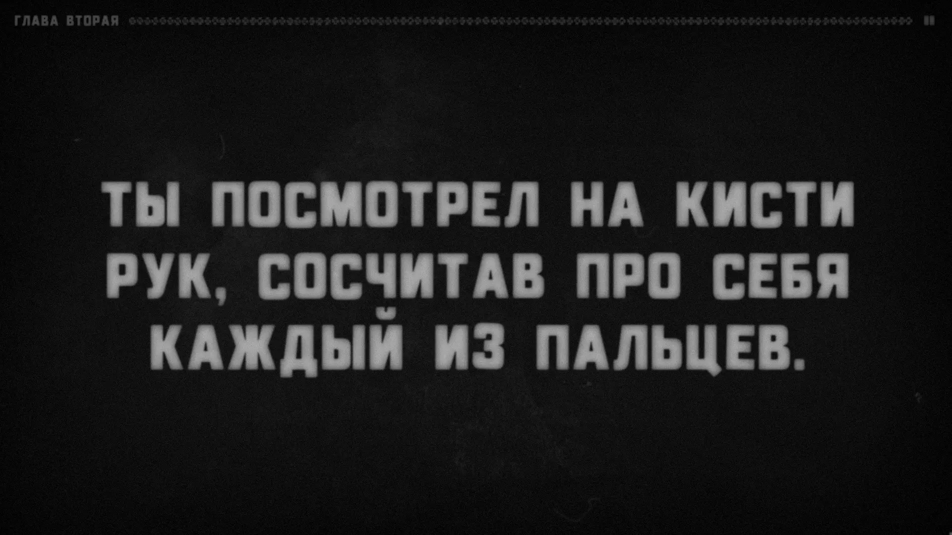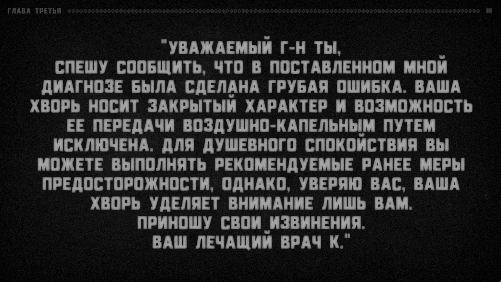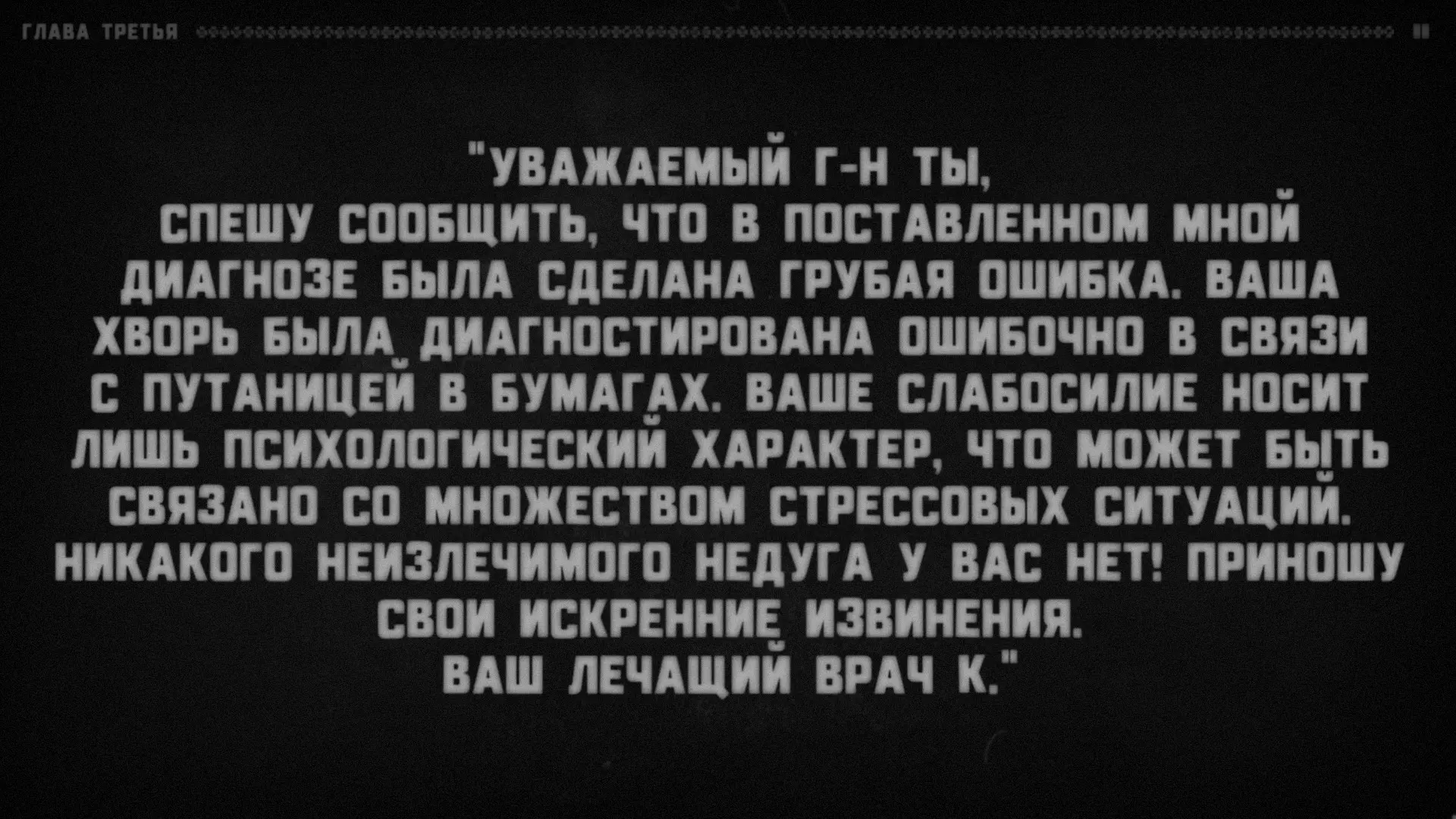 很明显,有某个叙述者在对听众说话,而听众的角色由玩家扮演。支持这一点的还有成就【Сломанная история】(要获得该成就,需要连续十次接听电话)。叙述者会语无伦次,问道:“我清楚地记得……他绝对没有听到回答!我说到哪儿了?”——然后会哗啦哗啦地翻着纸页,说道:“看来得从头开始了”——接着便会重新从第一章开始。注意:他正在翻页。显然,这意味着叙述者正在朗读一个已经写好的故事。或许偶尔会给听者选择的权利(否则故事怎么会在上述“结局”处“中断”呢?不太可能是它自己中断的)。难道你就是叙述者?巧合实在太多了。我们确切知道三件事。