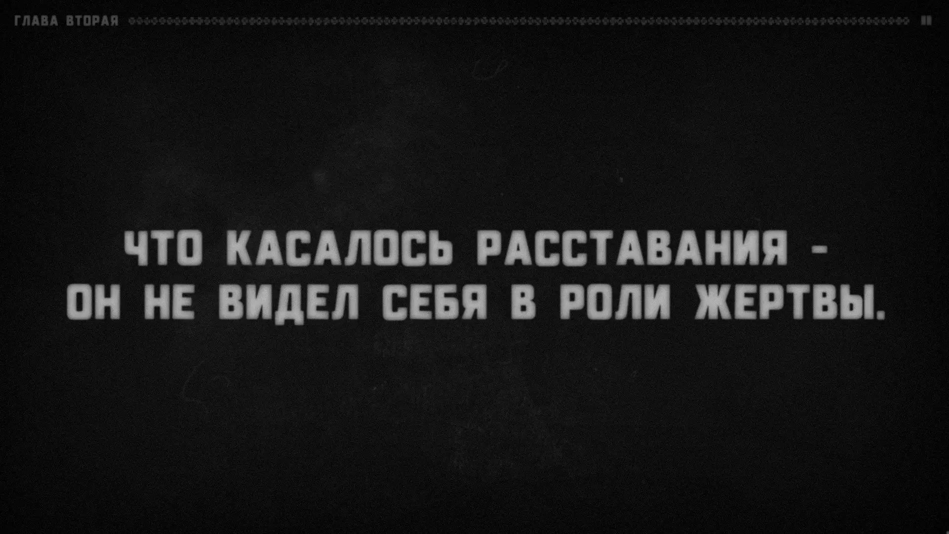 II. 逃离现实 我给这部分取这样的标题有两个原因。 其一,是“你”曾说过的话,我答应过之后会再回来谈:“我不确定,但我觉得在文本中想要杀死主角的愿望,根源在于试图将所描述的情境与真实的自己隔离开来。” 我觉得“你”太含蓄了。比如,现实中他经历了分手,但心里却总被“如果……会怎样?”这样的念头折磨着。他一直被一个念头困扰着:如果当初他恳求达莉娜留下,会发生什么。于是他写了一个故事,在故事里他做出了不同的选择。我为什么选择【来自过去的问候】这个结局作为例子呢?因为在这个结局里,你死了。毕竟,这样更容易说服自己,你所做的一切都是正确的。而在第二章,他带着自己从未把自己视为受害者的想法入睡了。
