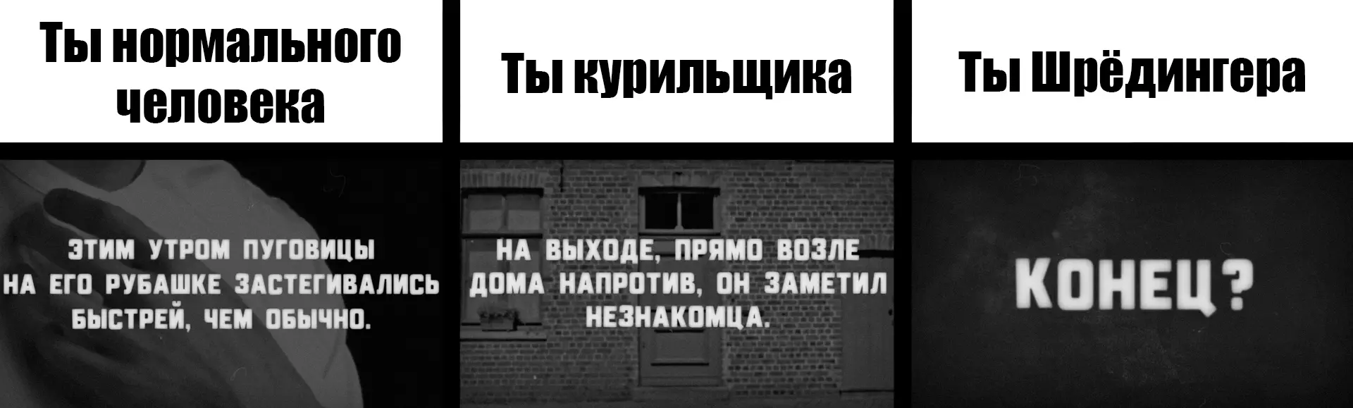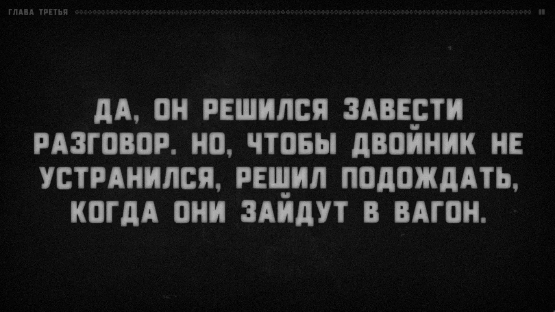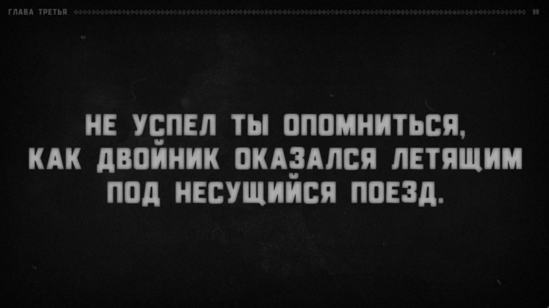 这条路将他们引向车站,我不禁想起“跳上最后一节车厢”这句话,仿佛“你”还在执着于那错失的机会,不愿接受它已不复存在的事实。正如我们所知,他最终一无所获。出于嫉妒,你将自己的分身推下了火车——但由于情绪激动,你并未理解甚至记不清自己的行为,只看到他摔向了车轮。而当意识到自己亲手毁掉了与达里娜的幸福家庭生活时,你从噩梦中惊恐地醒来(当然,经历了这样的事,他感觉很糟糕,所以才觉得“当他闭上眼睛时,疾病最为肆虐”)。