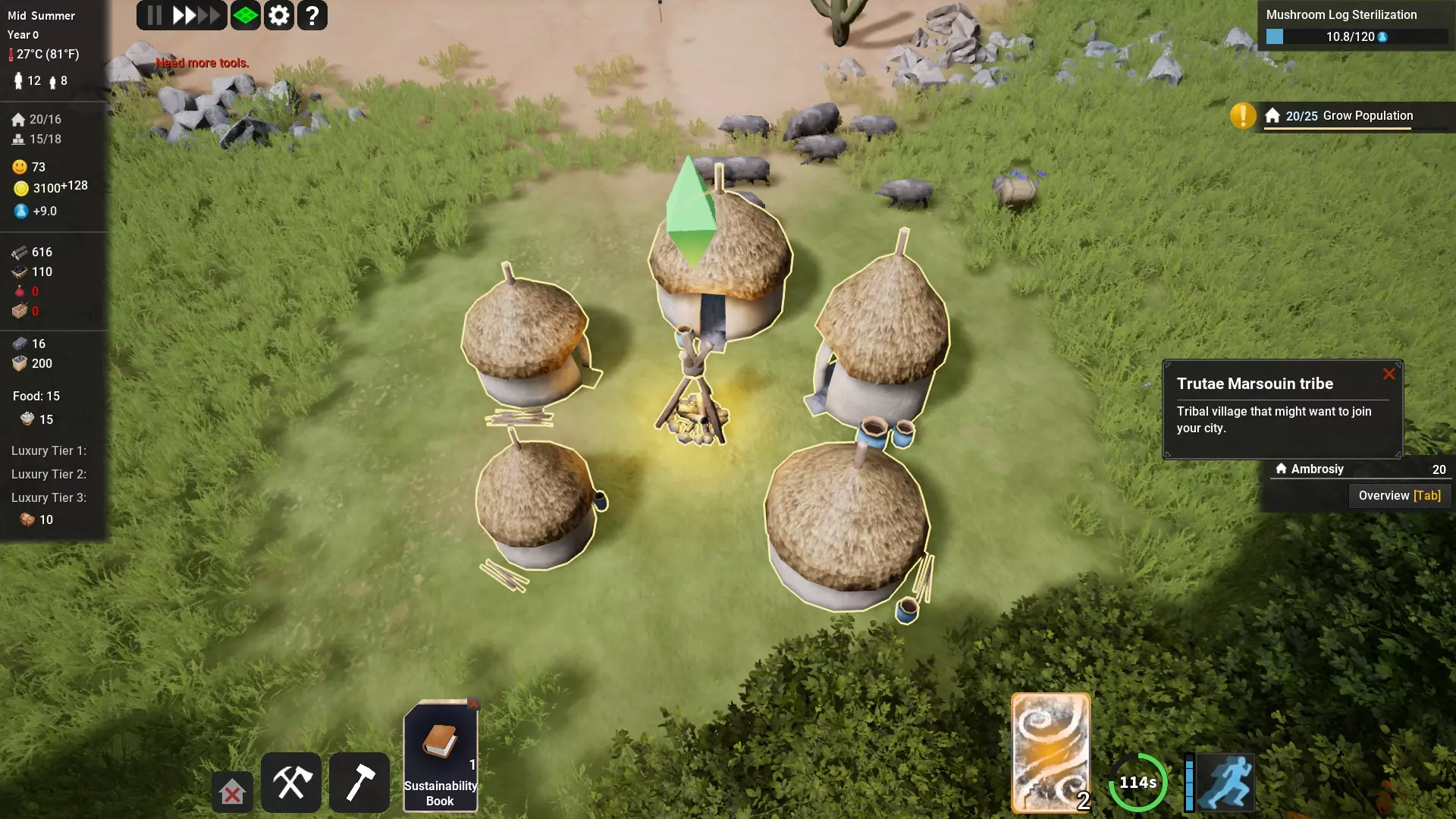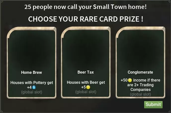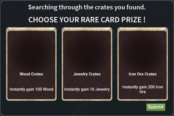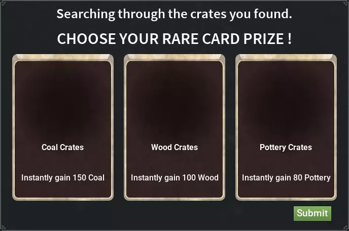 +100木材+150煤炭,没什么特别的。 +80陶器,如果你还没有奢侈品,升级房屋到2级时很有用。 +10珠宝,你可以以700-800金币的价格出售。 +200铁矿石,如果你建造了熔铁炉,这是最佳选择。200铁锭×19=3800,扣除25%的税收后为2850。如果你能找到并在熔铁炉卡片中放入【可持续发展之书】,那么你将获得330×19,扣除25%税收后为4700。 完成右上角的任务,你还将获得奖励卡片。