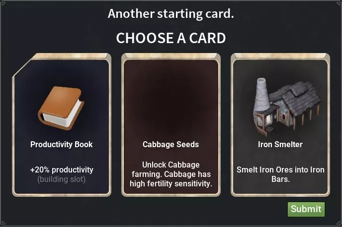 小麦种子是一张不错的卡牌,如果你定居在河流附近或肥力良好的区域,但如果你现在不选择它,之后在常规抽卡中仍有机会购买。如果你还是选择了这张卡,那么你需要立即建造农场,以便工人有时间播种田地。 投资,前三张卡牌中最好的一张,每150秒产出30金币,可放入市政厅的全局槽位,并且随时可以以300金币的价格出售。 贸易站,初期相当无用的卡牌,因为你通常没有东西可卖。可以通过一级科技【对外贸易】解锁。 第二套:生产力之书、卷心菜种子、炼铁厂