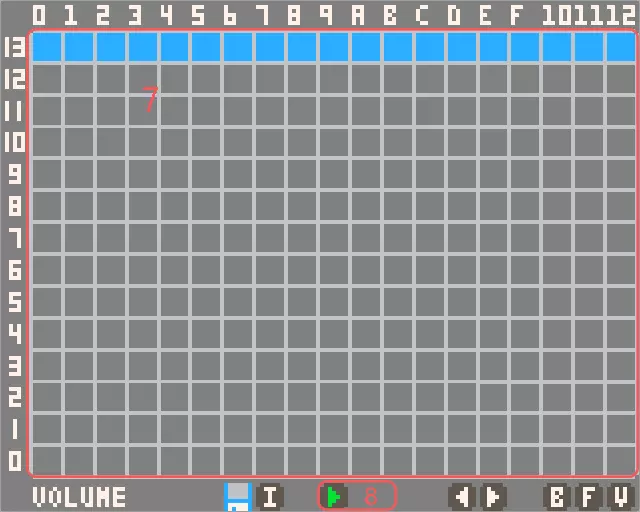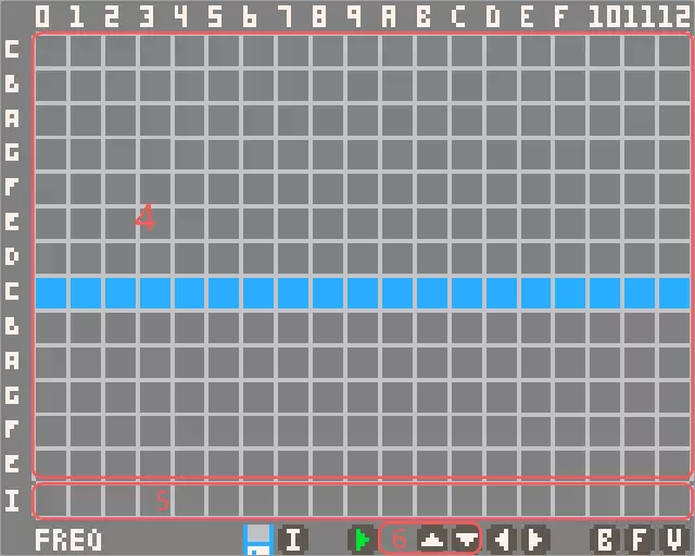 左键点击区域(1)中的网格可选择每个效果节点的波形类型,支持正弦波、方波、三角波、锯齿波和噪音波。序列的播放方向为沿水平轴从左到右。左键点击区域(2)中的网格可更改每个节点的间隔。一个效果最多可包含256个(0至255)节点。使用左右方向键或区域(3)中的按钮进行水平滚动。 在区域(2)中保留任意间隔为零的节点可结束序列。 点击频率按钮或按F键可切换至音符编辑模式。