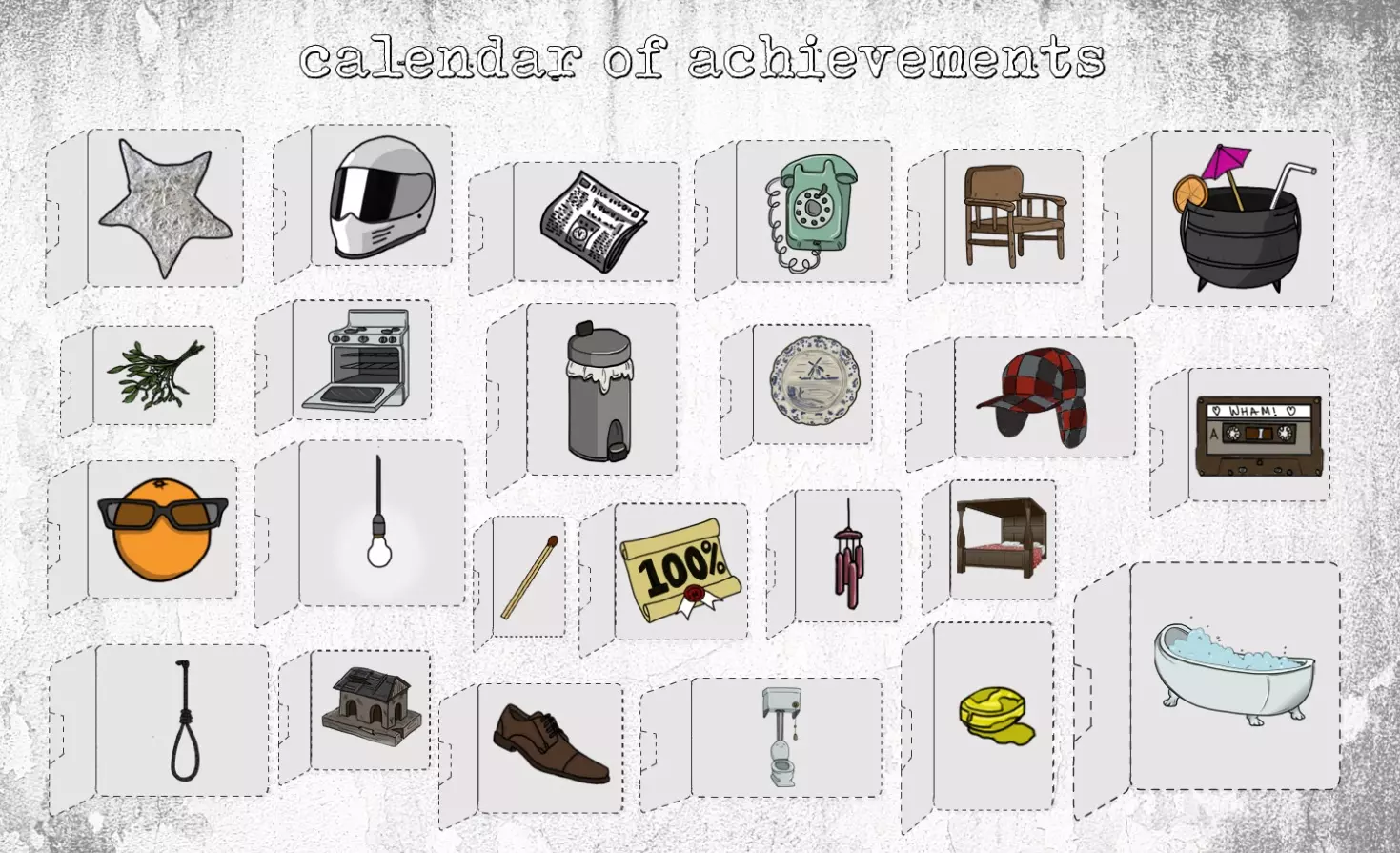 部分成就需要完成游戏才能解锁,而其他成就则无需如此。这款游戏流程较短,且部分成就需在特定时刻获取,因此建议在完成成就列表前进行【保存】,并通过指南查看【提示】。 1. Great Scott:阅读报纸,寻找《回到未来》的彩蛋。 2. Kiss me quick:挂上槲寄生。 3. Cough cough:将糖果放入锅中。 4. Don't feed the birds:尝试在后院对鸟屋使用物品。以我为例,使用电线时会触发“我不能那样使用它”的提示信息。 5. Agent orange:与厨房中的橙子互动。它和其他水果放在一起,但只有当锅放在炉灶上后,你才能点击它。 6. Mixologist:在锅中调制热红酒。 7. Dutch Blue:查看并尝试拿走所有盘子。8. 点燃我的火焰:点燃客厅里的火。 9. 卧室能手:触发卧室幻象。 10. 烤箱里的惊喜:触发厨房幻象。 11. 洗漱完毕:触发浴室幻象。 12. 四处闲逛:触发客厅幻象。 13. 混合一下!:从车里拿起威猛乐队的磁带。 14. 废物管理顾问:移动垃圾桶后,查看里面的东西。 15. 厕所幽默:查看马桶以阅读一个冷笑话。 16. 艺术与手工:装饰圣诞树。 17. 我是伐木工:砍倒一棵松树和一个树桩。 18. 你要给谁打电话?:尝试使用电话两次,一次在白天,另一次在断电时。 19. 谁是比尔?:同时打开所有的灯。 20. 晚安,维尼亚:醒来后,在断电时尝试所有的电灯开关。 21. 呼叫洛夫乔伊:弄坏椅子。叮叮当:在后院触碰风哨三次,穿过厨房的一扇门。 23. 顶级装备:与车内所有物品互动。 24. 收集达人:获取其他所有成就。
