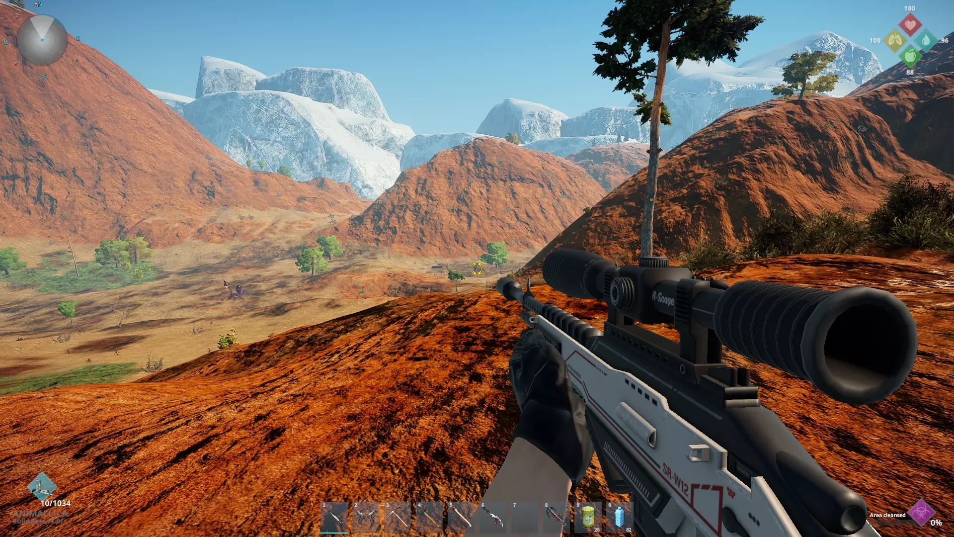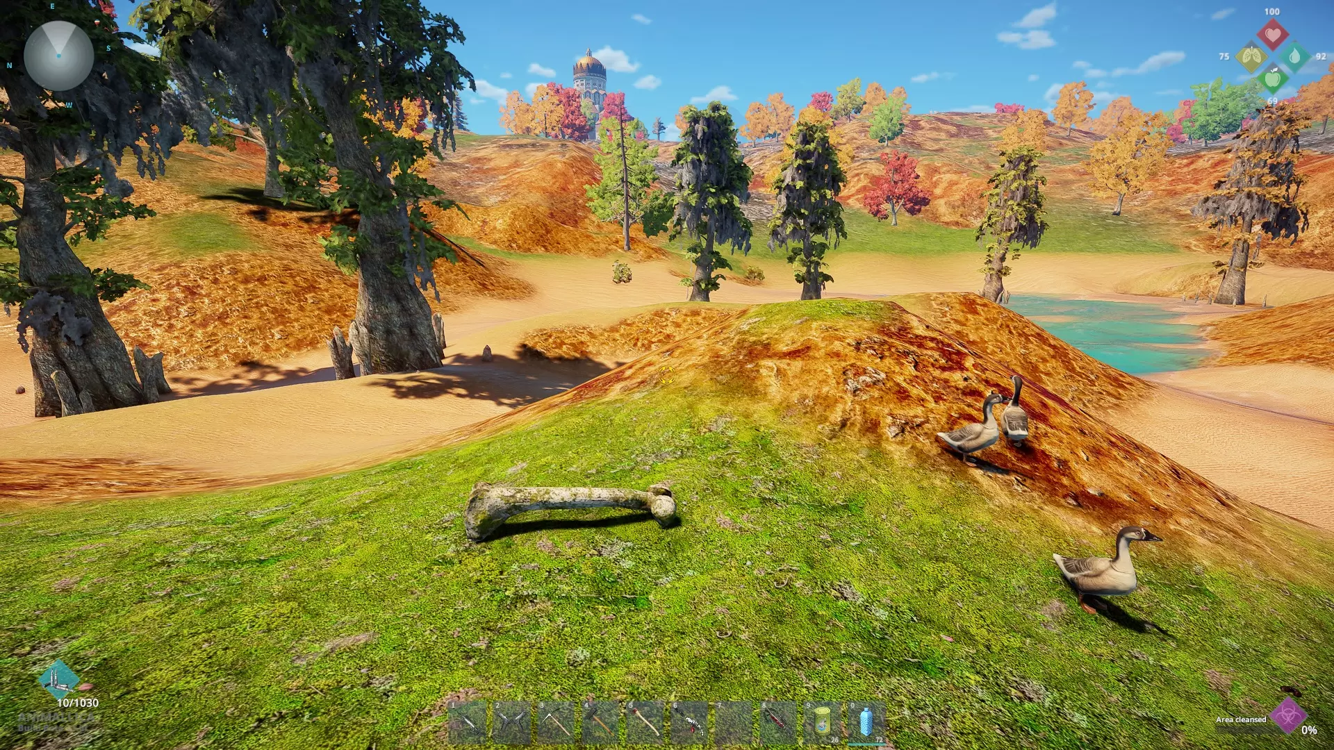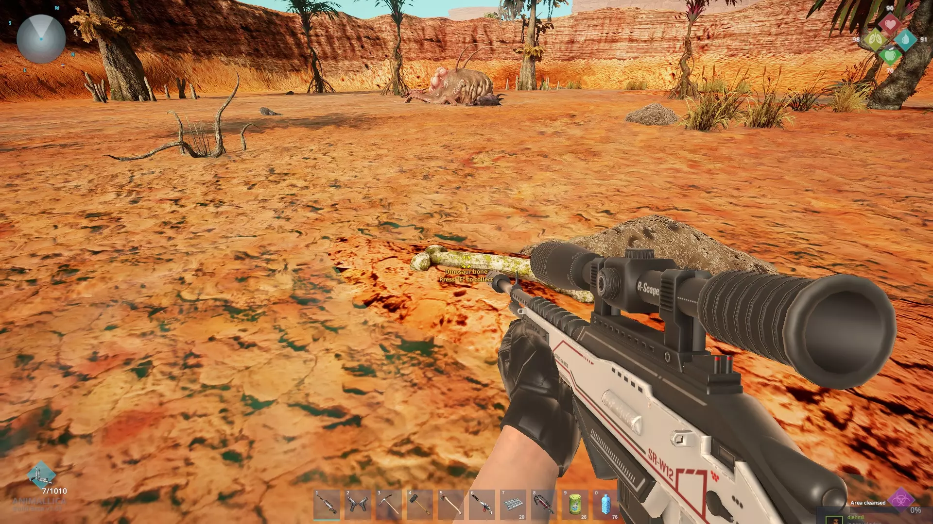 解决掉它们之后,骨头就躺在水中的一个小土堆上(如果你看不清楚,就在步枪的瞄准点位置)。为了方便参考,变异体生成器被保留了下来,哈哈。