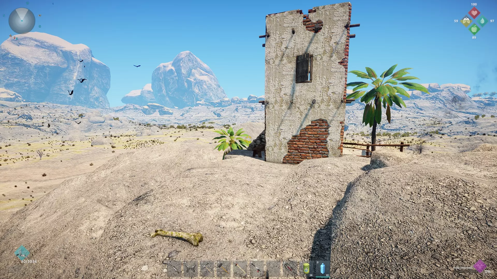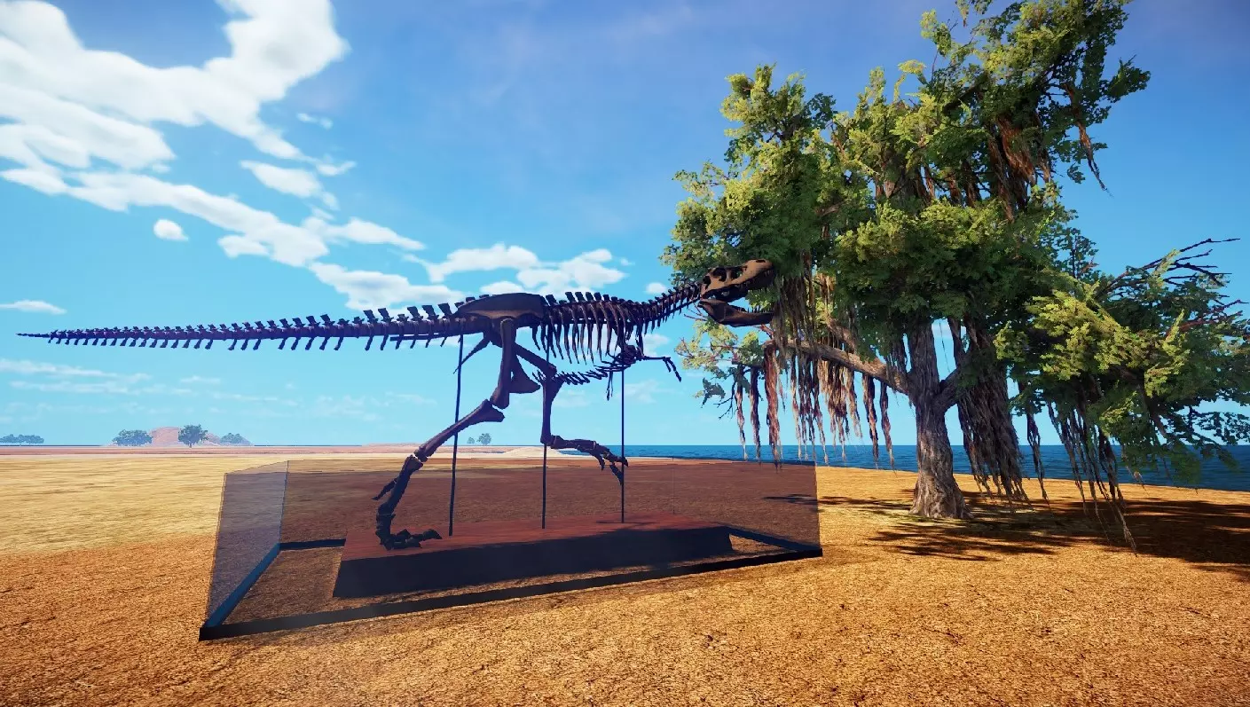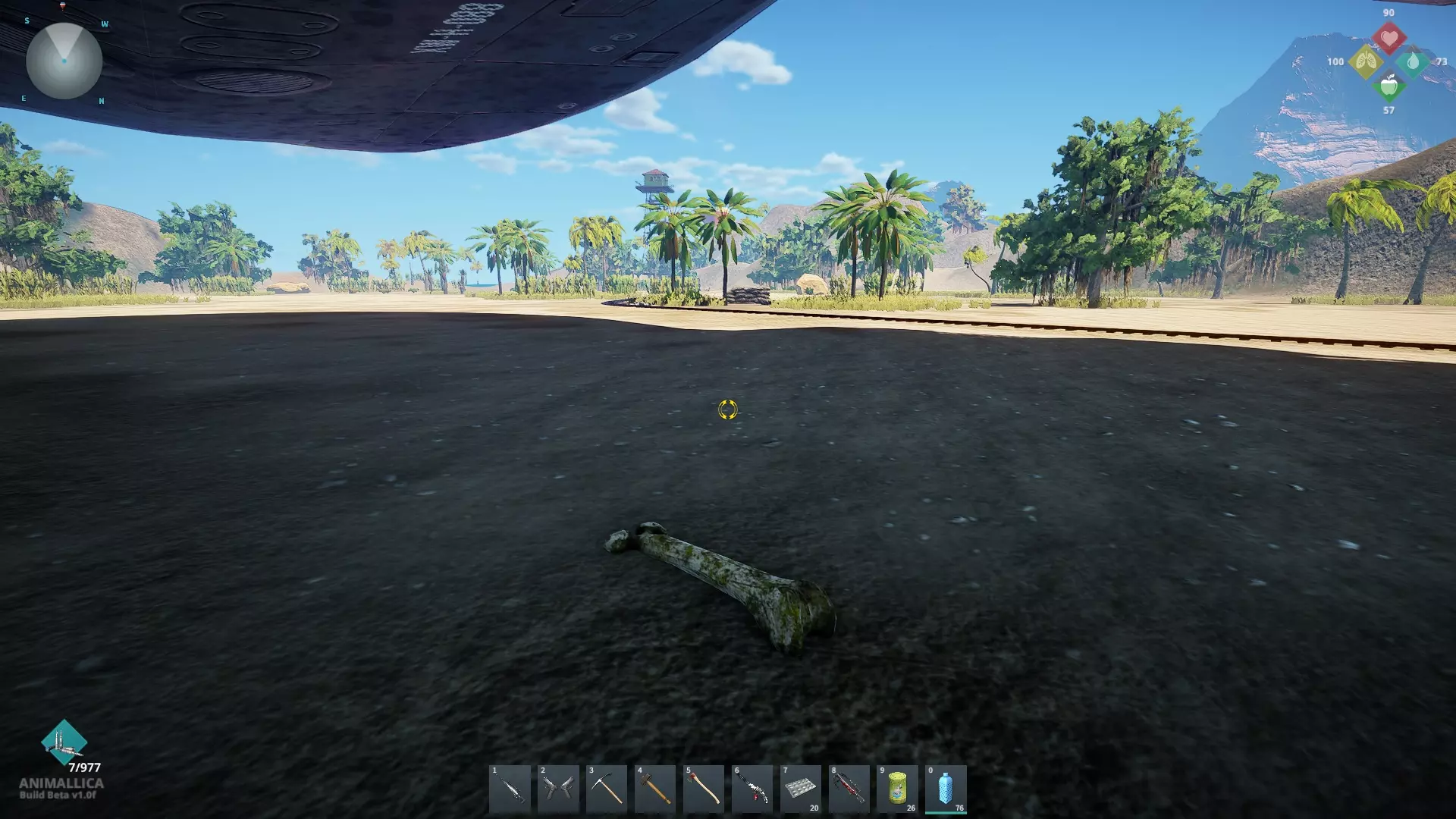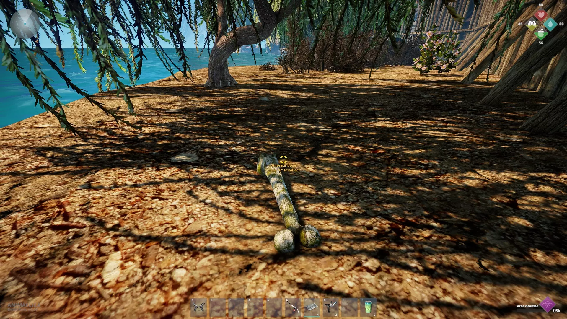沿着农场右侧的小路前行,那里有一棵可搜刮的棕榈树,恐龙骨头就在它旁边。