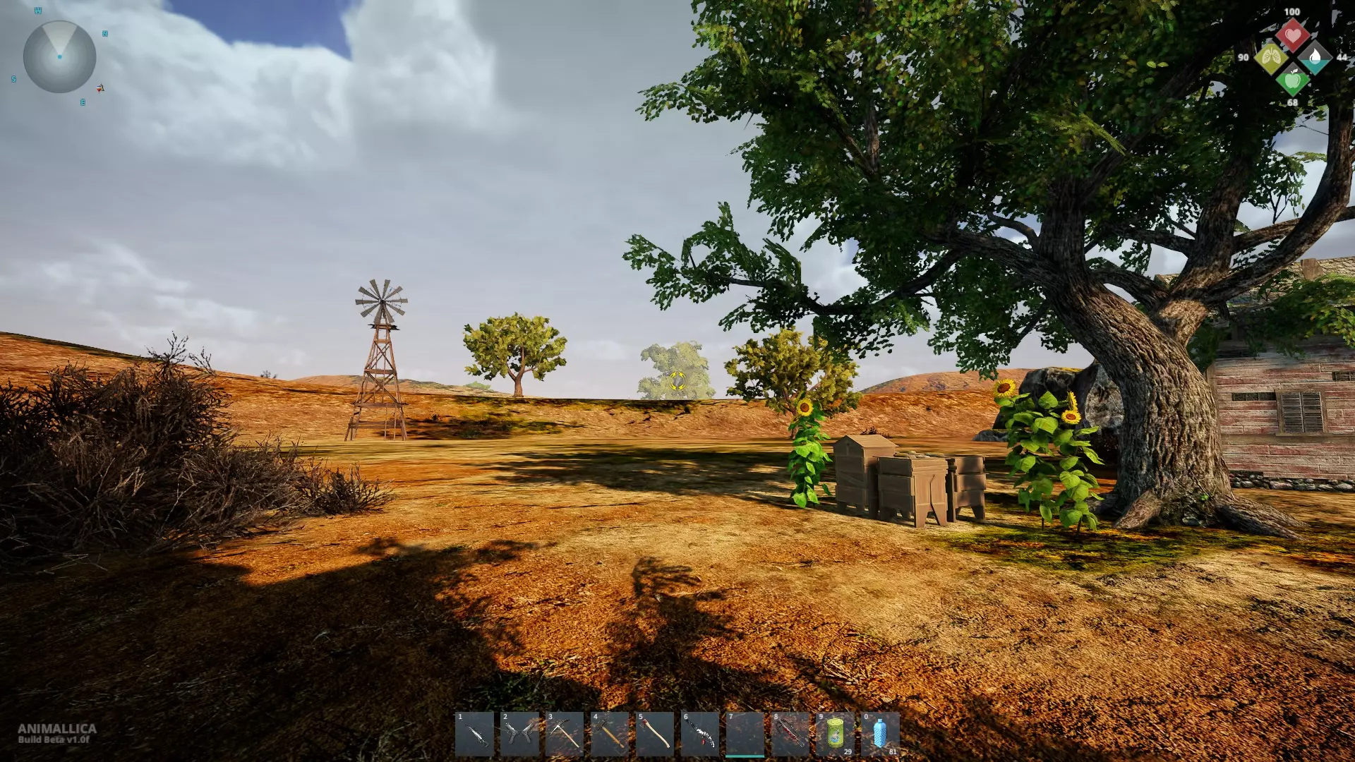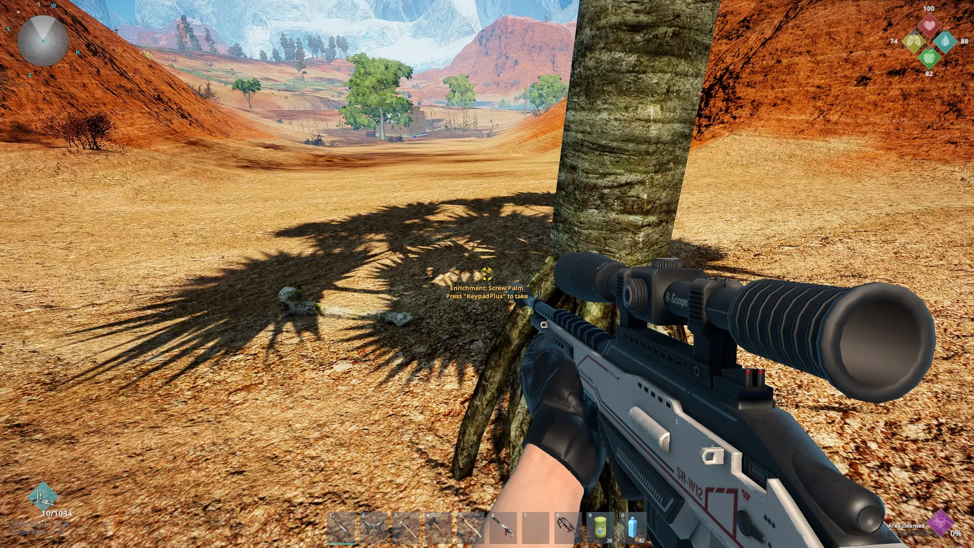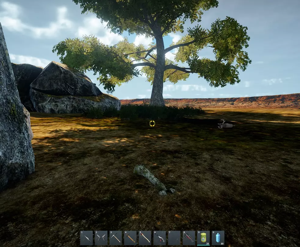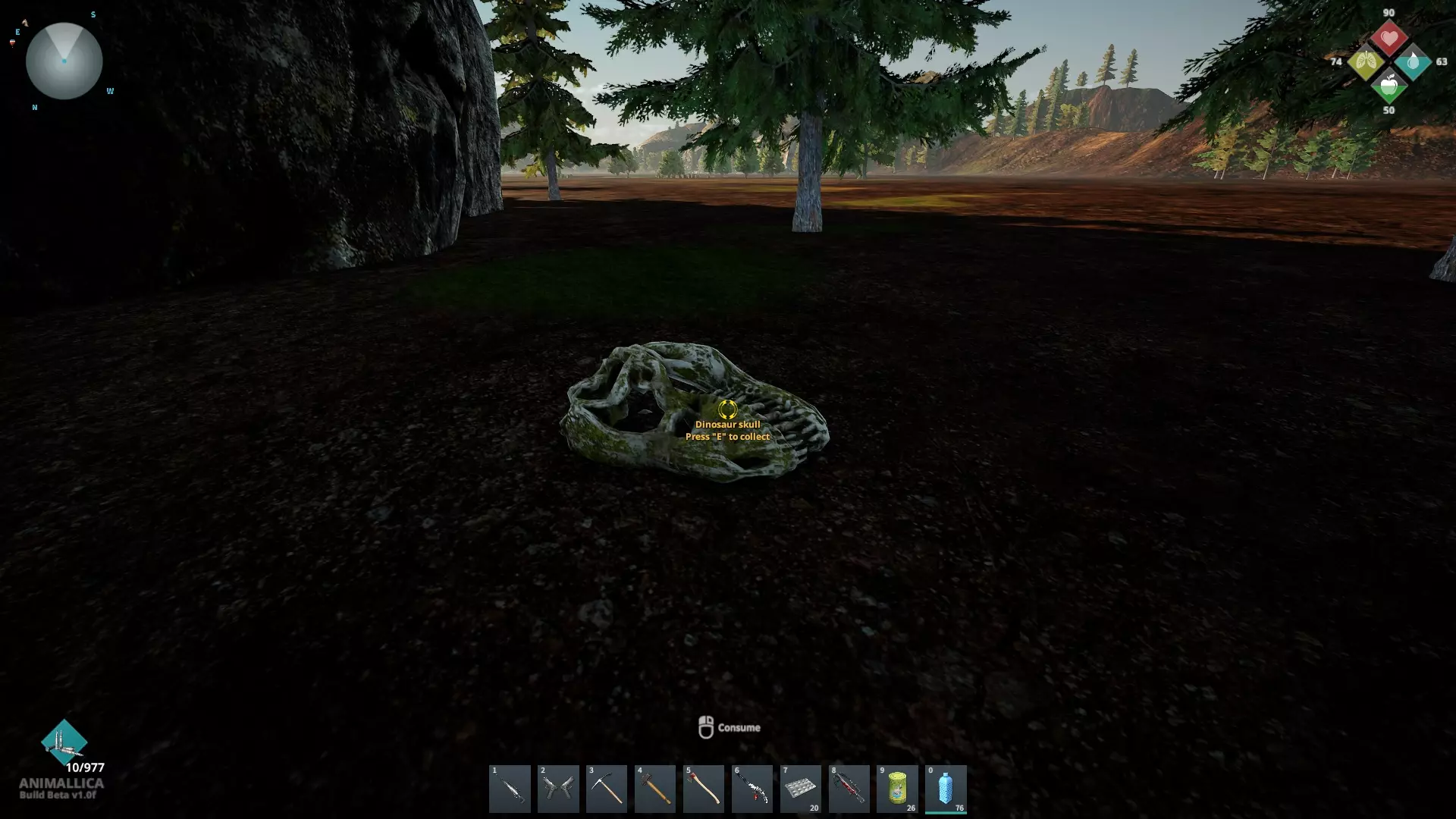 沿着农场右侧的小路前行,那里有一棵可搜刮的棕榈树,恐龙骨头就在它旁边。