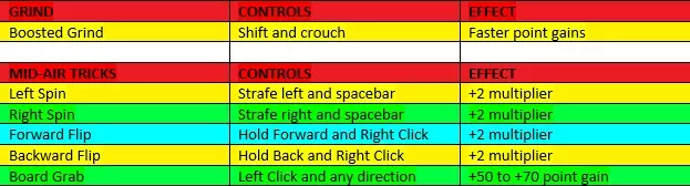 本质上,你需要沿着圆形轨迹(向左或向右皆可)进行滑行,并在每四分之一圈时跳过障碍物,同时在空中完成技巧动作。 滑行序列:在栏杆上滑行。按住蹲伏键,同时轻微转动鼠标。 跳过障碍物:跳跃(空格键/按住空格键后松开)至障碍物上方。 空中动作:旋转(空格键)、向前翻转(向前键+右键)、旋转(空格键)。 重复以上步骤。 提示:按住蹲伏键蓄力跳跃可获得更长滞空时间。更长的滞空时间能让你在一次跳跃中完成更多技巧。 不要跳得过高,以确保能成功跳过下一个障碍物。 你可以在空中尽可能多地连续使用旋转(空格键)和向前翻转(向前键+右键)。 在落到栏杆上之前开始按住蹲伏键,以确保成功滑行。让每个技巧成功判定后再进行下一个。右下角的第二个数字会在每次技巧成功判定时增加2。 连击完成:注意右下角的数字,等待总分达到3000(你需要在脑中快速计算)。