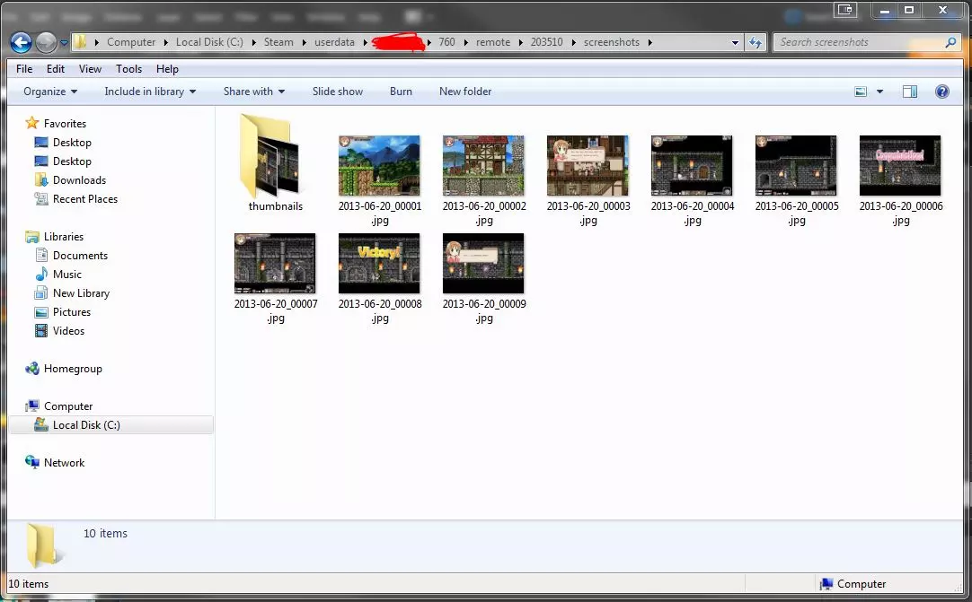 然后你需要保存该图片的精确副本,只需将其宽度缩小到200像素,并将其保存在你保存修改后截图的文件夹内的一个子文件夹中,子文件夹命名为thumbnails(无需引号)。 上传至Steam: 首先你需要找到你的Steam截图目录,这可以通过进入其他游戏的截图上传界面,然后点击显示在磁盘上来找到。它会带你进入包含截图的文件夹。然后你需要进入特定游戏截图所在的remote文件夹。进入后,你应该会看到许多带有数字的文件夹。创建一个名为【203510】的新文件夹。这是游戏的特定编号,可通过进入商店页面并查看游戏URL找到。
