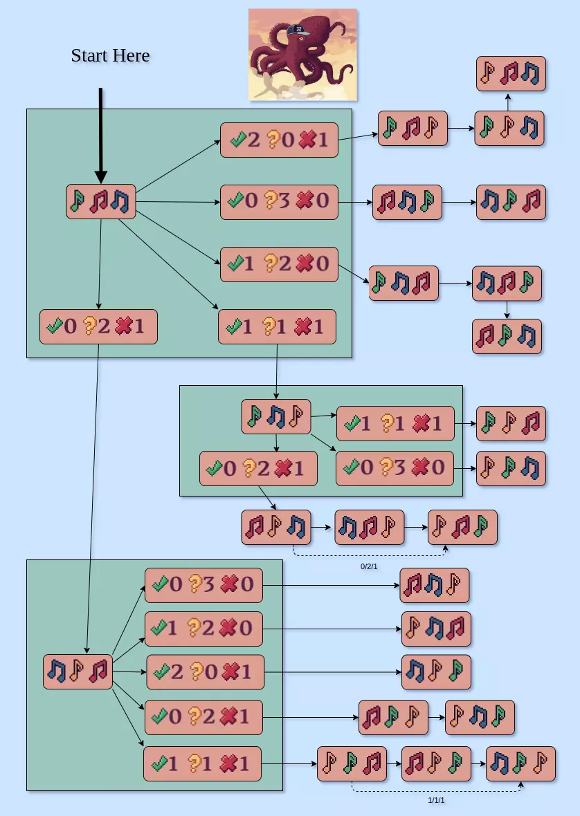 谜题 要解开这个谜题,你必须在不超过五次的尝试中猜出由三个音符组成的序列,且序列中的音符不能重复。 每次猜测后,你会得到以下提示: ✅ - 表示最近一次猜测中有多少个音符位置正确。 ❓ - 表示猜测中的多少个音符出现在答案中,但位置不同。 ❌ - 表示猜测中的多少个音符未出现在答案中。 使用本指南时,你可以始终以【绿色】、【红色】、【蓝色】作为初始猜测,然后按照流程图操作。这能确保你在五次内解开谜题。 由于用完五次猜测也不会有任何后果,为简单起见,当剩余猜测次数足够时,此流程图会采用“暴力破解”的方式找出答案。