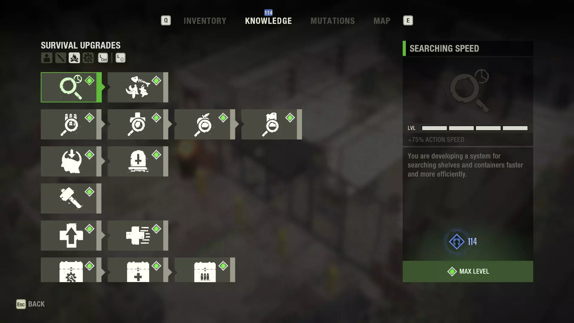 搜索速度:4级/满级时+75%行动速度/高优先级 这款游戏在很大程度上围绕时间以及你选择如何管理时间展开。拥有充足的时间是好事,时间短缺则是坏事,比如用时间来赌取资源,或者花费资源来获取时间等等。虽然我不会建议你将此作为首个学习的知识,但启用它后你会感受到明显变化,减少在已发现容器上浪费的搜索时间将帮助你找到更多其他物品。 搜寻:4级/提高从感染者身上获取战利品的几率/高优先级 很难量化这项技能相比基础状态能带来多少提升,但考虑到我经常能从敌人身上找到电池、弹药和装备,我认为这是一项值得的投资。游戏鼓励你击杀感染者,虽然并非必须,但击杀获得奖励是显而易见的。不过,如果你觉得没必要,就不要选择这个。 弹药搜寻:4级 / 满级时发现更多弹药的概率+100% / 优先级非常高 我早期的游戏进程常常因缺乏有效应对威胁的弹药而受阻,而这个技能缓解了这一问题。虽然你可以仅用近战武器通关,但我不建议这样做,因为两种武器类型都很重要且有用。后期有些敌人近战攻击非常危险,能够射击可以让你避免过早死亡。医疗搜刮:4级 / 满级时发现更多药品的概率+100% / 中等优先级 我觉得在学习这个技能前,找到药品的概率就已经足够了,学会之后药品简直多到用不完。当然,药品多总不是坏事,但建议之后再点这个技能。 食物搜刮:4级 / 满级时发现更多食物的概率+100% / 低优先级 游戏中的食物不会恢复饥饿值,而是恢复最大耐力值。虽然保持较高的最大耐力值很重要,但我觉得基础食物的获取量并不少——感觉是足够的。点了这个技能后,食物会多到泛滥,我认为它的优先级甚至比药品还低。具体情况可能因人而异。燃油搜寻:4级 / 满级时发现更多燃油的几率+100% / 高优先级 燃油是你在各区域间移动的关键,缺少燃油意味着要在死亡区域浪费时间寻找更多燃油。虽然在这里你能获得一些额外的感染样本,但通常风险不值得,浪费的时间更宝贵。找到更多燃油能让你保持油量充足,减少被困的几率。 知识留存:4级 / 提升知识获取量 / 极高优先级 我必须强调——先点这个技能,再考虑其他任何技能。它能让你总体获得更多知识,我甚至不明白为什么会有这样的技能存在,因为这显然是必点的。生存心得:4级 / 满级后死亡可获得+30%经验值加成 / 低优先级 坦白说,我无法确定这个技能会在何时、何地以何种方式产生效果。经验值似乎会影响军械库补给中可购买的物品,所以虽然说它没什么坏处,但我不能保证你是否应该优先选择它而非纯粹的生存能力。尽量尽早获取它,这样它能发挥最大作用——你的等级上限是100级。 武器耐久:4级 / 满级后近战武器耐久度+50% / 高优先级 当你耗尽弹药,或者没有合适的枪支来使用你拥有的弹药时,近战武器就是你的全部依靠。让它们更耐用总是好的。早期的近战武器大多不怎么样,比如木板和折叠刀,但像齿轮斧、嗜血刃和指节刀这类武器,在损坏前拥有更高的耐久度会非常受益。 急救:4级/满级时治疗效果提升50%/中等优先级 充分利用现有资源从来都不是坏事,但我从不觉得这个技能对我来说是成败关键。它也不会影响你制作的健康恢复物品,绷带的治疗量少得可怜(或者你有很多),而急救包在大多数情况下会造成过量治疗。不过它能提升止痛药的效果,止痛药在战斗过程中的持续治疗相当有用。 快速治疗:4级/满级时治疗速度提升40%/中等优先级 治疗时你会处于无防备状态,有时你必须在战斗中进行治疗。这减少了暴露窗口。不过,我有点希望能进一步缩短冷却时间,比如减少75%而非40%,但即便如此也不算差。具体效果因人而异。 安全屋工程/医疗/武器箱:各1级/中等优先级 这是三个独立的技能,每级都会为之后遇到的每个安全屋添加相应的箱子(不会影响已进入的安全屋)。虽然我不会抱怨有更多获取 loot 的机会,但这些箱子里不一定能开出东西,而且一局游戏最多遇到4个安全屋,平均2个,具体数量取决于选择的路径。这个可以稍后再考虑升级。 工程升级