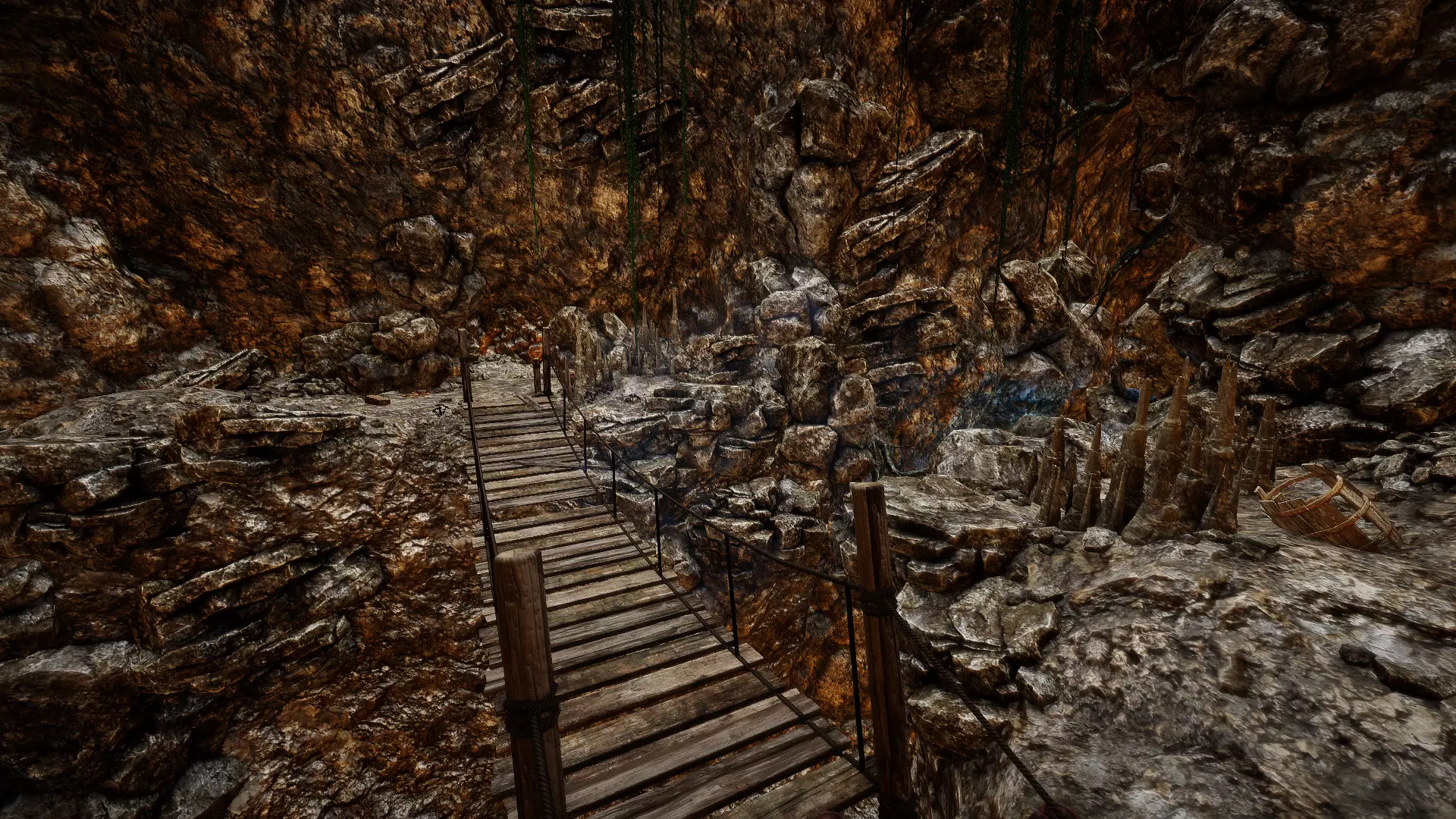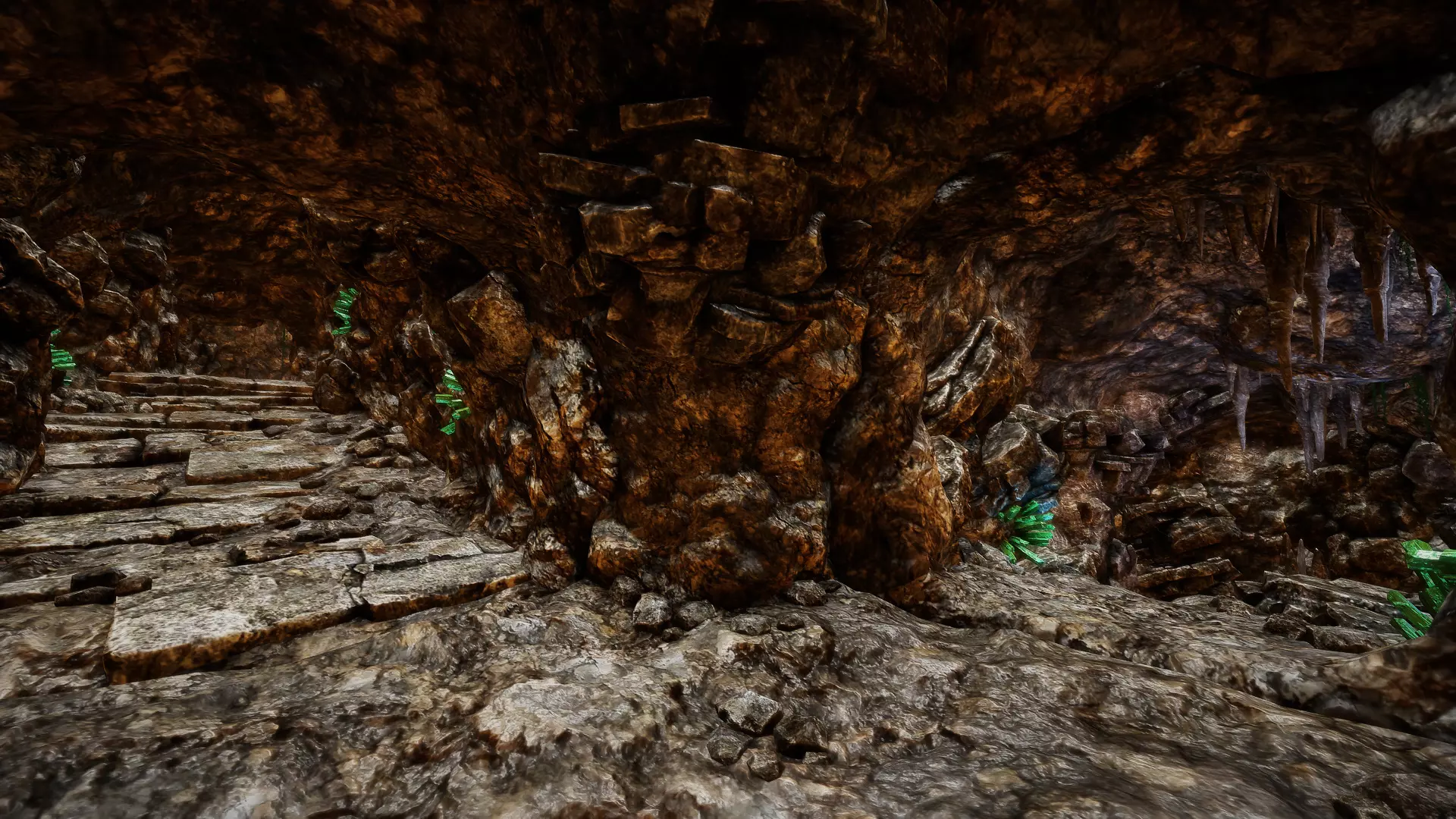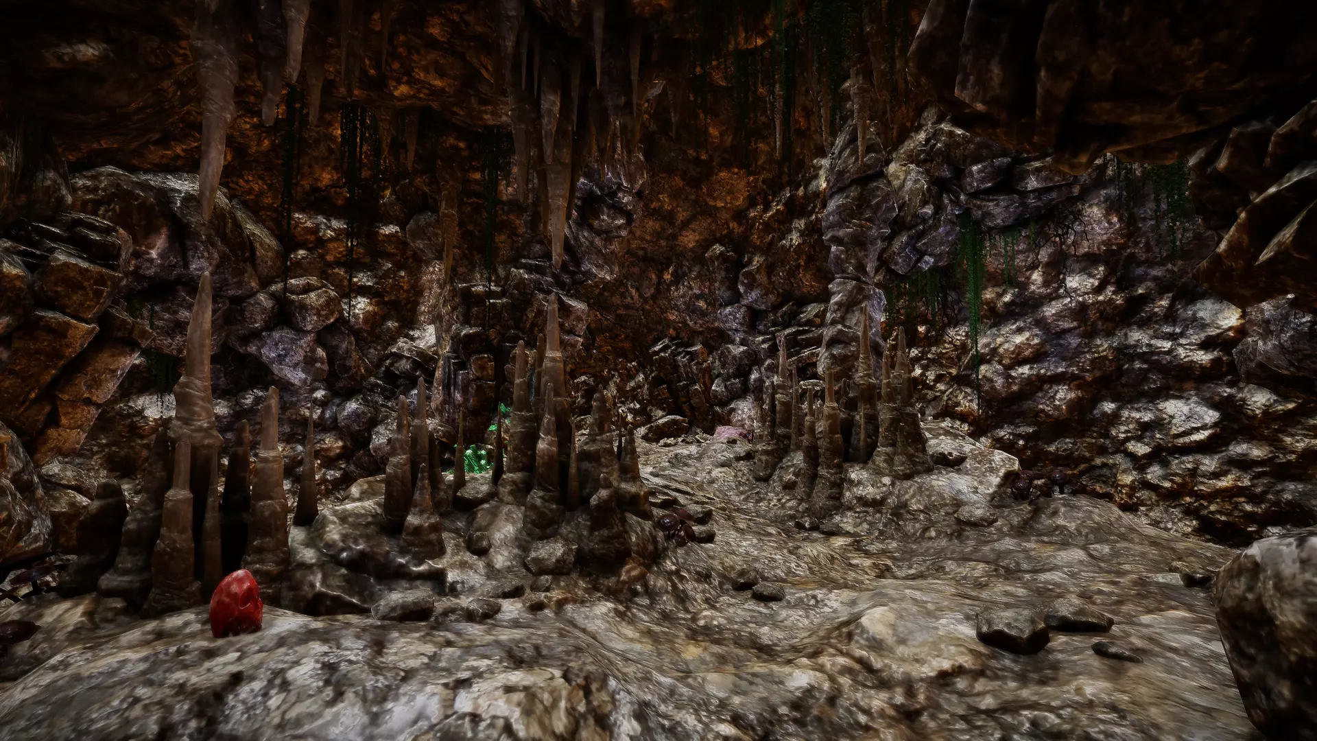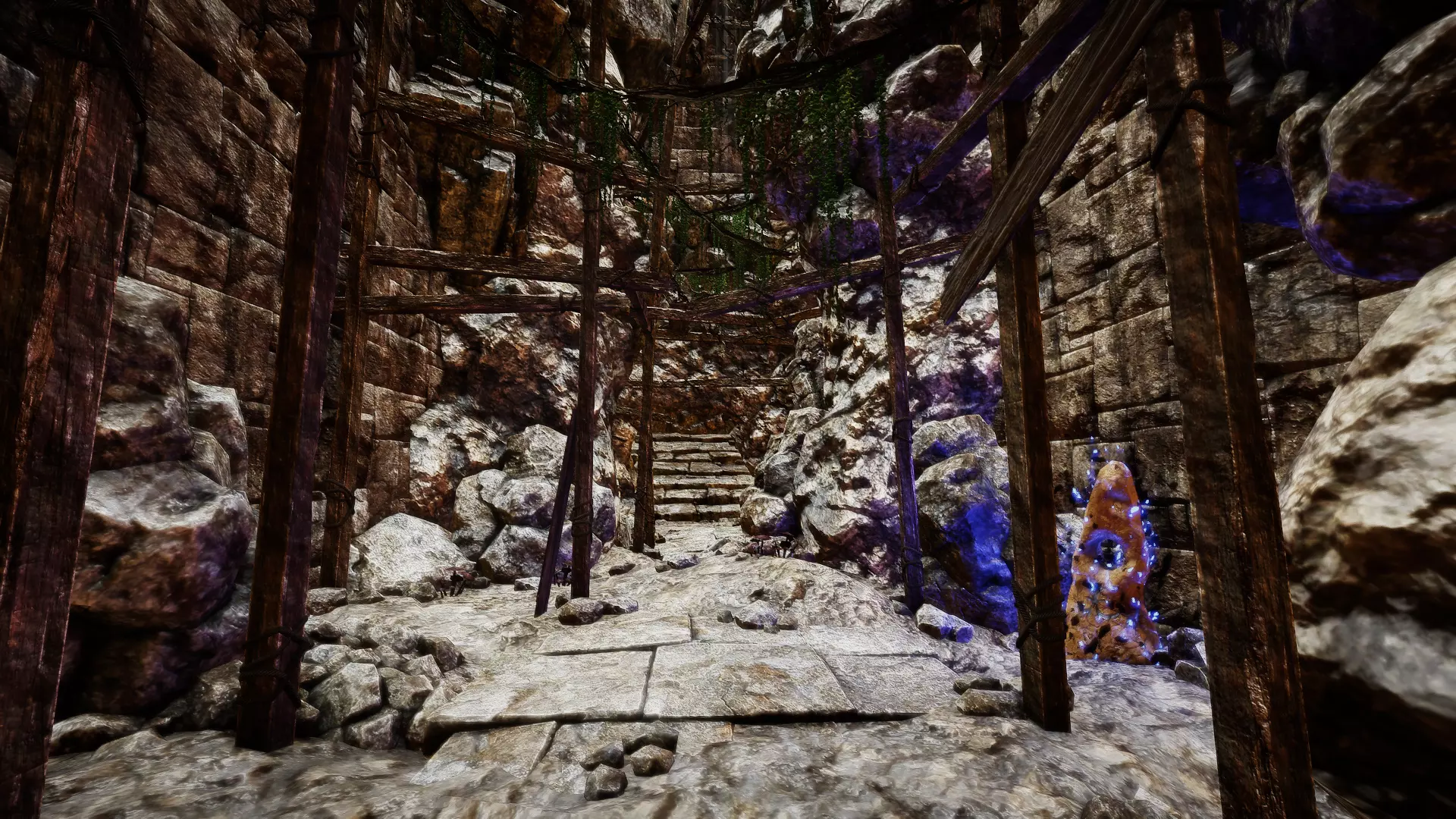 在走廊交叉口直行: 一直往下走。在有楼梯的下方走廊尽头,你会发现一个有几根洞穴石笋和钛矿石的区域。沿着下一条走廊走,很快就会遇到3只恶魔狼,要小心!