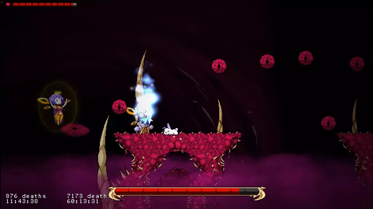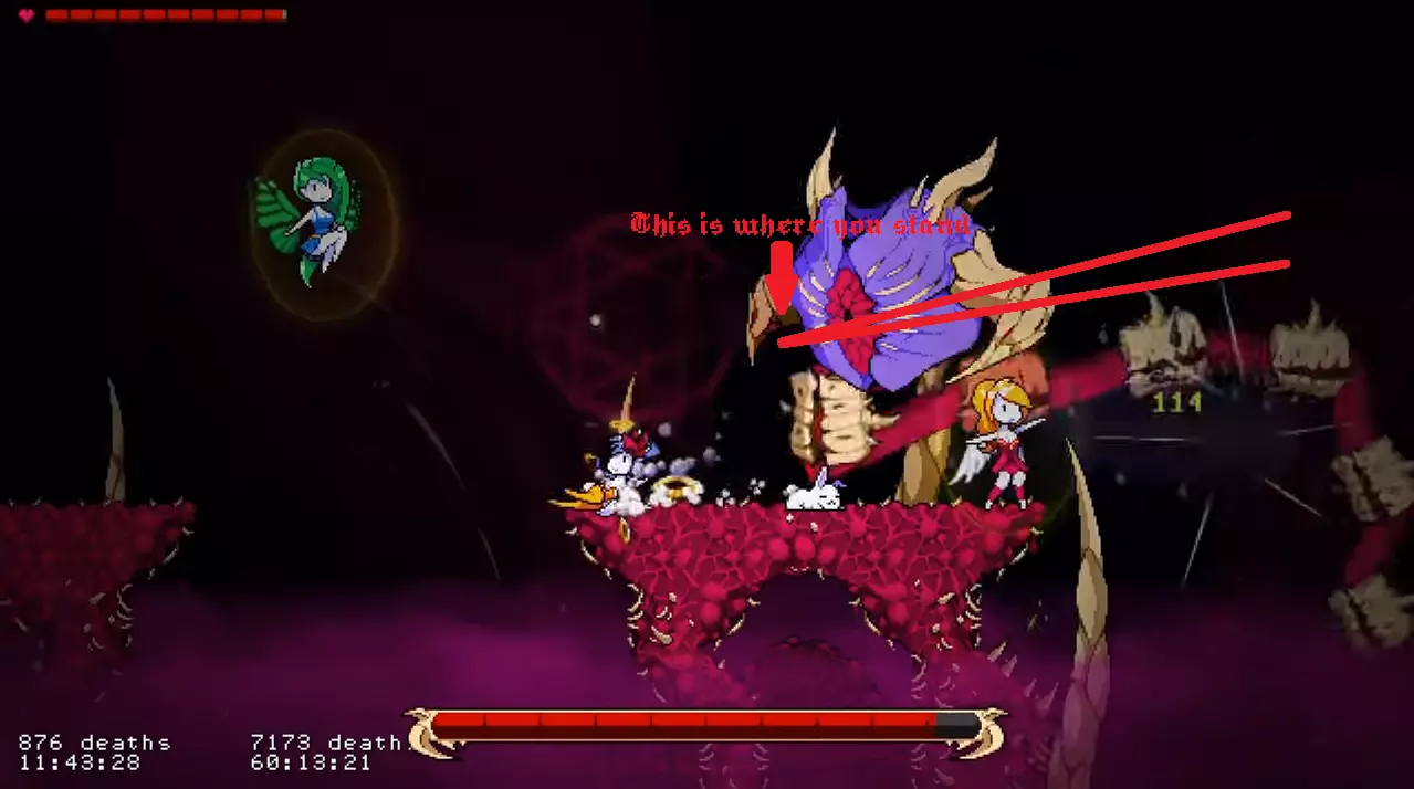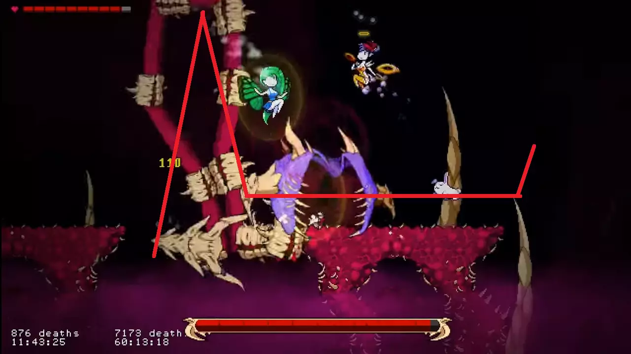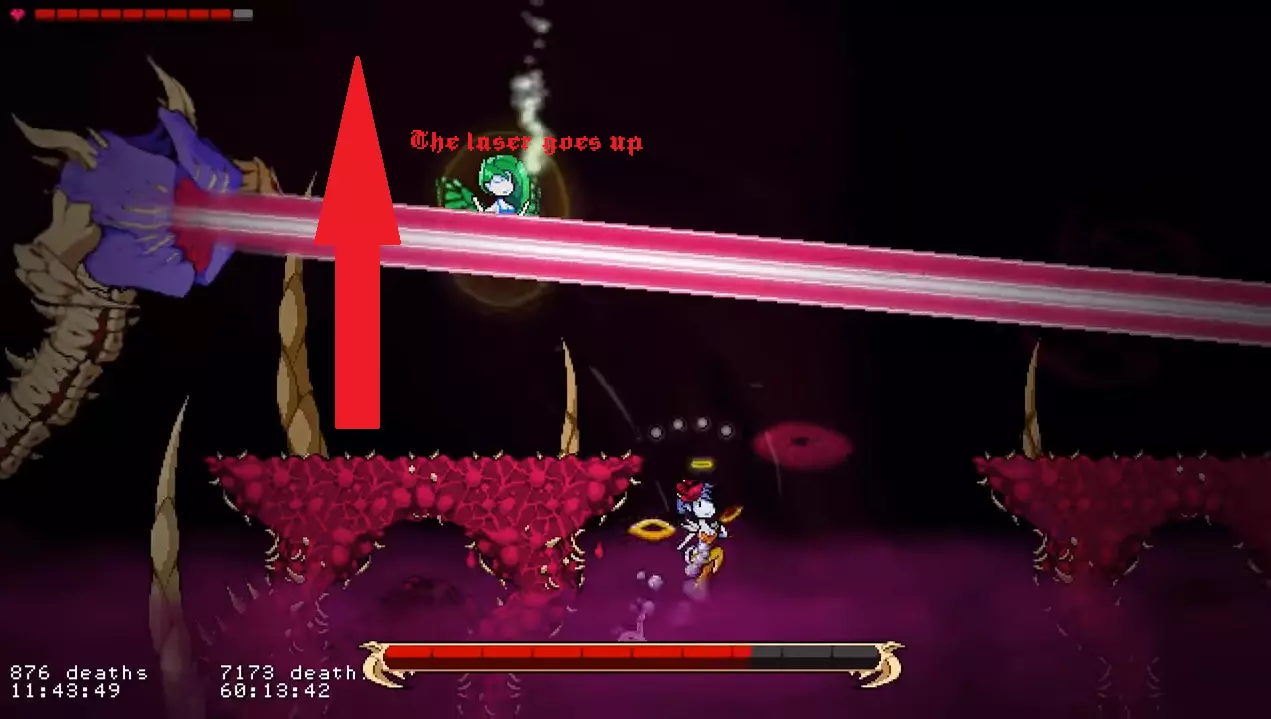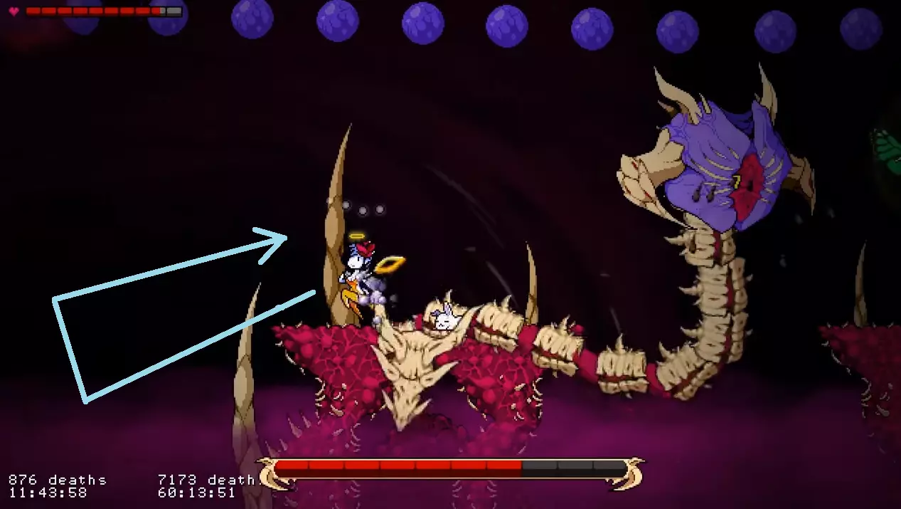 他会从口中发射大量法球。这些法球会在顶部悬浮约3秒,然后迅速落下。 如果你在【天使模式】下游玩,在法球之间的空隙处进行二段跳接滑翔,应该就能避开它们(此方法在【凡人模式】下可能同样适用)。 如果你在【凡人模式】或【恶魔模式】下游玩,按照截图所示远离平台即可。 超级尖叫