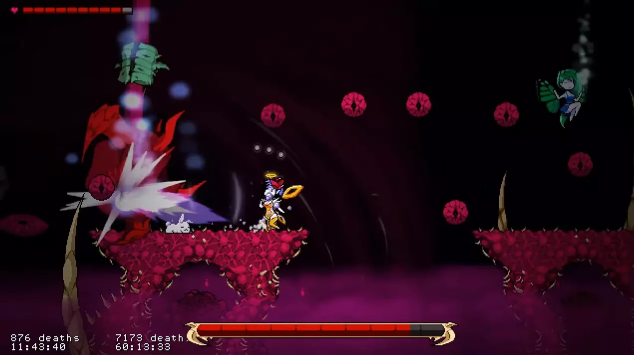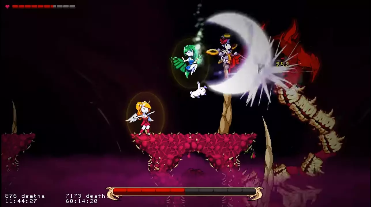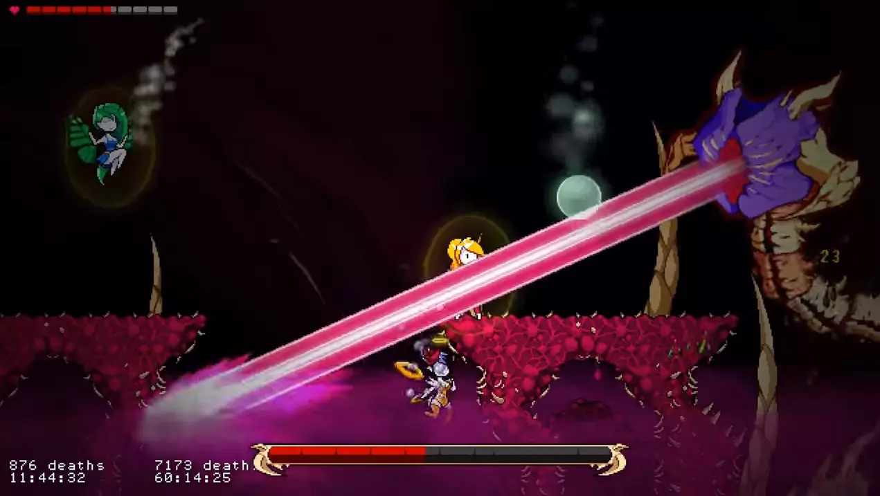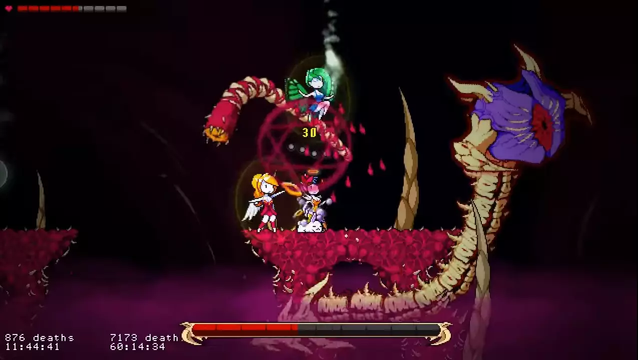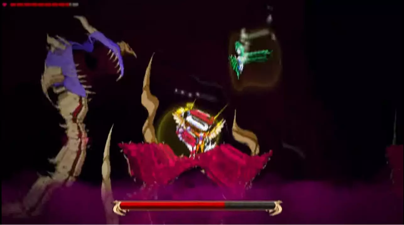 他会从口中发射大量法球。这些法球会在顶部悬浮约3秒,然后迅速落下。 如果你在【天使模式】下游玩,在法球之间的空隙处进行二段跳接滑翔,应该就能避开它们(此方法在【凡人模式】下可能同样适用)。 如果你在【凡人模式】或【恶魔模式】下游玩,按照截图所示远离平台即可。 超级尖叫