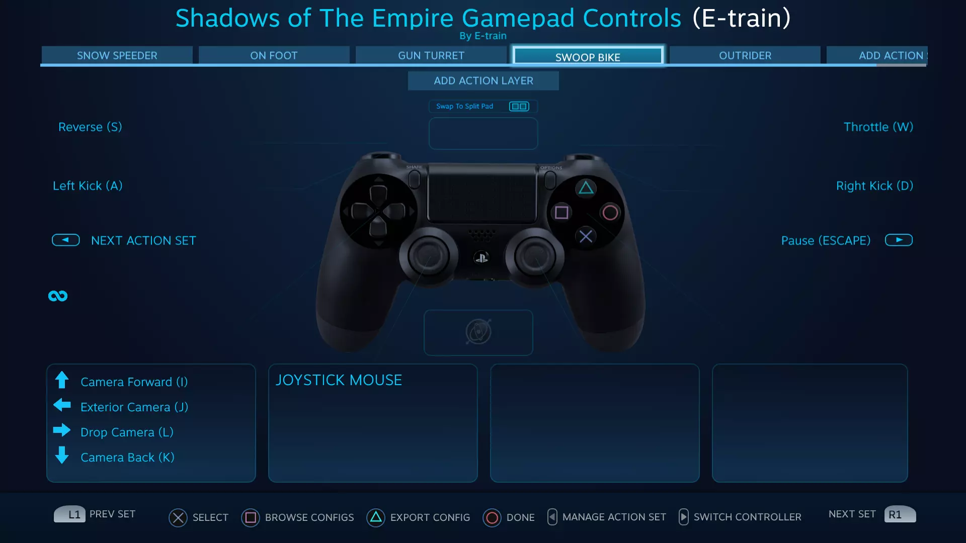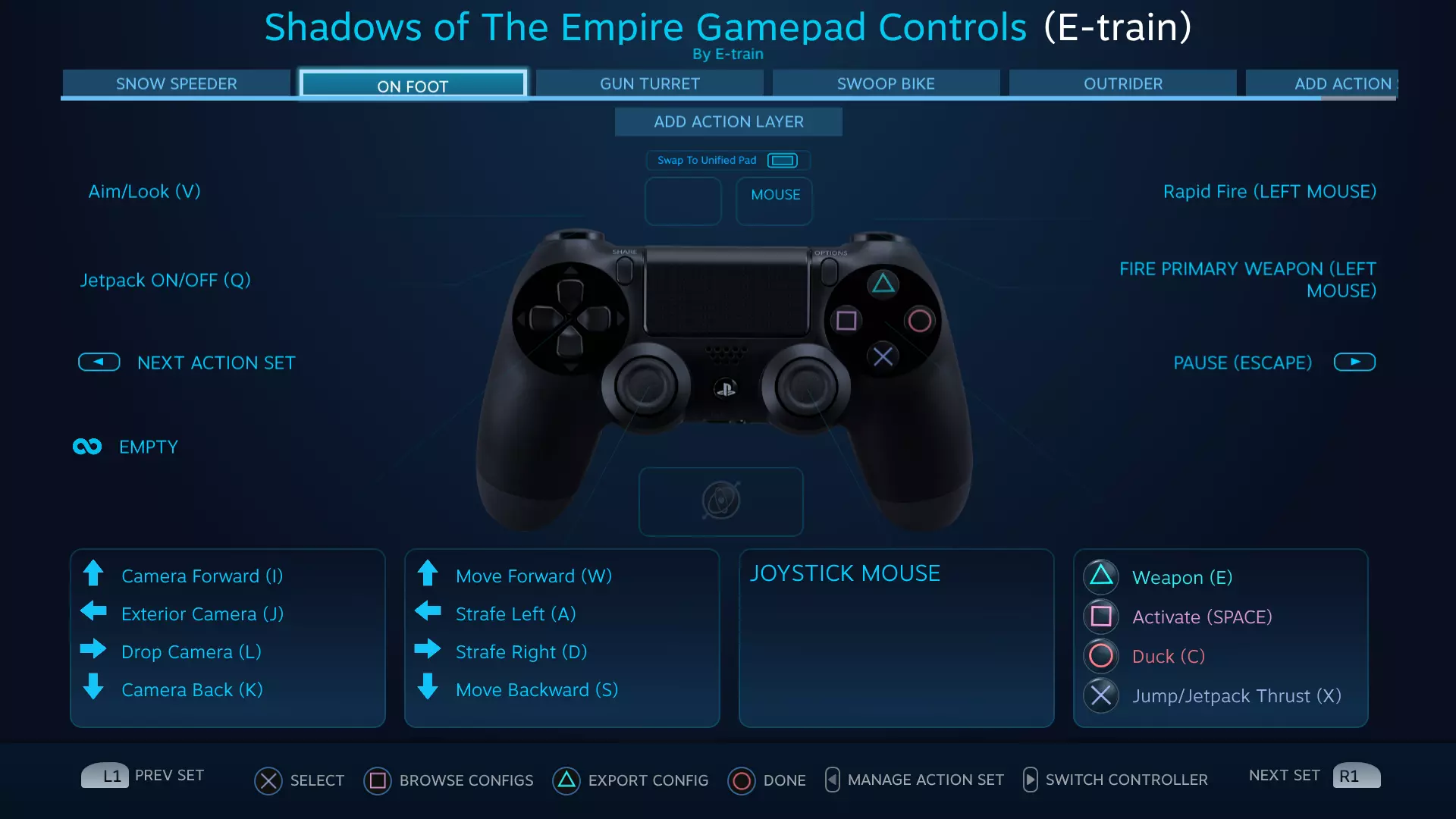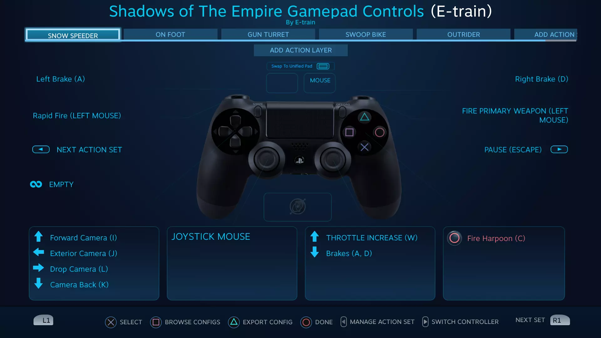 《星球大战:帝国阴影》Steam控制器配置器手柄按键设置指南 本指南将帮助你充分利用Steam控制器配置器中的手柄按键设置。包含针对《星球大战:帝国阴影》不同游戏模式的5种不同操作方案。 简介 最初适配PlayStation 4控制器。 也提供Xbox One控制器按键设置,但尚未经过完整游戏流程测试。 为确保控制器配置正常工作,你游戏内的键盘按键设置需与本指南截图所示一致。大多数情况下,使用默认键盘按键设置即可。 《星球大战:帝国阴影》的故事包含多种游戏模式,就像4-5款不同游戏的集合。每种游戏模式都有最适合的独立按键配置。在Steam控制器配置器中,这些不同的配置被称为【操作集】。可使用Share/Select键切换操作集,切换时会看到名称以覆盖层形式显示。 除了标准的【主开火】按钮外,还有一个【连射】按钮。该按钮过于强力,几乎让游戏中使用不同弹药类型的需求失去意义。由于游戏并非为此种玩法设计,部分玩家可能会觉得这破坏了游戏的挑战性。此按钮可轻松删除或选择不使用。 【雪地飞行艇操作集】