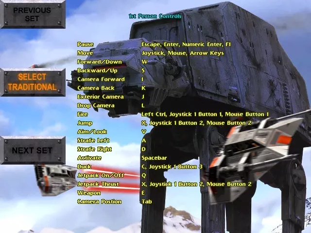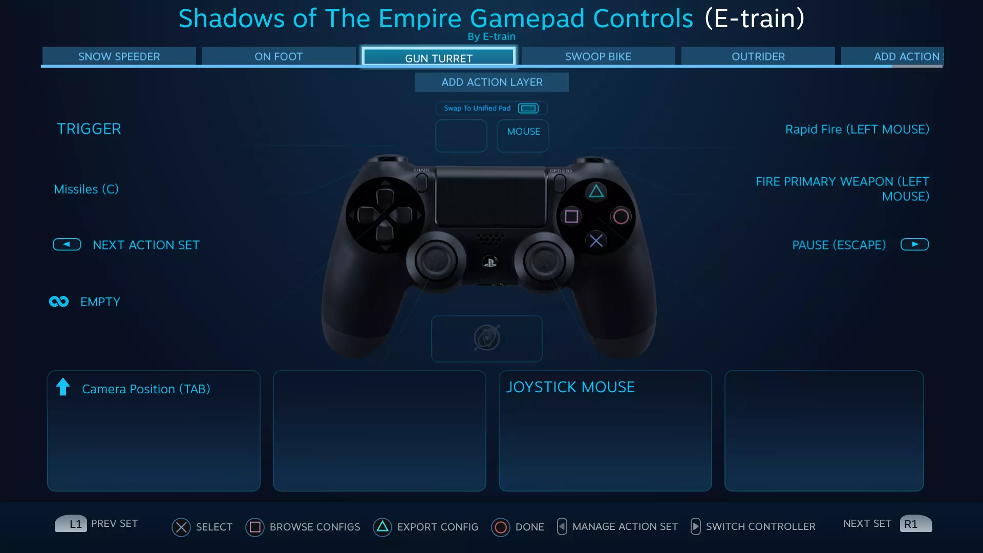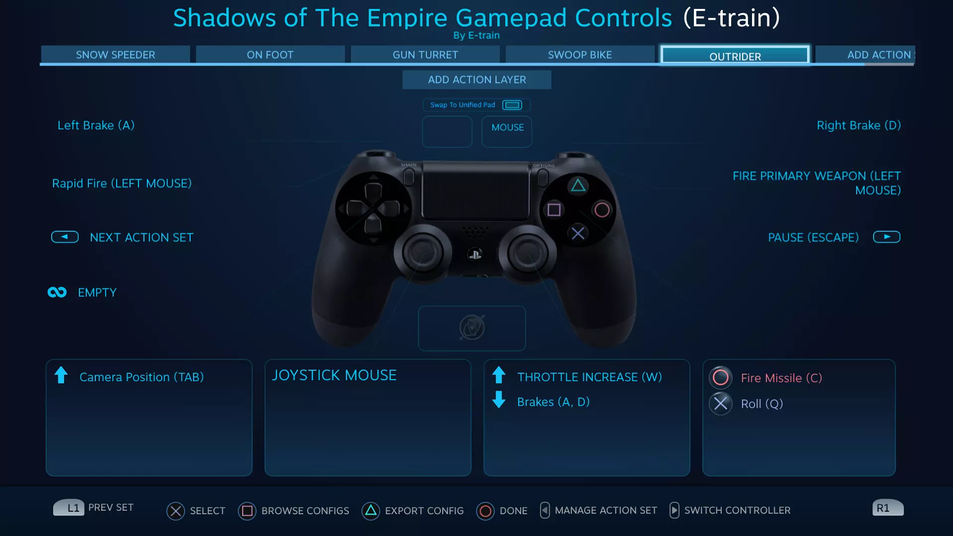 《星球大战:帝国阴影》Steam控制器配置器手柄按键设置指南 本指南将帮助你充分利用Steam控制器配置器中的手柄按键设置。包含针对《星球大战:帝国阴影》不同游戏模式的5种不同操作方案。 简介 最初适配PlayStation 4控制器。 也提供Xbox One控制器按键设置,但尚未经过完整游戏流程测试。 为确保控制器配置正常工作,你游戏内的键盘按键设置需与本指南截图所示一致。大多数情况下,使用默认键盘按键设置即可。 《星球大战:帝国阴影》的故事包含多种游戏模式,就像4-5款不同游戏的集合。每种游戏模式都有最适合的独立按键配置。在Steam控制器配置器中,这些不同的配置被称为【操作集】。可使用Share/Select键切换操作集,切换时会看到名称以覆盖层形式显示。 除了标准的【主开火】按钮外,还有一个【连射】按钮。该按钮过于强力,几乎让游戏中使用不同弹药类型的需求失去意义。由于游戏并非为此种玩法设计,部分玩家可能会觉得这破坏了游戏的挑战性。此按钮可轻松删除或选择不使用。 【雪地飞行艇操作集】