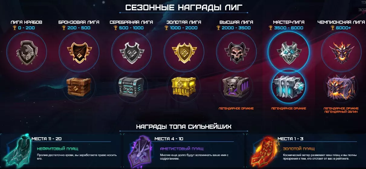 而且排行榜也有它的【小奖励】。与练习模式相比,胜利会奖励60枚金币和60点经验值,这意味着能更快更轻松地攒到需要的东西。但如果不幸失败了,也不用急于沮丧,失败同样会给予金币和经验值。没错,是30枚金币和40点经验值! 玩家与奖励 我想强调的是,排行榜玩法并不像最初看起来那么简单。游戏中有一些顶尖玩家,他们总是在游戏中寻找容易对付的目标,以此获取排名积分和珍贵的金币。 遗憾的是,无法将这些玩家从游戏中彻底清除,但这不妨碍你组建一支由三名玩家组成的突袭小队去参与排名赛。不过要注意,队伍中来自冠军联赛的玩家不能超过两名!此外,游戏中还有赛季奖励。顺便一提,每个赛季持续30天(也就是大约一个月)。除蟹钳联赛外,每个联赛都会提供特定的奖励宝箱。冠军联赛的宝箱自然比其他宝箱好得多,因为从中可以获得传奇外观、传奇武器、约1500金属以及约3000金币。