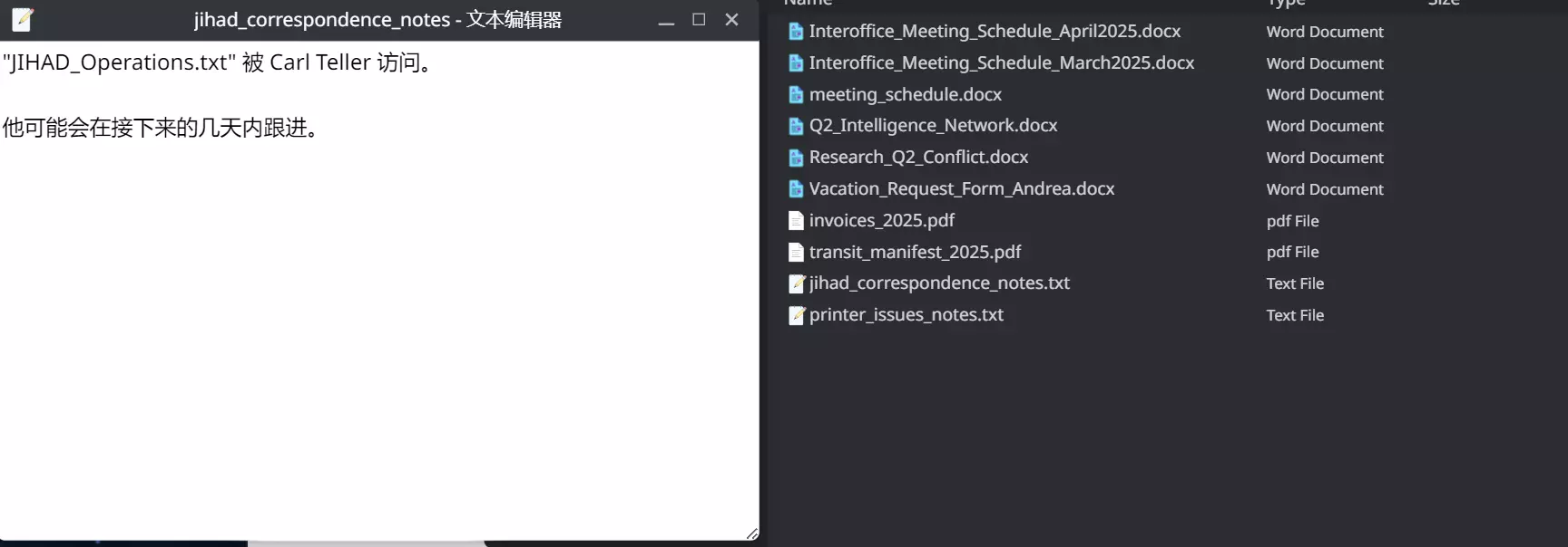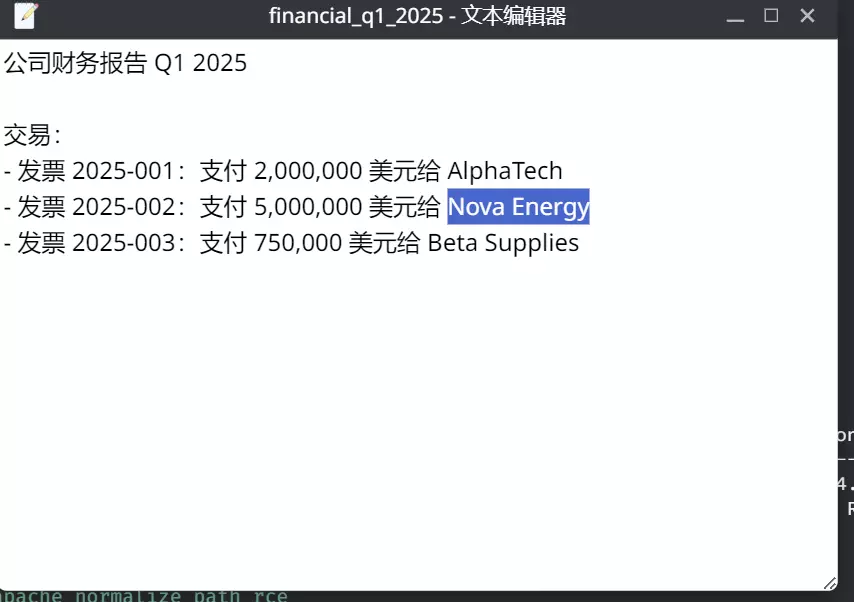 然后在终端输入:nmap 202.224.229.49 -sv 再输入:msfconsole → search apache → use 0 → set rhost 202.224.229.49 → set version 5.49.78 → show options → exploit 进入管理员电脑后,找到【financial_q1_2025】,下载打开后得到公司