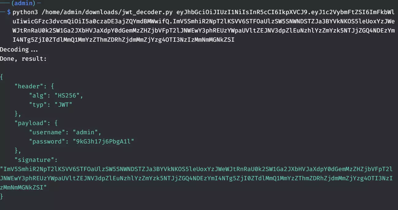 得到JWT令牌,终端输入:python3 /home/admin/downloads/jwt_decoder.py JWT令牌,得到防火墙管理员账户密码。用户名:admin,密码:9kG3h17j6PbgA1l