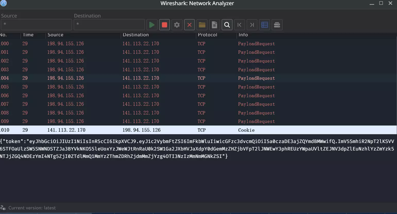 得到卡尔·泰勒的电脑IP:65.10.28.131。 终端输入:nmap 65.10.28.131 -sv 发现22端口已关闭。 在浏览器中输入路由器IP:55.208.174.233 发现存在防火墙,在浏览器中输入防火墙IP:141.113.22.170 打开软件Wireshark,在源地址和目标地址中填入* 新建终端输入:python3 /home/admin/downloads/kimai.py 141.113.22.170(防火墙的IP) 在Wireshark中找到cookie