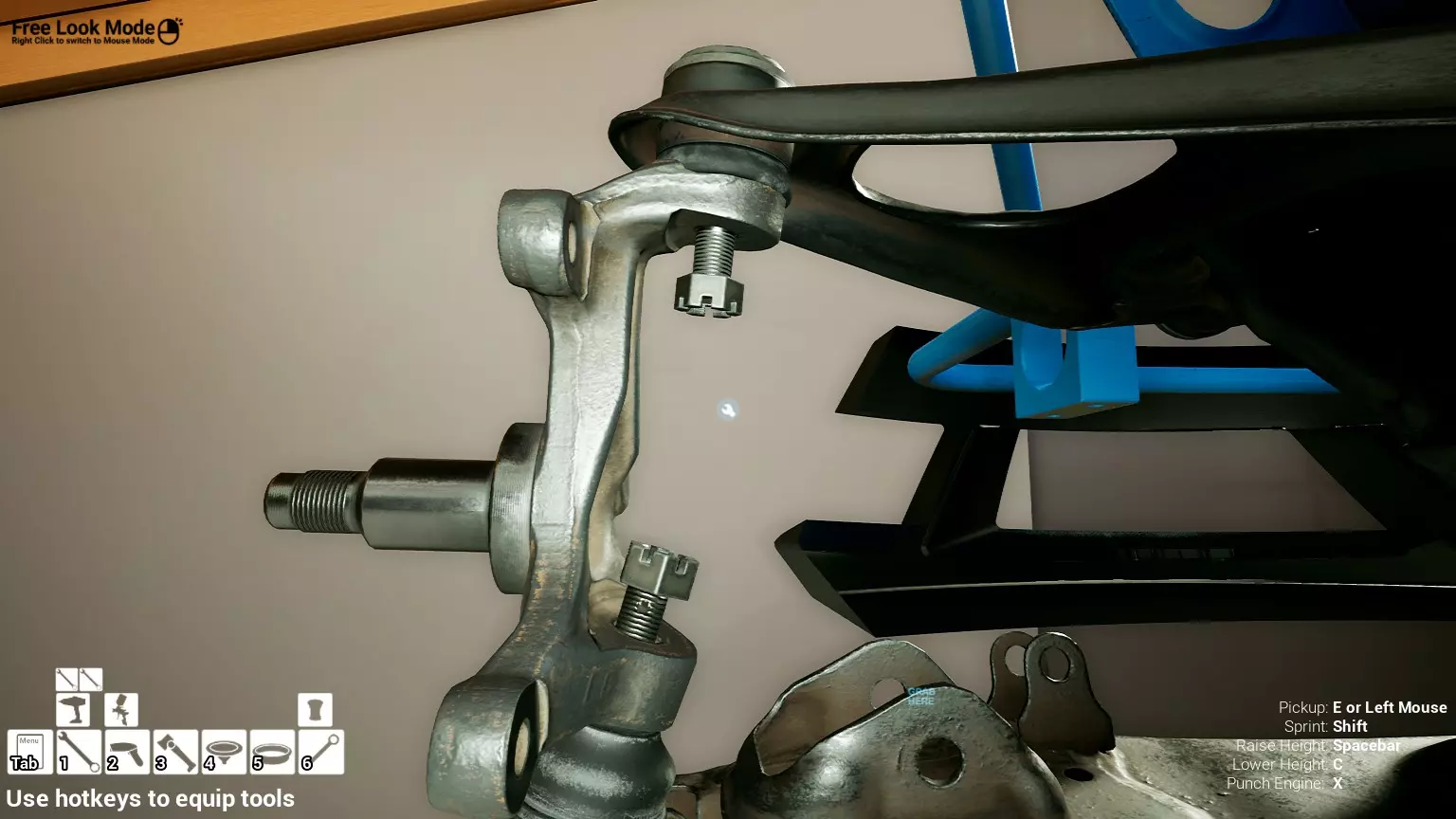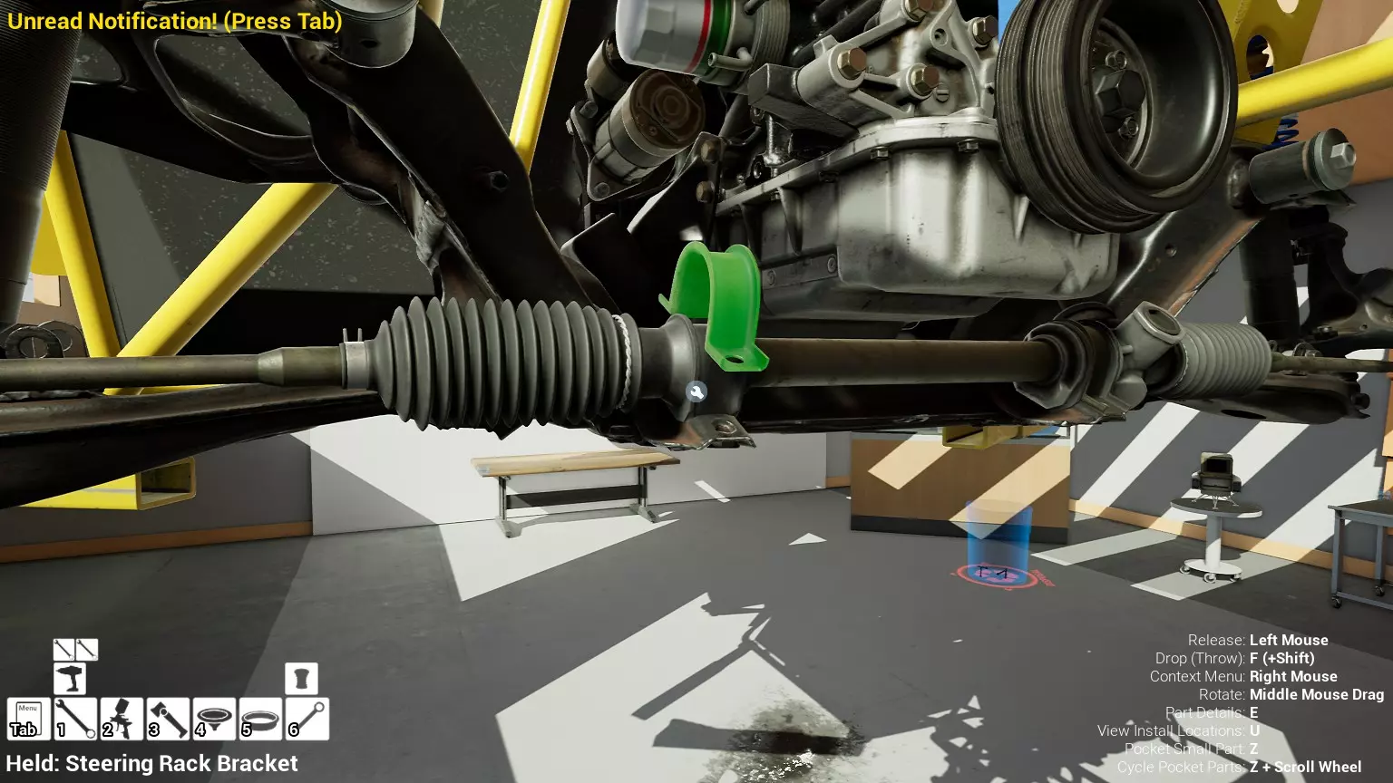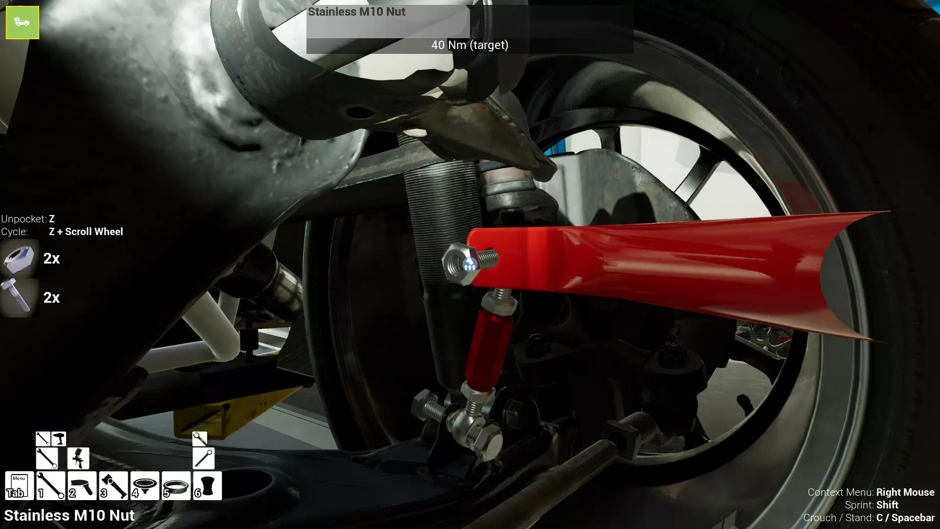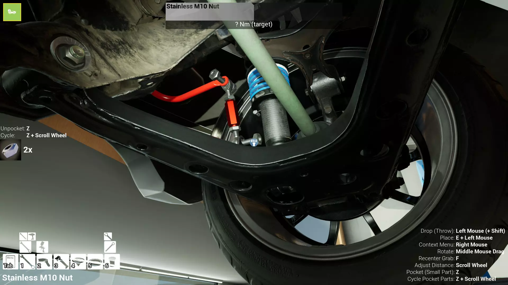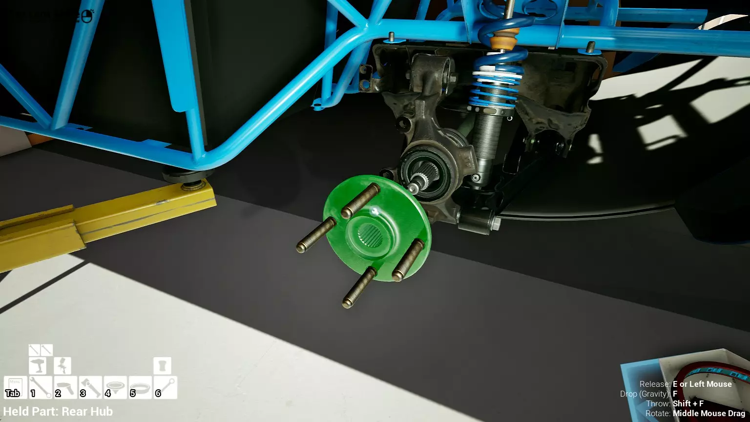 现已完全兼容141版本(2022年1月)。 本游戏处于不断变化和发展中,我一直在努力跟进并根据需要进行调整。由于开发者未提前通知,我只能通过反复试验来摸索。 不过请放心,我在将内容添加到本指南前,均已在游戏内亲自测试过所有内容,因此我确信撰写时信息是准确的。但除此之外,一切都可能随时发生变化。 请注意:游戏中并非所有可购买物品都是【磨损物品】,即它们在使用过程中不会累积磨损(至少目前不会)。 我是从一张完全空白的画布开始构建的,因此没有可重复使用的旧部件。不过,由于你很可能只是对现有的底盘进行全面检修,因此会有一些“非易损”部件可以重复使用,所以重复使用这些部件比购买新部件更合理。 因此,请仔细检查,确保你即将购买的部件确实是易损部件。你不会真的想把钱花在不需要更换的部件上。 本指南旨在帮助你从头开始构建整个底盘。 本指南不包括发动机和变速箱的安装与装配,这部分内容已在我创建的另一篇单独指南中涵盖。新的HUD系统会显示你正查看的部件,如果该部件有适用的扭矩设置,也会一并显示。 HUD现在还会列出你所查看物品的当前“磨损”程度,但这一功能仍在开发中,并非所有物品都会因使用而产生磨损。 至于旧扫描仪系统中曾有的安装说明,现在可以在独立的“手册”中找到,可通过平板电脑访问。 不过请注意,这些手册仍在完善中,因此部分内容可能存在误导。开发团队已意识到这一问题,并会及时更新和优化,但整个项目仅由两人负责,他们需要相应地优先安排时间和工作量。希望这部分内容没有让你感到过于枯燥,同时也希望它能帮助澄清一些玩家最近根据我收到的一些评论所遇到的问题。 感谢你抽出时间阅读这篇内容,也再次感谢你花时间阅读和使用这份指南。 你能购买自己的空机箱吗? 目前这个问题的简单答案是否定的。 开发者们在私下里讨论过这个问题,开发者和社区也在Discord上进行过讨论。 因此,这可能会在未来成为可用功能,但目前你还无法做到这一点。目前,最接近的方法是通过你的平板从【分类广告】中购买一辆汽车,然后自行将其拆解至只剩底盘。从这一步开始,你就可以随心所欲地对它进行操作了。 现在,底盘也不会产生任何磨损,所以无论你打算购买的汽车状况好坏,底盘都将始终保持完全相同的状态。 我只是觉得应该在这里提一下,因为这个问题经常出现。 当然,随着情况的变化,我会根据需要对这部分内容进行编辑或删除。 如何使用发动机支架和龙门吊。 这是最近很多人似乎都在纠结的问题,所以我想把这个添加到指南中。 发动机支架。你可以通过抓住支架顶部环绕着细长倒“U”形挂钩的半透明蓝色区域来升高或降低其高度,具体可参考下方截图。 当发动机放在支架上时,你还可以抓住覆盖着手柄的半透明蓝色区域,并朝着想要的方向旋转,以此来旋转发动机。你可以向任意方向旋转,且旋转的幅度没有限制。不过,本指南涵盖了整个底盘部分,包括副车架、悬架、转向系统、制动系统、车轮以及车身部件。 结合我已制作的发动机组装指南,你应该能够从头到尾打造出一整辆汽车。 我是在桌面模式下制作本指南的,因为我自己没有VR设备,所以无法保证所有信息对VR用户都100%准确。据我所知,VR模式与桌面模式的主要区别应该仅在于使用虚拟手操作而非鼠标点击,因此理论上其他所有信息都应该是通用的。如果我说错了,还请手下留情!在本指南中,我将使用全新的零件,因此如果你看到需要购买某个你已有的零件,你可以自行选择是重复使用旧零件还是购买新零件。 我决定使用全新零件,而非部分磨损的零件。这不仅能确保它们拥有最长的使用寿命,还能避免过早地再次经历零件拆卸和更换的过程。 作为参考,我所指的汽车左右两侧,是以驾驶员坐在车内并面向前方时的视角来确定的。即使你没有通读本指南,也请花点时间阅读我在末尾添加的题为【真实故事 - 引人深思】的部分。 这部分内容并非想让你对现实中自己动手修车望而却步,因为有些任务即使是新手,只要寻求并遵循专业建议和指导,也能相对轻松地完成。 不过,我想分享这个故事,是为了提醒大家,在进行维修工作时,哪怕是片刻的注意力不集中,都可能轻易演变成大麻烦。正如标题所示,这确实是一个真实的故事,引人深思。 那二三十秒的经历,我永生难忘。 在我们开始之前。需要注意的是,本指南的原始部分撰写于2019年初。从那以后,游戏和本指南都经历了多次变更,游戏内容有了大量新增和调整,本指南也相应地进行了补充和修改。让本指南一开始就引导你完成整个底盘的建造,似乎让一些新玩家感到些许困惑,他们可能在购买游戏前就阅读了本指南,或者刚购买游戏还没真正理解游戏的“运作”概念。此外,一些回归玩家可能也阅读过本指南,他们或许玩过游戏试玩版但从未购买,或者在游戏刚推出时就买了,却搁置了好几年,不了解游戏后续的发展,所以当他们最终重新进入游戏时,似乎也有些困惑。 那么我们就来澄清一下。 早在2018年12月,游戏首次在Steam抢先体验平台发布,以及2019年1月我首次撰写本指南时,玩家只需完成一些非常基础的工作,比如更换机油和轮胎,熟悉一下游戏的基本操作后,就可以完全拆解并重建自己的赛车,然后以“按场次”的方式将其出租。 这就是为什么本指南一