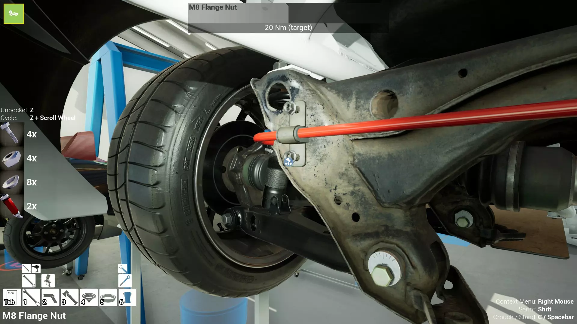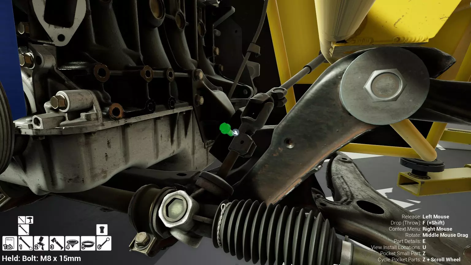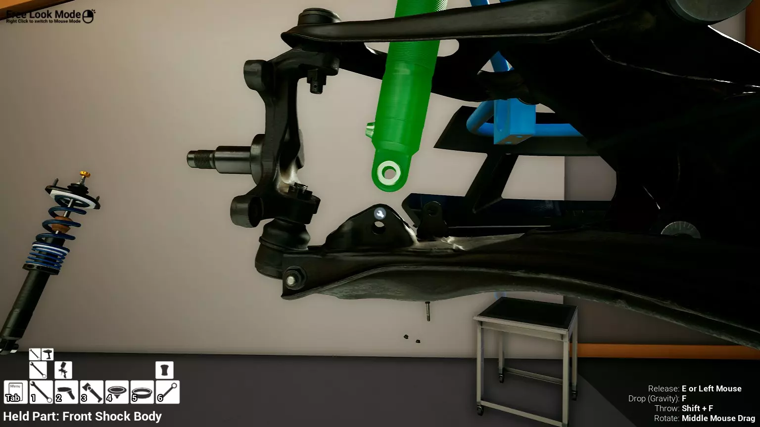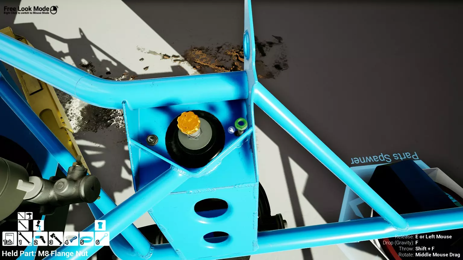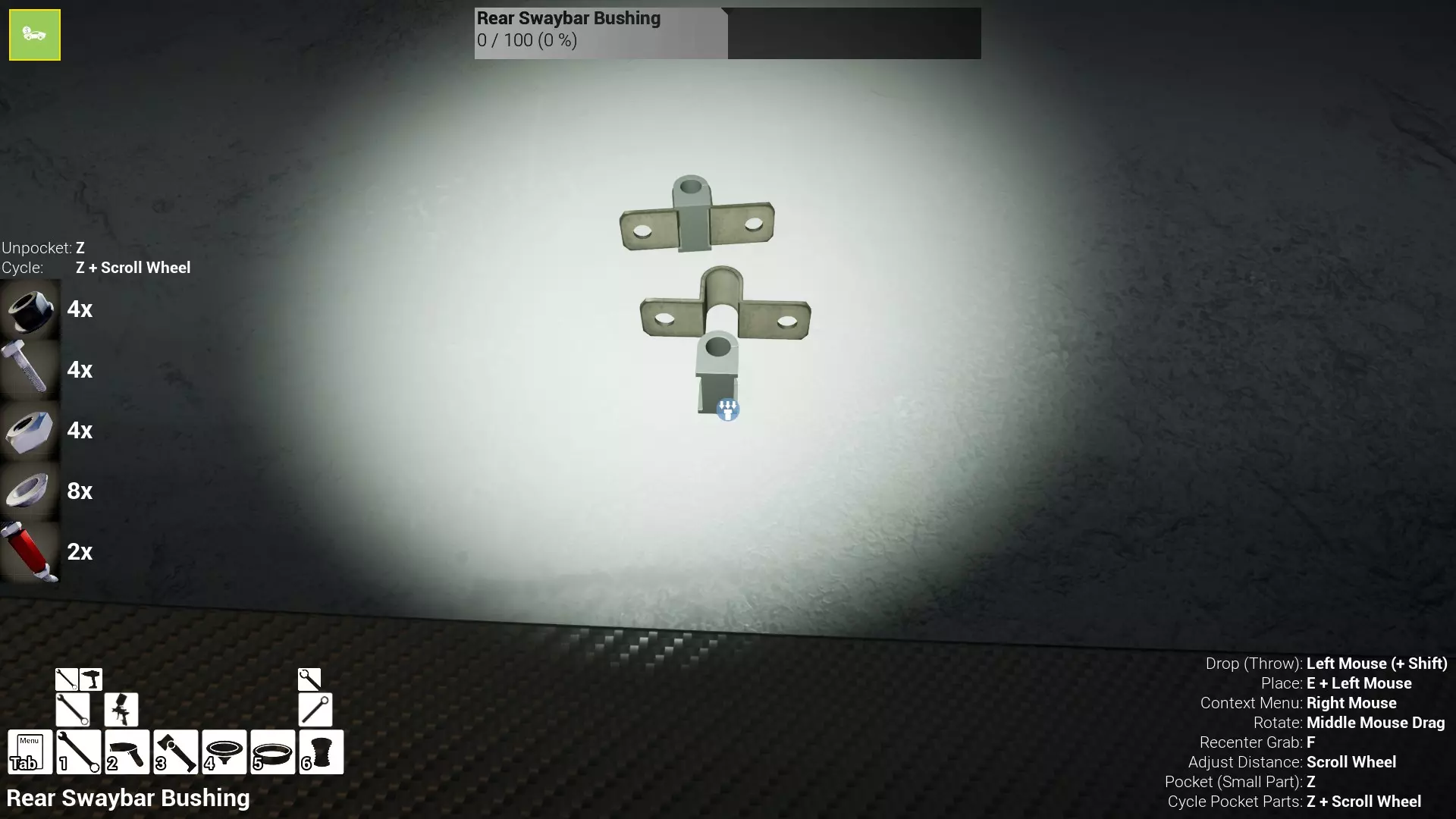 现已完全兼容141版本(2022年1月)。 本游戏处于不断变化和发展中,我一直在努力跟进并根据需要进行调整。由于开发者未提前通知,我只能通过反复试验来摸索。 不过请放心,我在将内容添加到本指南前,均已在游戏内亲自测试过所有内容,因此我确信撰写时信息是准确的。但除此之外,一切都可能随时发生变化。 请注意:游戏中并非所有可购买物品都是【磨损物品】,即它们在使用过程中不会累积磨损(至少目前不会)。 我是从一张完全空白的画布开始构建的,因此没有可重复使用的旧部件。不过,由于你很可能只是对现有的底盘进行全面检修,因此会有一些“非易损”部件可以重复使用,所以重复使用这些部件比购买新部件更合理。 因此,请仔细检查,确保你即将购买的部件确实是易损部件。你不会真的想把钱花在不需要更换的部件上。 本指南旨在帮助你从头开始构建整个底盘。 本指南不包括发动机和变速箱的安装与装配,这部分内容已在我创建的另一篇单独指南中涵盖。新的HUD系统会显示你正查看的部件,如果该部件有适用的扭矩设置,也会一并显示。 HUD现在还会列出你所查看物品的当前“磨损”程度,但这一功能仍在开发中,并非所有物品都会因使用而产生磨损。 至于旧扫描仪系统中曾有的安装说明,现在可以在独立的“手册”中找到,可通过平板电脑访问。 不过请注意,这些手册仍在完善中,因此部分内容可能存在误导。开发团队已意识到这一问题,并会及时更新和优化,但整个项目仅由两人负责,他们需要相应地优先安排时间和工作量。希望这部分内容没有让你感到过于枯燥,同时也希望它能帮助澄清一些玩家最近根据我收到的一些评论所遇到的问题。 感谢你抽出时间阅读这篇内容,也再次感谢你花时间阅读和使用这份指南。 你能购买自己的空机箱吗? 目前这个问题的简单答案是否定的。 开发者们在私下里讨论过这个问题,开发者和社区也在Discord上进行过讨论。 因此,这可能会在未来成为可用功能,但目前你还无法做到这一点。目前,最接近的方法是通过你的平板从【分类广告】中购买一辆汽车,然后自行将其拆解至只剩底盘。从这一步开始,你就可以随心所欲地对它进行操作了。 现在,底盘也不会产生任何磨损,所以无论你打算购买的汽车状况好坏,底盘都将始终保持完全相同的状态。 我只是觉得应该在这里提一下,因为这个问题经常出现。 当然,随着情况的变化,我会根据需要对这部分内容进行编辑或删除。 如何使用发动机支架和龙门吊。 这是最近很多人似乎都在纠结的问题,所以我想把这个添加到指南中。 发动机支架。你可以通过抓住支架顶部环绕着细长倒“U”形挂钩的半透明蓝色区域来升高或降低其高度,具体可参考下方截图。 当发动机放在支架上时,你还可以抓住覆盖着手柄的半透明蓝色区域,并朝着想要的方向旋转,以此来旋转发动机。你可以向任意方向旋转,且旋转的幅度没有限制。不过,本指南涵盖了整个底盘部分,包括副车架、悬架、转向系统、制动系统、车轮以及车身部件。 结合我已制作的发动机组装指南,你应该能够从头到尾打造出一整辆汽车。 我是在桌面模式下制作本指南的,因为我自己没有VR设备,所以无法保证所有信息对VR用户都100%准确。据我所知,VR模式与桌面模式的主要区别应该仅在于使用虚拟手操作而非鼠标点击,因此理论上其他所有信息都应该是通用的。如果我说错了,还请手下留情!在本指南中,我将使用全新的零件,因此如果你看到需要购买某个你已有的零件,你可以自行选择是重复使用旧零件还是购买新零件。 我决定使用全新零件,而非部分磨损的零件。这不仅能确保它们拥有最长的使用寿命,还能避免过早地再次经历零件拆卸和更换的过程。 作为参考,我所指的汽车左右两侧,是以驾驶员坐在车内并面向前方时的视角来确定的。即使你没有通读本指南,也请花点时间阅读我在末尾添加的题为【真实故事 - 引人深思】的部分。 这部分内容并非想让你对现实中自己动手修车望而却步,因为有些任务即使是新手,只要寻求并遵循专业建议和指导,也能相对轻松地完成。 不过,我想分享这个故事,是为了提醒大家,在进行维修工作时,哪怕是片刻的注意力不集中,都可能轻易演变成大麻烦。正如标题所示,这确实是一个真实的故事,引人深思。 那二三十秒的经历,我永生难忘。 在我们开始之前。需要注意的是,本指南的原始部分撰写于2019年初。从那以后,游戏和本指南都经历了多次变更,游戏内容有了大量新增和调整,本指南也相应地进行了补充和修改。让本指南一开始就引导你完成整个底盘的建造,似乎让一些新玩家感到些许困惑,他们可能在购买游戏前就阅读了本指南,或者刚购买游戏还没真正理解游戏的“运作”概念。此外,一些回归玩家可能也阅读过本指南,他们或许玩过游戏试玩版但从未购买,或者在游戏刚推出时就买了,却搁置了好几年,不了解游戏后续的发展,所以当他们最终重新进入游戏时,似乎也有些困惑。 那么我们就来澄清一下。 早在2018年12月,游戏首次在Steam抢先体验平台发布,以及2019年1月我首次撰写本指南时,玩家只需完成一些非常基础的工作,比如更换机油和轮胎,熟悉一下游戏的基本操作后,就可以完全拆解并重建自己的赛车,然后以“按场次”的方式将其出租。 这就是为什么本指南一