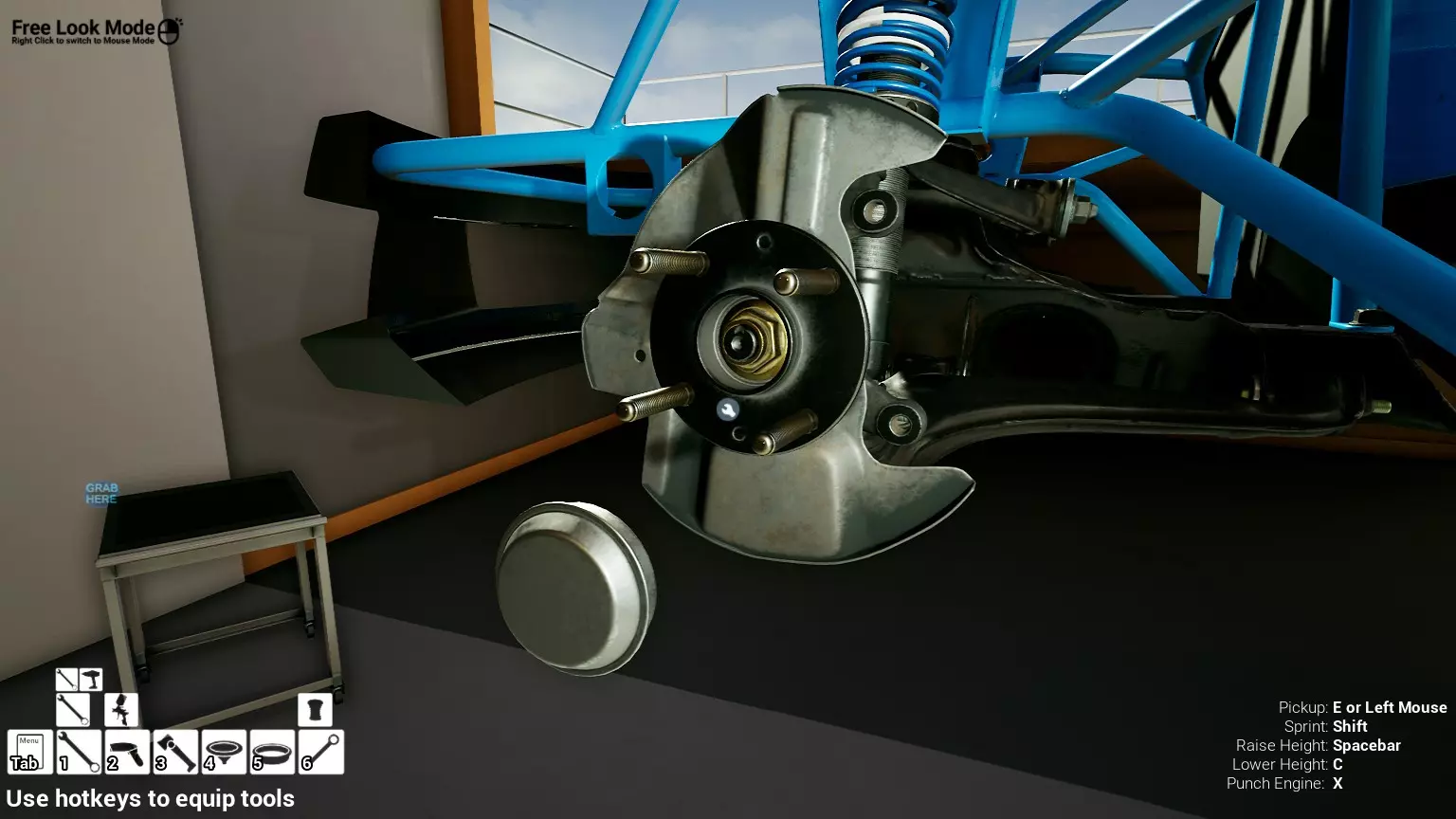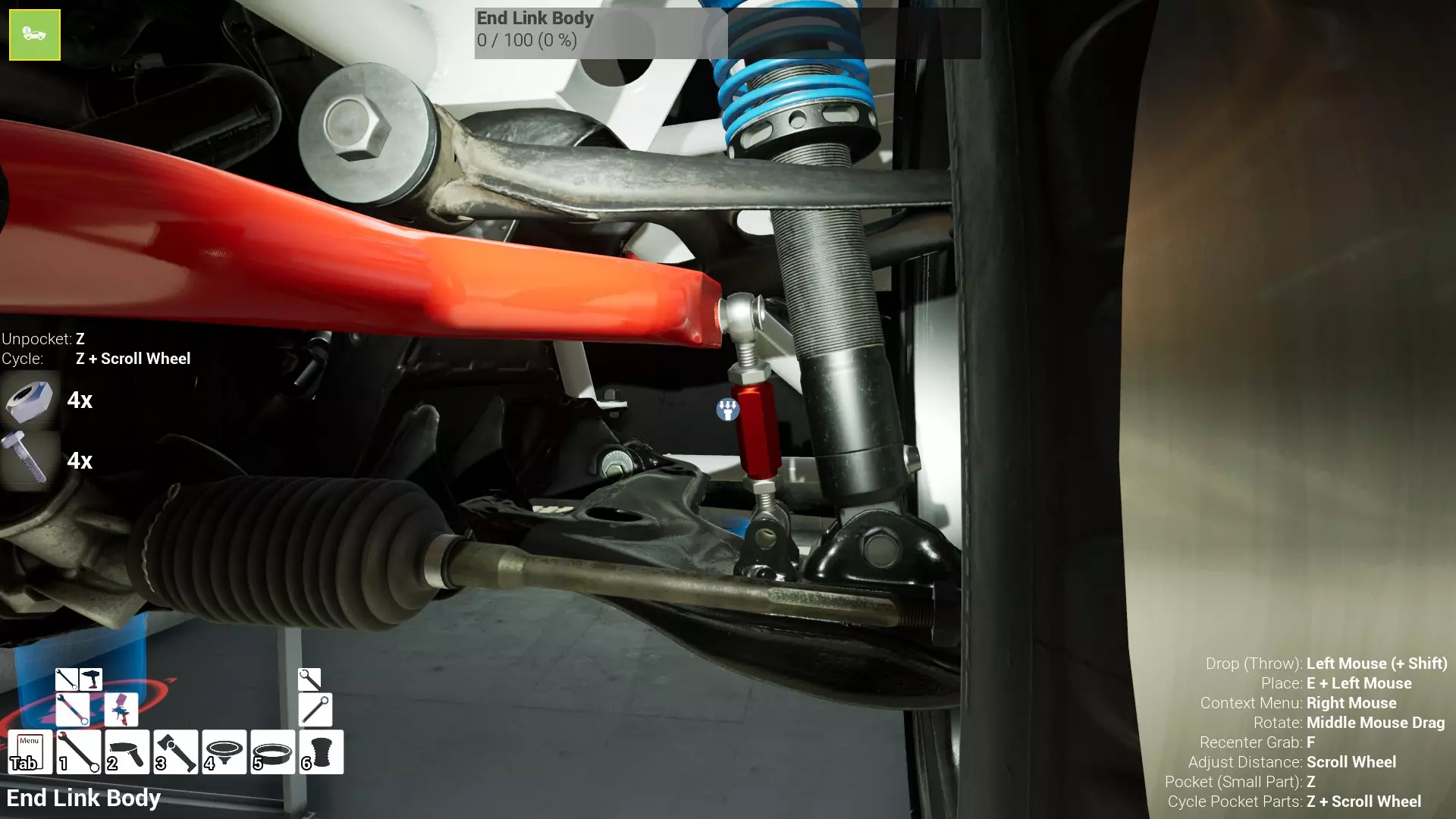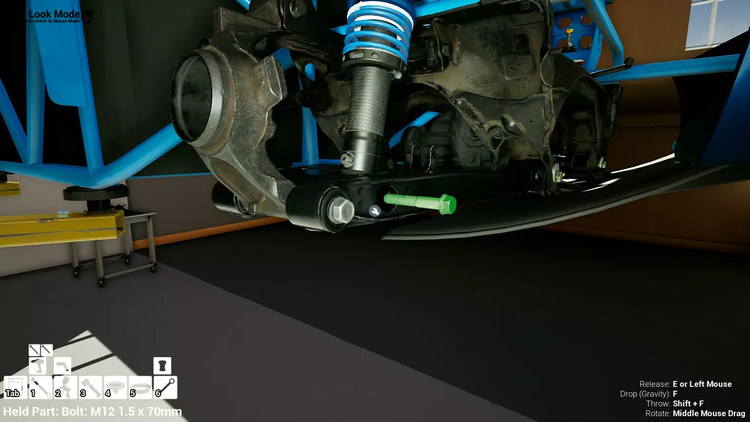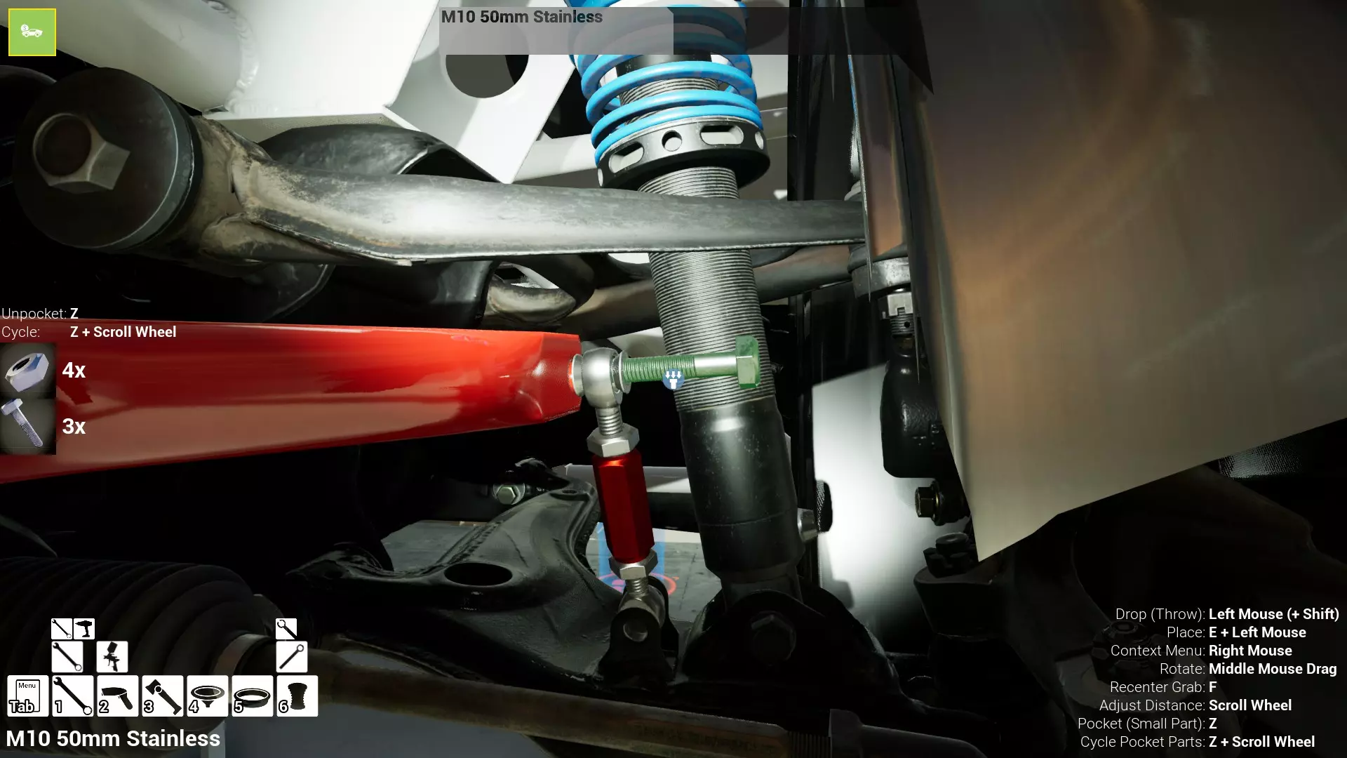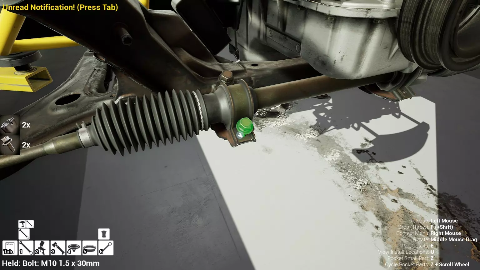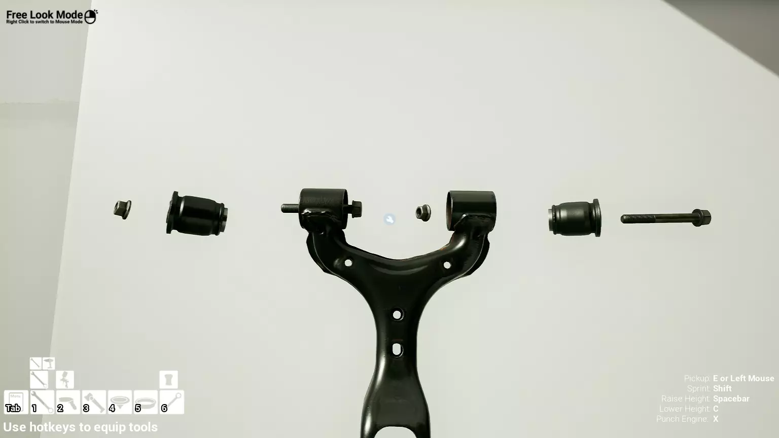 现已完全兼容141版本(2022年1月)。 本游戏处于不断变化和发展中,我一直在努力跟进并根据需要进行调整。由于开发者未提前通知,我只能通过反复试验来摸索。 不过请放心,我在将内容添加到本指南前,均已在游戏内亲自测试过所有内容,因此我确信撰写时信息是准确的。但除此之外,一切都可能随时发生变化。 请注意:游戏中并非所有可购买物品都是【磨损物品】,即它们在使用过程中不会累积磨损(至少目前不会)。 我是从一张完全空白的画布开始构建的,因此没有可重复使用的旧部件。不过,由于你很可能只是对现有的底盘进行全面检修,因此会有一些“非易损”部件可以重复使用,所以重复使用这些部件比购买新部件更合理。 因此,请仔细检查,确保你即将购买的部件确实是易损部件。你不会真的想把钱花在不需要更换的部件上。 本指南旨在帮助你从头开始构建整个底盘。 本指南不包括发动机和变速箱的安装与装配,这部分内容已在我创建的另一篇单独指南中涵盖。新的HUD系统会显示你正查看的部件,如果该部件有适用的扭矩设置,也会一并显示。 HUD现在还会列出你所查看物品的当前“磨损”程度,但这一功能仍在开发中,并非所有物品都会因使用而产生磨损。 至于旧扫描仪系统中曾有的安装说明,现在可以在独立的“手册”中找到,可通过平板电脑访问。 不过请注意,这些手册仍在完善中,因此部分内容可能存在误导。开发团队已意识到这一问题,并会及时更新和优化,但整个项目仅由两人负责,他们需要相应地优先安排时间和工作量。希望这部分内容没有让你感到过于枯燥,同时也希望它能帮助澄清一些玩家最近根据我收到的一些评论所遇到的问题。 感谢你抽出时间阅读这篇内容,也再次感谢你花时间阅读和使用这份指南。 你能购买自己的空机箱吗? 目前这个问题的简单答案是否定的。 开发者们在私下里讨论过这个问题,开发者和社区也在Discord上进行过讨论。 因此,这可能会在未来成为可用功能,但目前你还无法做到这一点。目前,最接近的方法是通过你的平板从【分类广告】中购买一辆汽车,然后自行将其拆解至只剩底盘。从这一步开始,你就可以随心所欲地对它进行操作了。 现在,底盘也不会产生任何磨损,所以无论你打算购买的汽车状况好坏,底盘都将始终保持完全相同的状态。 我只是觉得应该在这里提一下,因为这个问题经常出现。 当然,随着情况的变化,我会根据需要对这部分内容进行编辑或删除。 如何使用发动机支架和龙门吊。 这是最近很多人似乎都在纠结的问题,所以我想把这个添加到指南中。 发动机支架。你可以通过抓住支架顶部环绕着细长倒“U”形挂钩的半透明蓝色区域来升高或降低其高度,具体可参考下方截图。 当发动机放在支架上时,你还可以抓住覆盖着手柄的半透明蓝色区域,并朝着想要的方向旋转,以此来旋转发动机。你可以向任意方向旋转,且旋转的幅度没有限制。不过,本指南涵盖了整个底盘部分,包括副车架、悬架、转向系统、制动系统、车轮以及车身部件。 结合我已制作的发动机组装指南,你应该能够从头到尾打造出一整辆汽车。 我是在桌面模式下制作本指南的,因为我自己没有VR设备,所以无法保证所有信息对VR用户都100%准确。据我所知,VR模式与桌面模式的主要区别应该仅在于使用虚拟手操作而非鼠标点击,因此理论上其他所有信息都应该是通用的。如果我说错了,还请手下留情!在本指南中,我将使用全新的零件,因此如果你看到需要购买某个你已有的零件,你可以自行选择是重复使用旧零件还是购买新零件。 我决定使用全新零件,而非部分磨损的零件。这不仅能确保它们拥有最长的使用寿命,还能避免过早地再次经历零件拆卸和更换的过程。 作为参考,我所指的汽车左右两侧,是以驾驶员坐在车内并面向前方时的视角来确定的。即使你没有通读本指南,也请花点时间阅读我在末尾添加的题为【真实故事 - 引人深思】的部分。 这部分内容并非想让你对现实中自己动手修车望而却步,因为有些任务即使是新手,只要寻求并遵循专业建议和指导,也能相对轻松地完成。 不过,我想分享这个故事,是为了提醒大家,在进行维修工作时,哪怕是片刻的注意力不集中,都可能轻易演变成大麻烦。正如标题所示,这确实是一个真实的故事,引人深思。 那二三十秒的经历,我永生难忘。 在我们开始之前。需要注意的是,本指南的原始部分撰写于2019年初。从那以后,游戏和本指南都经历了多次变更,游戏内容有了大量新增和调整,本指南也相应地进行了补充和修改。让本指南一开始就引导你完成整个底盘的建造,似乎让一些新玩家感到些许困惑,他们可能在购买游戏前就阅读了本指南,或者刚购买游戏还没真正理解游戏的“运作”概念。此外,一些回归玩家可能也阅读过本指南,他们或许玩过游戏试玩版但从未购买,或者在游戏刚推出时就买了,却搁置了好几年,不了解游戏后续的发展,所以当他们最终重新进入游戏时,似乎也有些困惑。 那么我们就来澄清一下。 早在2018年12月,游戏首次在Steam抢先体验平台发布,以及2019年1月我首次撰写本指南时,玩家只需完成一些非常基础的工作,比如更换机油和轮胎,熟悉一下游戏的基本操作后,就可以完全拆解并重建自己的赛车,然后以“按场次”的方式将其出租。 这就是为什么本指南一