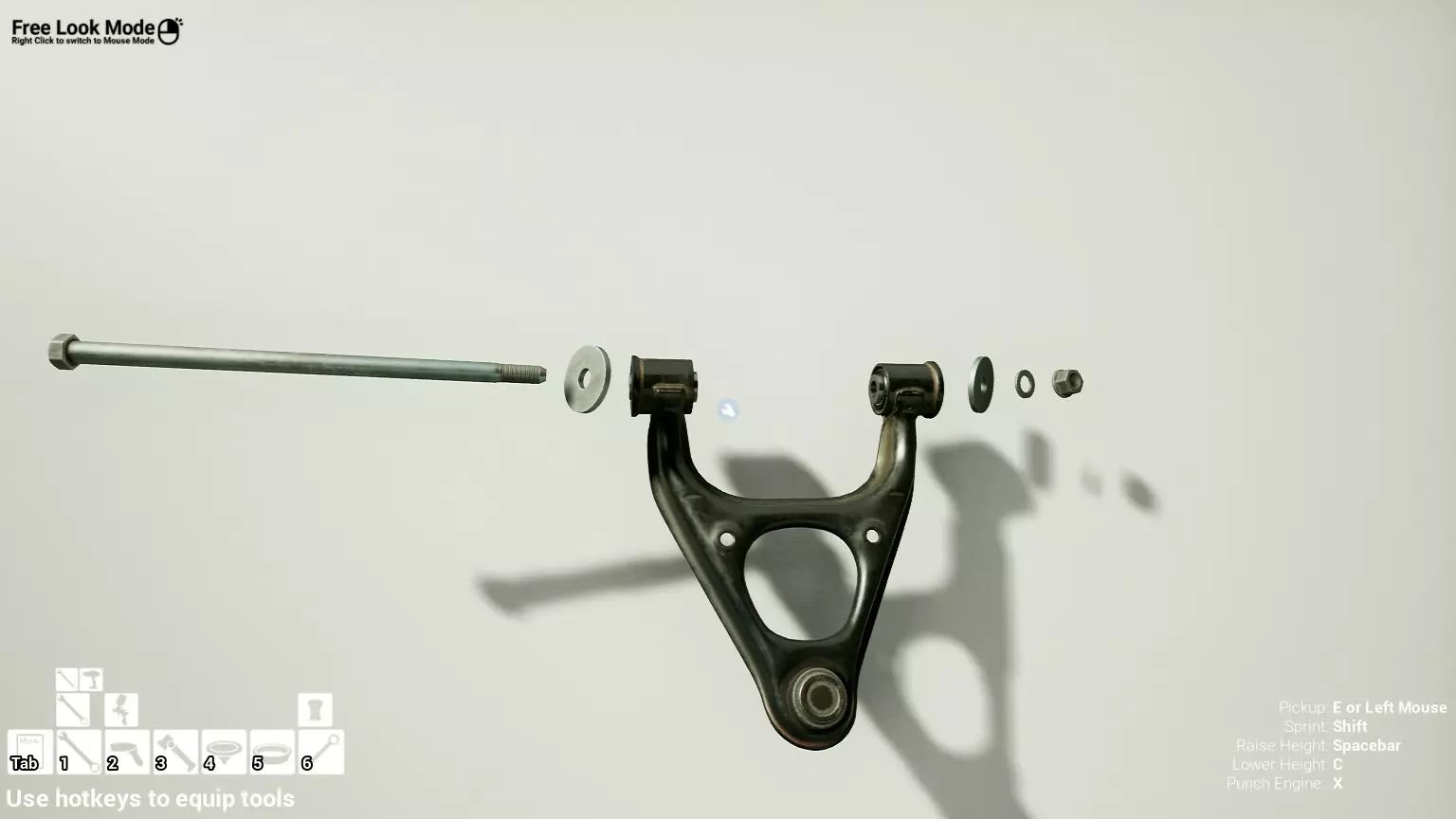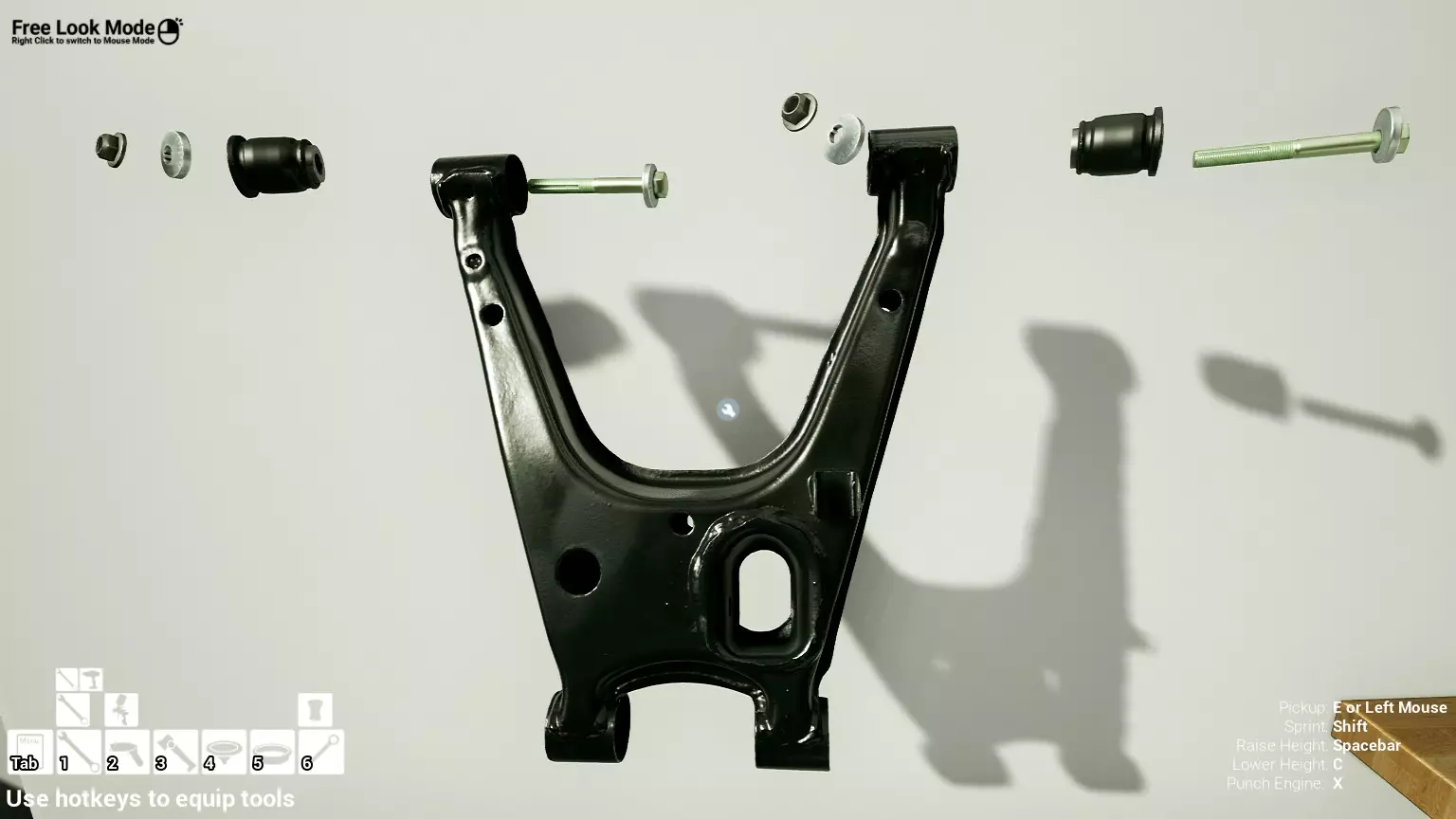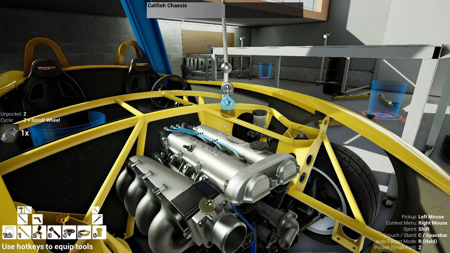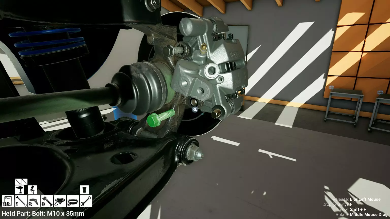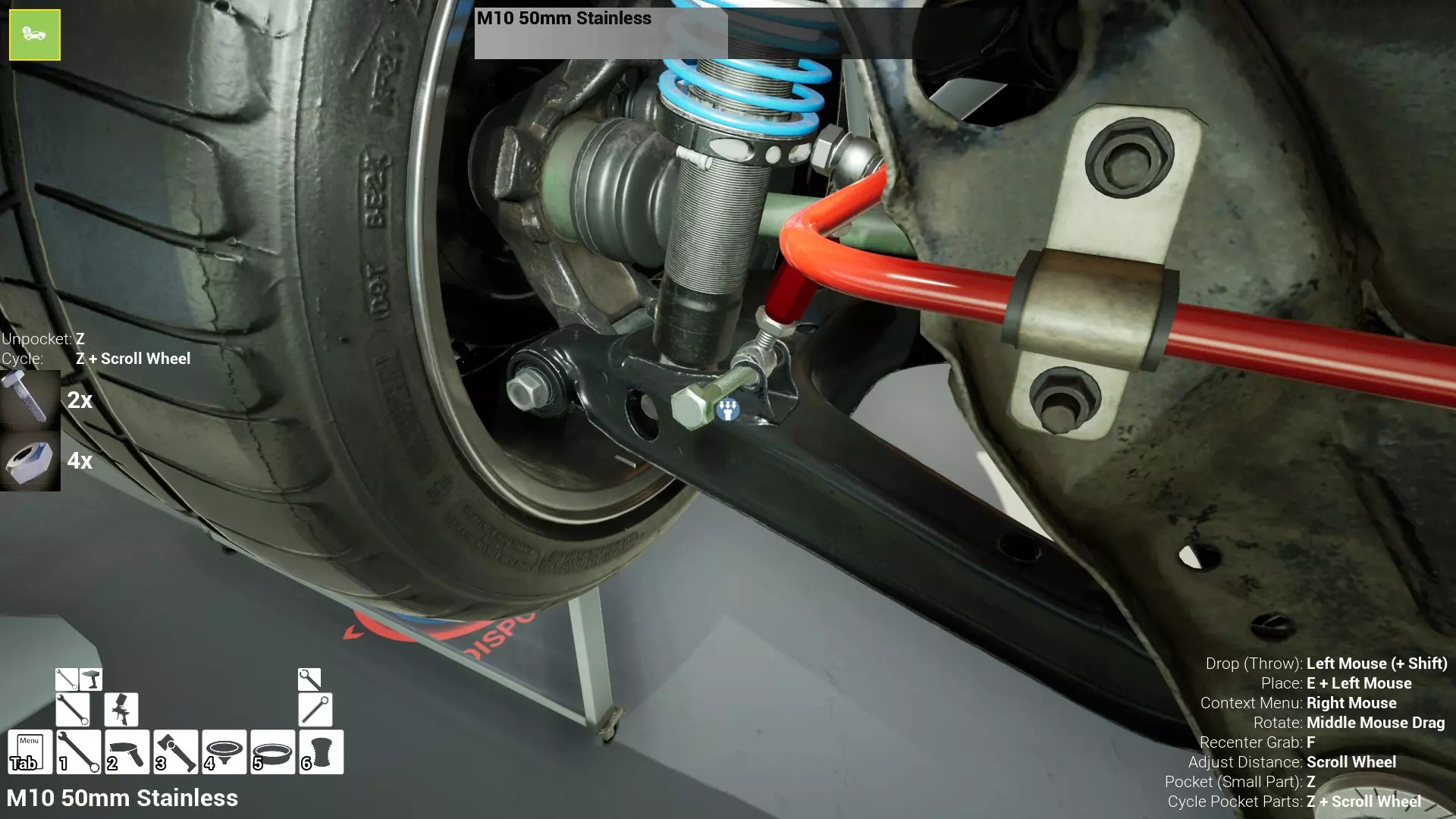 现已完全兼容141版本(2022年1月)。 本游戏处于不断变化和发展中,我一直在努力跟进并根据需要进行调整。由于开发者未提前通知,我只能通过反复试验来摸索。 不过请放心,我在将内容添加到本指南前,均已在游戏内亲自测试过所有内容,因此我确信撰写时信息是准确的。但除此之外,一切都可能随时发生变化。 请注意:游戏中并非所有可购买物品都是【磨损物品】,即它们在使用过程中不会累积磨损(至少目前不会)。 我是从一张完全空白的画布开始构建的,因此没有可重复使用的旧部件。不过,由于你很可能只是对现有的底盘进行全面检修,因此会有一些“非易损”部件可以重复使用,所以重复使用这些部件比购买新部件更合理。 因此,请仔细检查,确保你即将购买的部件确实是易损部件。你不会真的想把钱花在不需要更换的部件上。 本指南旨在帮助你从头开始构建整个底盘。 本指南不包括发动机和变速箱的安装与装配,这部分内容已在我创建的另一篇单独指南中涵盖。新的HUD系统会显示你正查看的部件,如果该部件有适用的扭矩设置,也会一并显示。 HUD现在还会列出你所查看物品的当前“磨损”程度,但这一功能仍在开发中,并非所有物品都会因使用而产生磨损。 至于旧扫描仪系统中曾有的安装说明,现在可以在独立的“手册”中找到,可通过平板电脑访问。 不过请注意,这些手册仍在完善中,因此部分内容可能存在误导。开发团队已意识到这一问题,并会及时更新和优化,但整个项目仅由两人负责,他们需要相应地优先安排时间和工作量。希望这部分内容没有让你感到过于枯燥,同时也希望它能帮助澄清一些玩家最近根据我收到的一些评论所遇到的问题。 感谢你抽出时间阅读这篇内容,也再次感谢你花时间阅读和使用这份指南。 你能购买自己的空机箱吗? 目前这个问题的简单答案是否定的。 开发者们在私下里讨论过这个问题,开发者和社区也在Discord上进行过讨论。 因此,这可能会在未来成为可用功能,但目前你还无法做到这一点。目前,最接近的方法是通过你的平板从【分类广告】中购买一辆汽车,然后自行将其拆解至只剩底盘。从这一步开始,你就可以随心所欲地对它进行操作了。 现在,底盘也不会产生任何磨损,所以无论你打算购买的汽车状况好坏,底盘都将始终保持完全相同的状态。 我只是觉得应该在这里提一下,因为这个问题经常出现。 当然,随着情况的变化,我会根据需要对这部分内容进行编辑或删除。 如何使用发动机支架和龙门吊。 这是最近很多人似乎都在纠结的问题,所以我想把这个添加到指南中。 发动机支架。你可以通过抓住支架顶部环绕着细长倒“U”形挂钩的半透明蓝色区域来升高或降低其高度,具体可参考下方截图。 当发动机放在支架上时,你还可以抓住覆盖着手柄的半透明蓝色区域,并朝着想要的方向旋转,以此来旋转发动机。你可以向任意方向旋转,且旋转的幅度没有限制。不过,本指南涵盖了整个底盘部分,包括副车架、悬架、转向系统、制动系统、车轮以及车身部件。 结合我已制作的发动机组装指南,你应该能够从头到尾打造出一整辆汽车。 我是在桌面模式下制作本指南的,因为我自己没有VR设备,所以无法保证所有信息对VR用户都100%准确。据我所知,VR模式与桌面模式的主要区别应该仅在于使用虚拟手操作而非鼠标点击,因此理论上其他所有信息都应该是通用的。如果我说错了,还请手下留情!在本指南中,我将使用全新的零件,因此如果你看到需要购买某个你已有的零件,你可以自行选择是重复使用旧零件还是购买新零件。 我决定使用全新零件,而非部分磨损的零件。这不仅能确保它们拥有最长的使用寿命,还能避免过早地再次经历零件拆卸和更换的过程。 作为参考,我所指的汽车左右两侧,是以驾驶员坐在车内并面向前方时的视角来确定的。即使你没有通读本指南,也请花点时间阅读我在末尾添加的题为【真实故事 - 引人深思】的部分。 这部分内容并非想让你对现实中自己动手修车望而却步,因为有些任务即使是新手,只要寻求并遵循专业建议和指导,也能相对轻松地完成。 不过,我想分享这个故事,是为了提醒大家,在进行维修工作时,哪怕是片刻的注意力不集中,都可能轻易演变成大麻烦。正如标题所示,这确实是一个真实的故事,引人深思。 那二三十秒的经历,我永生难忘。 在我们开始之前。需要注意的是,本指南的原始部分撰写于2019年初。从那以后,游戏和本指南都经历了多次变更,游戏内容有了大量新增和调整,本指南也相应地进行了补充和修改。让本指南一开始就引导你完成整个底盘的建造,似乎让一些新玩家感到些许困惑,他们可能在购买游戏前就阅读了本指南,或者刚购买游戏还没真正理解游戏的“运作”概念。此外,一些回归玩家可能也阅读过本指南,他们或许玩过游戏试玩版但从未购买,或者在游戏刚推出时就买了,却搁置了好几年,不了解游戏后续的发展,所以当他们最终重新进入游戏时,似乎也有些困惑。 那么我们就来澄清一下。 早在2018年12月,游戏首次在Steam抢先体验平台发布,以及2019年1月我首次撰写本指南时,玩家只需完成一些非常基础的工作,比如更换机油和轮胎,熟悉一下游戏的基本操作后,就可以完全拆解并重建自己的赛车,然后以“按场次”的方式将其出租。 这就是为什么本指南一