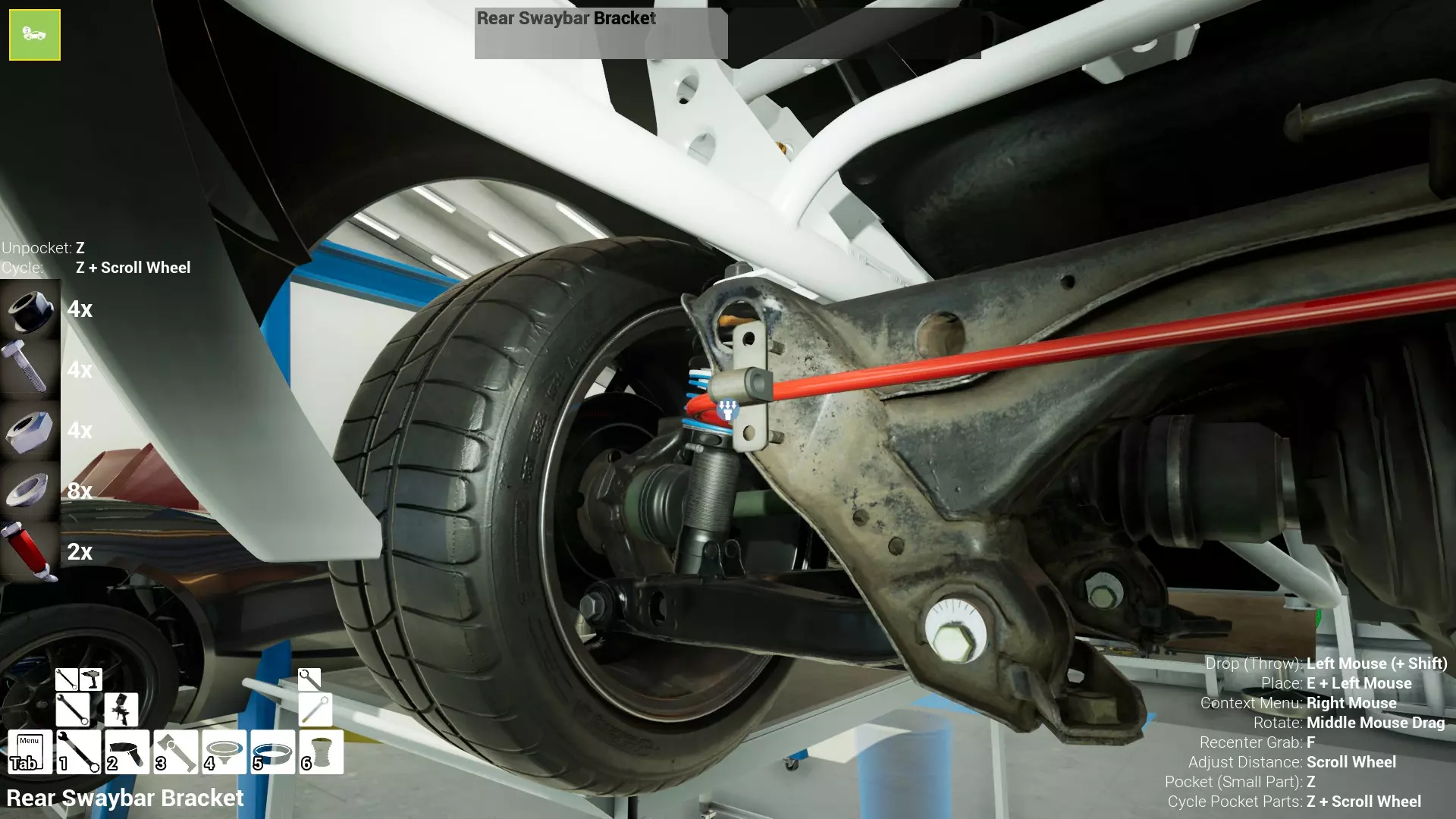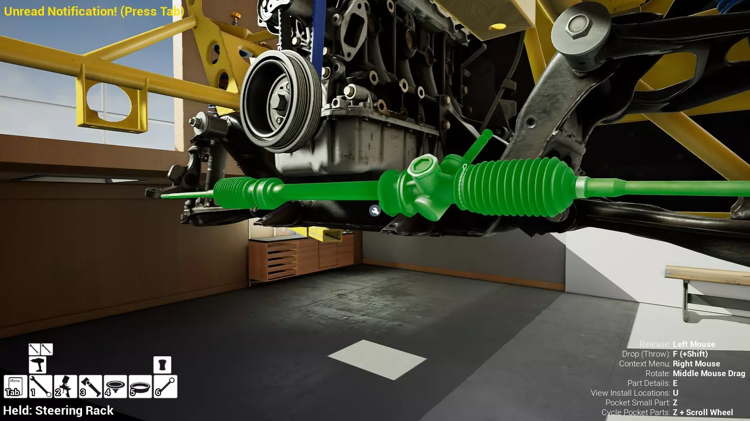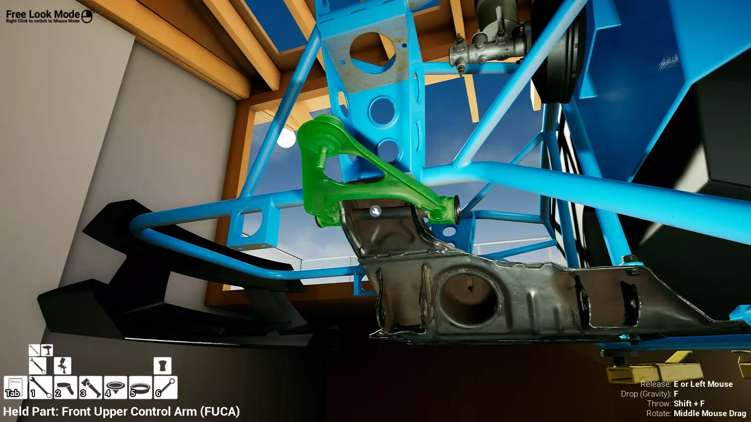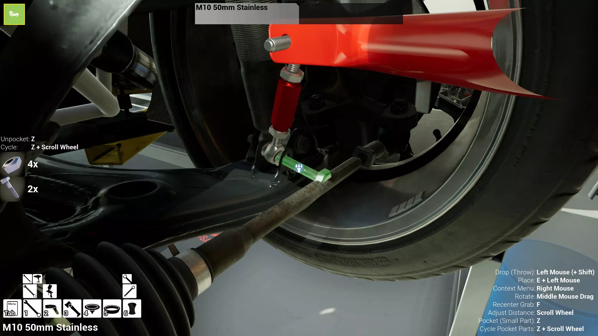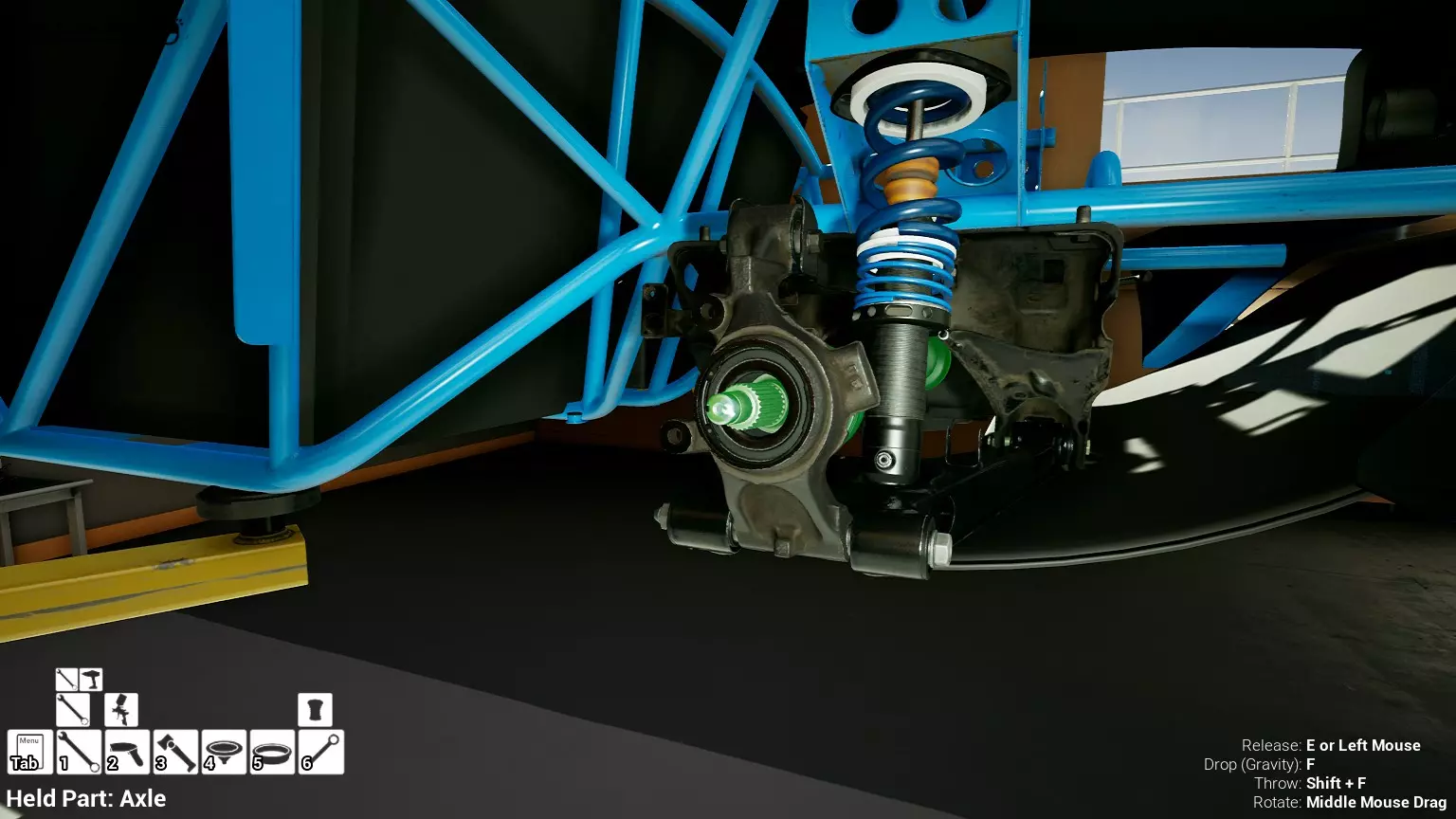 现已完全兼容141版本(2022年1月)。 本游戏处于不断变化和发展中,我一直在努力跟进并根据需要进行调整。由于开发者未提前通知,我只能通过反复试验来摸索。 不过请放心,我在将内容添加到本指南前,均已在游戏内亲自测试过所有内容,因此我确信撰写时信息是准确的。但除此之外,一切都可能随时发生变化。 请注意:游戏中并非所有可购买物品都是【磨损物品】,即它们在使用过程中不会累积磨损(至少目前不会)。 我是从一张完全空白的画布开始构建的,因此没有可重复使用的旧部件。不过,由于你很可能只是对现有的底盘进行全面检修,因此会有一些“非易损”部件可以重复使用,所以重复使用这些部件比购买新部件更合理。 因此,请仔细检查,确保你即将购买的部件确实是易损部件。你不会真的想把钱花在不需要更换的部件上。 本指南旨在帮助你从头开始构建整个底盘。 本指南不包括发动机和变速箱的安装与装配,这部分内容已在我创建的另一篇单独指南中涵盖。新的HUD系统会显示你正查看的部件,如果该部件有适用的扭矩设置,也会一并显示。 HUD现在还会列出你所查看物品的当前“磨损”程度,但这一功能仍在开发中,并非所有物品都会因使用而产生磨损。 至于旧扫描仪系统中曾有的安装说明,现在可以在独立的“手册”中找到,可通过平板电脑访问。 不过请注意,这些手册仍在完善中,因此部分内容可能存在误导。开发团队已意识到这一问题,并会及时更新和优化,但整个项目仅由两人负责,他们需要相应地优先安排时间和工作量。希望这部分内容没有让你感到过于枯燥,同时也希望它能帮助澄清一些玩家最近根据我收到的一些评论所遇到的问题。 感谢你抽出时间阅读这篇内容,也再次感谢你花时间阅读和使用这份指南。 你能购买自己的空机箱吗? 目前这个问题的简单答案是否定的。 开发者们在私下里讨论过这个问题,开发者和社区也在Discord上进行过讨论。 因此,这可能会在未来成为可用功能,但目前你还无法做到这一点。目前,最接近的方法是通过你的平板从【分类广告】中购买一辆汽车,然后自行将其拆解至只剩底盘。从这一步开始,你就可以随心所欲地对它进行操作了。 现在,底盘也不会产生任何磨损,所以无论你打算购买的汽车状况好坏,底盘都将始终保持完全相同的状态。 我只是觉得应该在这里提一下,因为这个问题经常出现。 当然,随着情况的变化,我会根据需要对这部分内容进行编辑或删除。 如何使用发动机支架和龙门吊。 这是最近很多人似乎都在纠结的问题,所以我想把这个添加到指南中。 发动机支架。你可以通过抓住支架顶部环绕着细长倒“U”形挂钩的半透明蓝色区域来升高或降低其高度,具体可参考下方截图。 当发动机放在支架上时,你还可以抓住覆盖着手柄的半透明蓝色区域,并朝着想要的方向旋转,以此来旋转发动机。你可以向任意方向旋转,且旋转的幅度没有限制。不过,本指南涵盖了整个底盘部分,包括副车架、悬架、转向系统、制动系统、车轮以及车身部件。 结合我已制作的发动机组装指南,你应该能够从头到尾打造出一整辆汽车。 我是在桌面模式下制作本指南的,因为我自己没有VR设备,所以无法保证所有信息对VR用户都100%准确。据我所知,VR模式与桌面模式的主要区别应该仅在于使用虚拟手操作而非鼠标点击,因此理论上其他所有信息都应该是通用的。如果我说错了,还请手下留情!在本指南中,我将使用全新的零件,因此如果你看到需要购买某个你已有的零件,你可以自行选择是重复使用旧零件还是购买新零件。 我决定使用全新零件,而非部分磨损的零件。这不仅能确保它们拥有最长的使用寿命,还能避免过早地再次经历零件拆卸和更换的过程。 作为参考,我所指的汽车左右两侧,是以驾驶员坐在车内并面向前方时的视角来确定的。即使你没有通读本指南,也请花点时间阅读我在末尾添加的题为【真实故事 - 引人深思】的部分。 这部分内容并非想让你对现实中自己动手修车望而却步,因为有些任务即使是新手,只要寻求并遵循专业建议和指导,也能相对轻松地完成。 不过,我想分享这个故事,是为了提醒大家,在进行维修工作时,哪怕是片刻的注意力不集中,都可能轻易演变成大麻烦。正如标题所示,这确实是一个真实的故事,引人深思。 那二三十秒的经历,我永生难忘。 在我们开始之前。需要注意的是,本指南的原始部分撰写于2019年初。从那以后,游戏和本指南都经历了多次变更,游戏内容有了大量新增和调整,本指南也相应地进行了补充和修改。让本指南一开始就引导你完成整个底盘的建造,似乎让一些新玩家感到些许困惑,他们可能在购买游戏前就阅读了本指南,或者刚购买游戏还没真正理解游戏的“运作”概念。此外,一些回归玩家可能也阅读过本指南,他们或许玩过游戏试玩版但从未购买,或者在游戏刚推出时就买了,却搁置了好几年,不了解游戏后续的发展,所以当他们最终重新进入游戏时,似乎也有些困惑。 那么我们就来澄清一下。 早在2018年12月,游戏首次在Steam抢先体验平台发布,以及2019年1月我首次撰写本指南时,玩家只需完成一些非常基础的工作,比如更换机油和轮胎,熟悉一下游戏的基本操作后,就可以完全拆解并重建自己的赛车,然后以“按场次”的方式将其出租。 这就是为什么本指南一