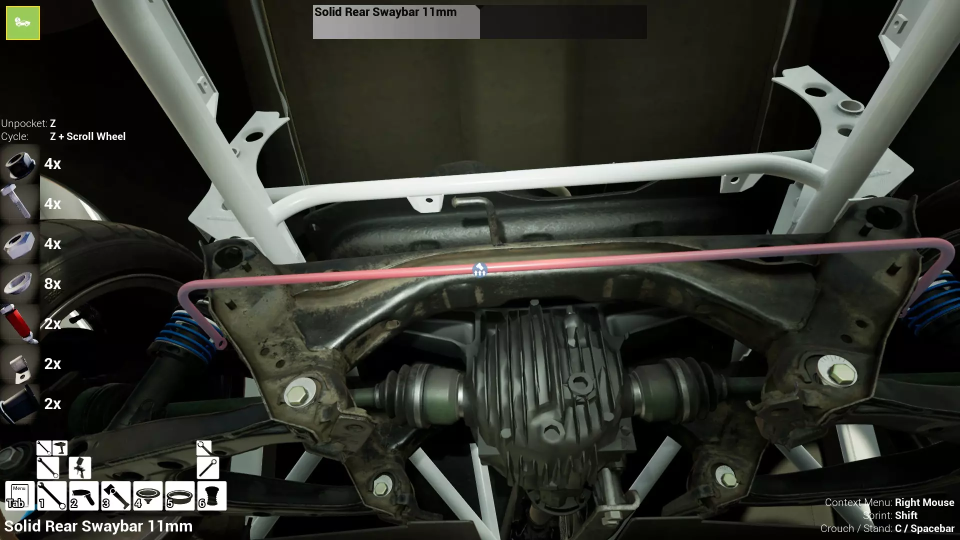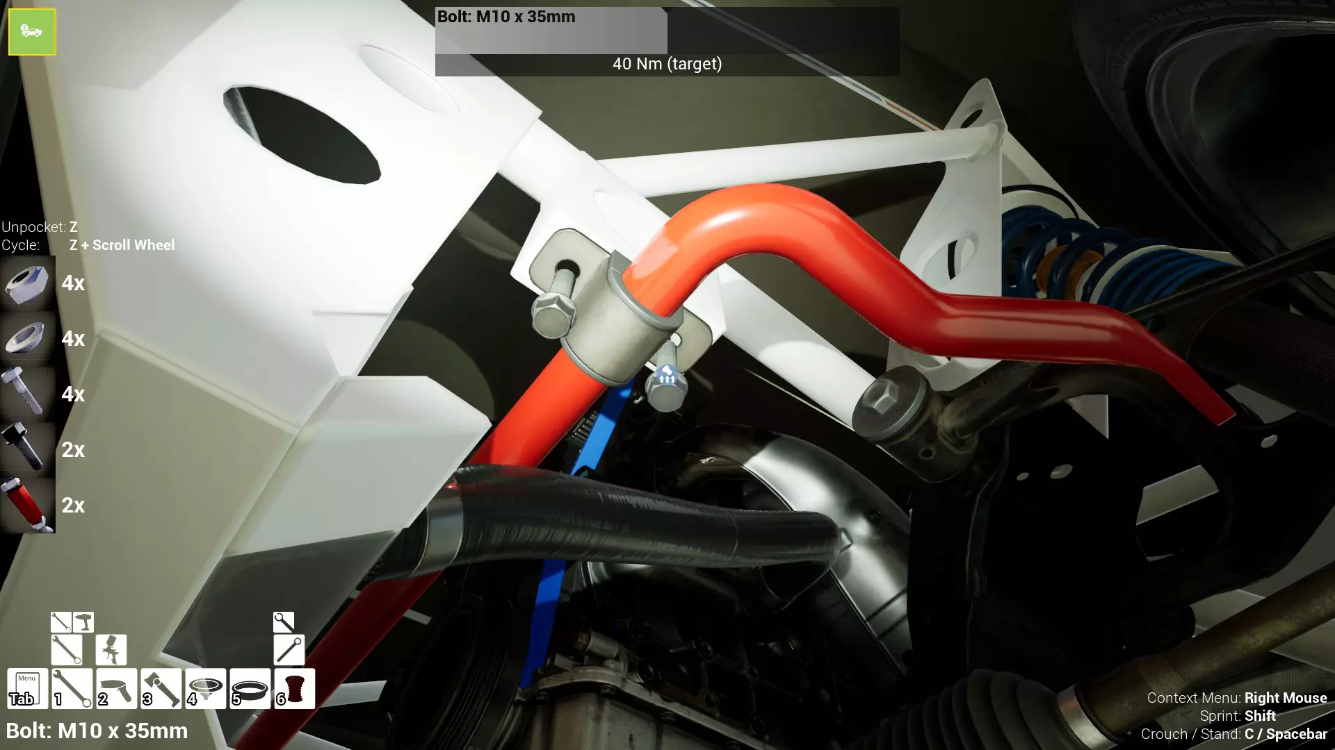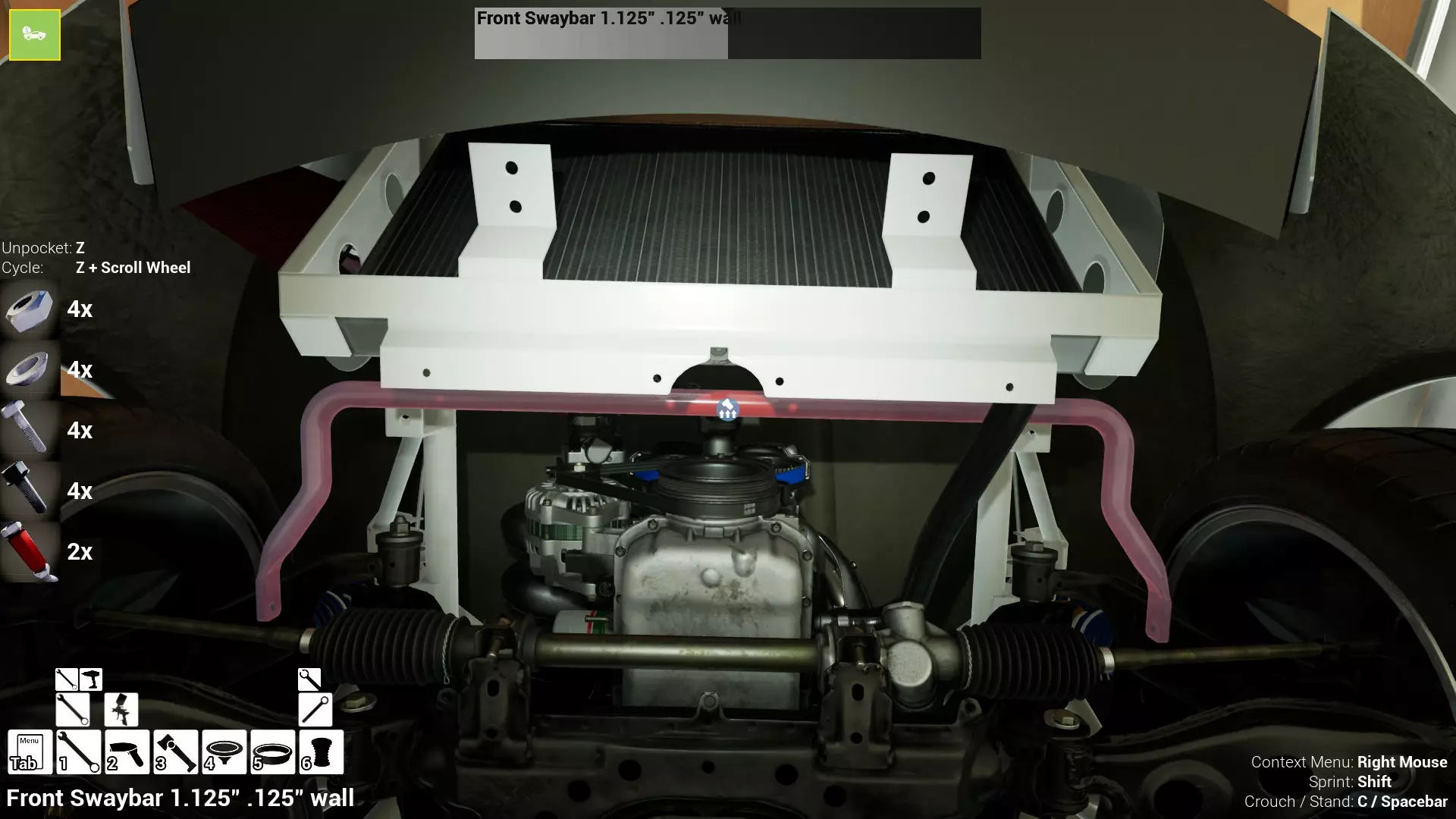 这次第一组数字是“2”。 第二组数字是“10”。 第三组数字是20%。 简单来说,就是在建议的10小时使用时长中,该部件已使用2小时,因此磨损度为20%。即2/10(20%)。 虽然第二组数字是建议值而非确定值,但为安全起见,理想情况下应将其视为确定值。 这个数值被认为是部件在保持安全工作状态下的最大使用时长。 它本质上是一个安全阈值,即赋予每个部件的数值,以确保其使用在安全范围内。 当然,你可以将每个部件的使用时长推到建议的最大时长(即100%)以上,而且可能暂时没问题……但这只是时间问题!零件磨损度达到100%并不意味着你下次使用时车辆会立即损坏,但零件发生故障的风险会增加,而且你使用得越频繁,风险就越大。 我还需要指出,即使某个零件的“预期”使用寿命为100小时,也不代表它一定会持续使用100小时。 就像在现实生活中一样,有时候东西会提前损坏。 这种情况在游戏中也可能发生。虽然看起来很罕见,但确实有可能出现。 另外需要说明的是,车辆不使用时,所有零件都不会产生磨损。 只有当车辆在赛道上行驶时,零件才会累积磨损。 所以零件可以无限期地存放在仓库、你的 workshop 或赛车拖车里,完全不会老化。这种磨损纯粹只发生在零件安装在车辆上,并且车辆正在积极比赛和行驶的过程中。 总结一下: 理想情况下,你应该将“磨损度”视为“使用小时数”,同时要记住“磨损度”实际上代表的是“零件预期使用寿命的百分比”,而不是“零件实际损坏或接近损坏的程度”。 所以为了安全起见,保持磨损度在100%以下,你应该就不会有问题。超过100%,你就开始冒险了。你越是超出这个数值,风险就越大。究竟要冒多大的风险,完全由你自己决定! 闲聊到此为止。让我们开始造车吧! 好了,既然这些都说清楚了,我们来着手处理底盘,好吗? 副车架,包括前副车架和后副车架。在本指南中,我将假设我们是从零开始,需要先购买所有组件,然后才能进行安装。 如果你愿意,可以使用现有的旧零件,但这样做意味着它们的使用寿命会比新购买的零件短。我将把这个决定完全交给你。 为了保持一致性,我会先从汽车的左侧(驾驶座一侧)开始,介绍那里的零件和操作步骤,而右侧(乘客座一侧)只列出所需零件,除非两侧有不同的操作步骤或零件需求。我非常确定右侧在各个方面都只是左侧的镜像,但如果存在差异,我会记录并指出。 我通常也会先处理汽车的前端,然后再处理后端。 好了,言归正传,让我们开始吧! 首先购买以下部件: 1个前副车架 1个后副车架 8个前副车架螺栓 将前副车架放置在底盘下方的位置。 将四个前副车架螺栓安装到位,车辆左侧两个,右侧两个,然后将它们全部拧紧至50牛米。